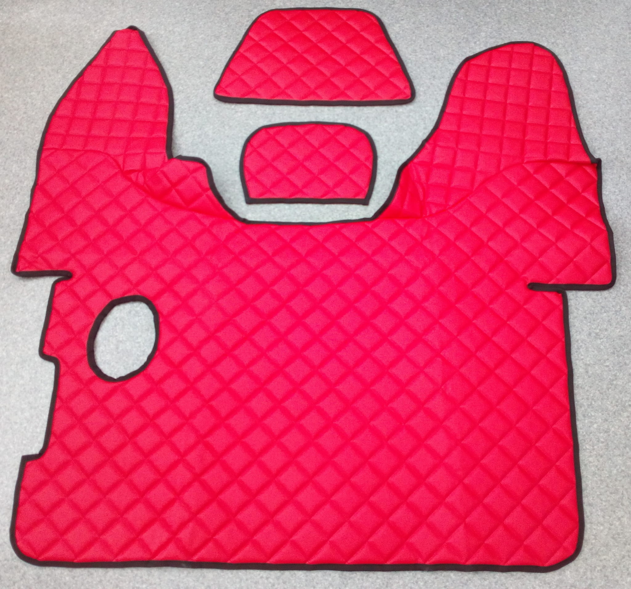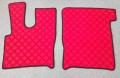 Dywaniki dedykowane są do samochodu cieżarowego marki Daf XF 106 produkowanego do roku 2018, ersja z manualną skrzynią biegów. Wykonane są z pikowanej ekoskóry w kolorze czerwonym. Obszycie w kolorze czarnym. Komplet skłąda się z 5 części: tunel, 2 części pod nogi oraz 2 maty na półeczki.