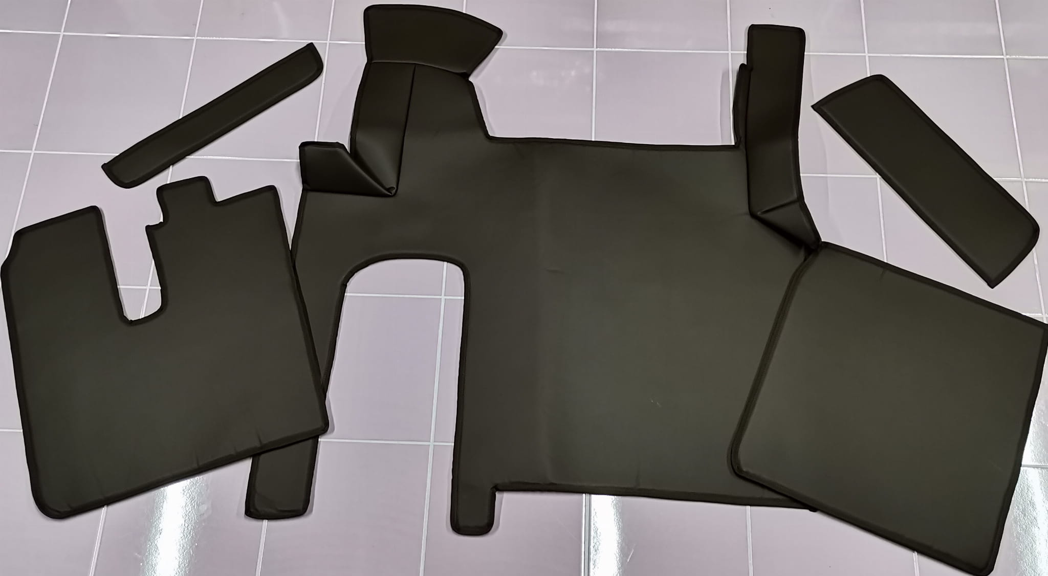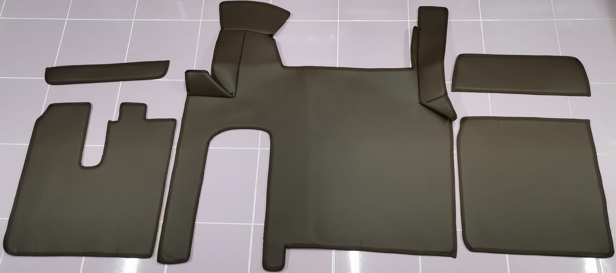 Wykonane są z gładkiej ekoskóry w kolorze ciemno brązowym z obszyciem w tym samym kolorze. Dywaniki składają się z 5 części: tunel, 2 części pod nogi, 2 maty na półeczki.