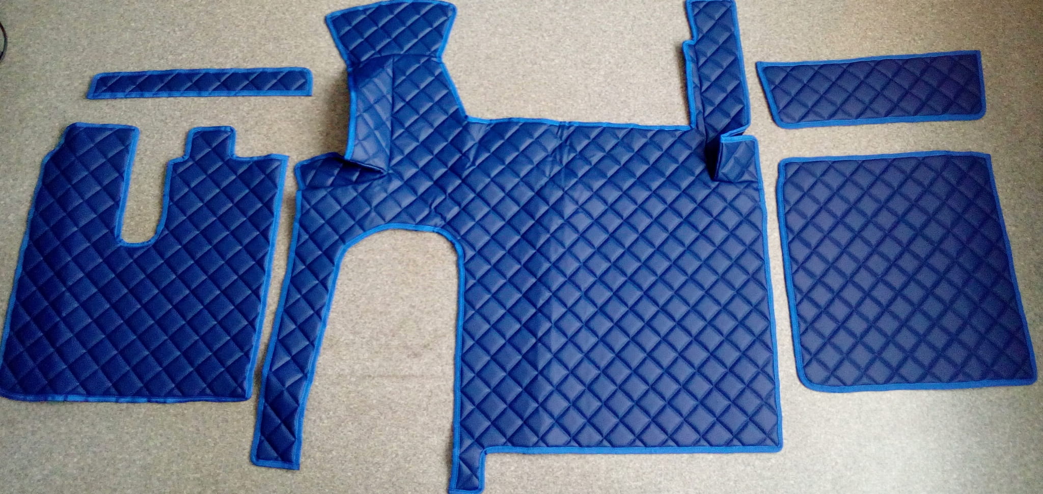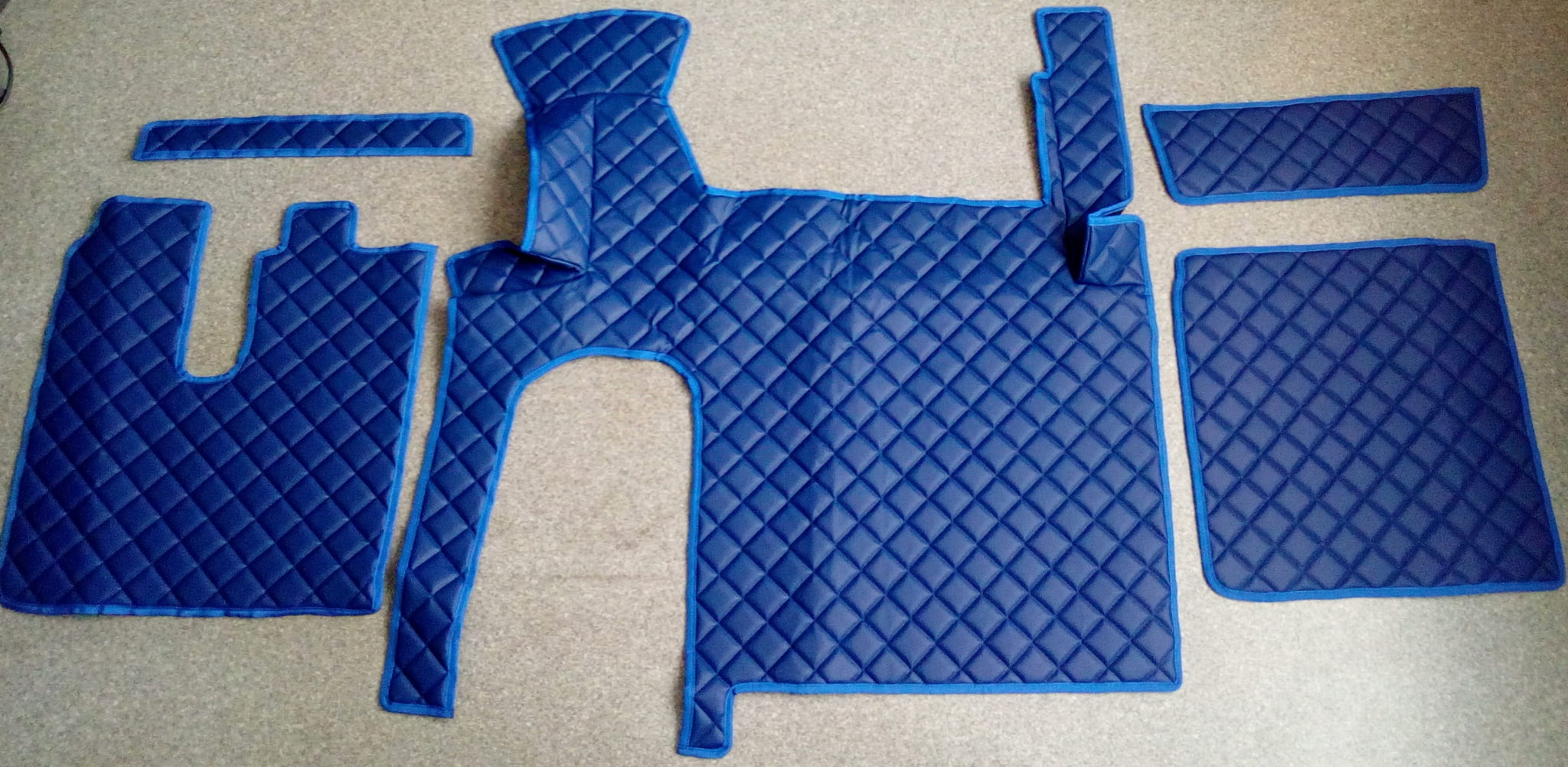 Wykonane są z pikowanej ekoskóry w kolorze ciemno niebieskim z obszyciem w tym samym kolorze. Dywaniki składają się z 5 części: tunel, 2 części pod nogi, 2 maty na półeczki.