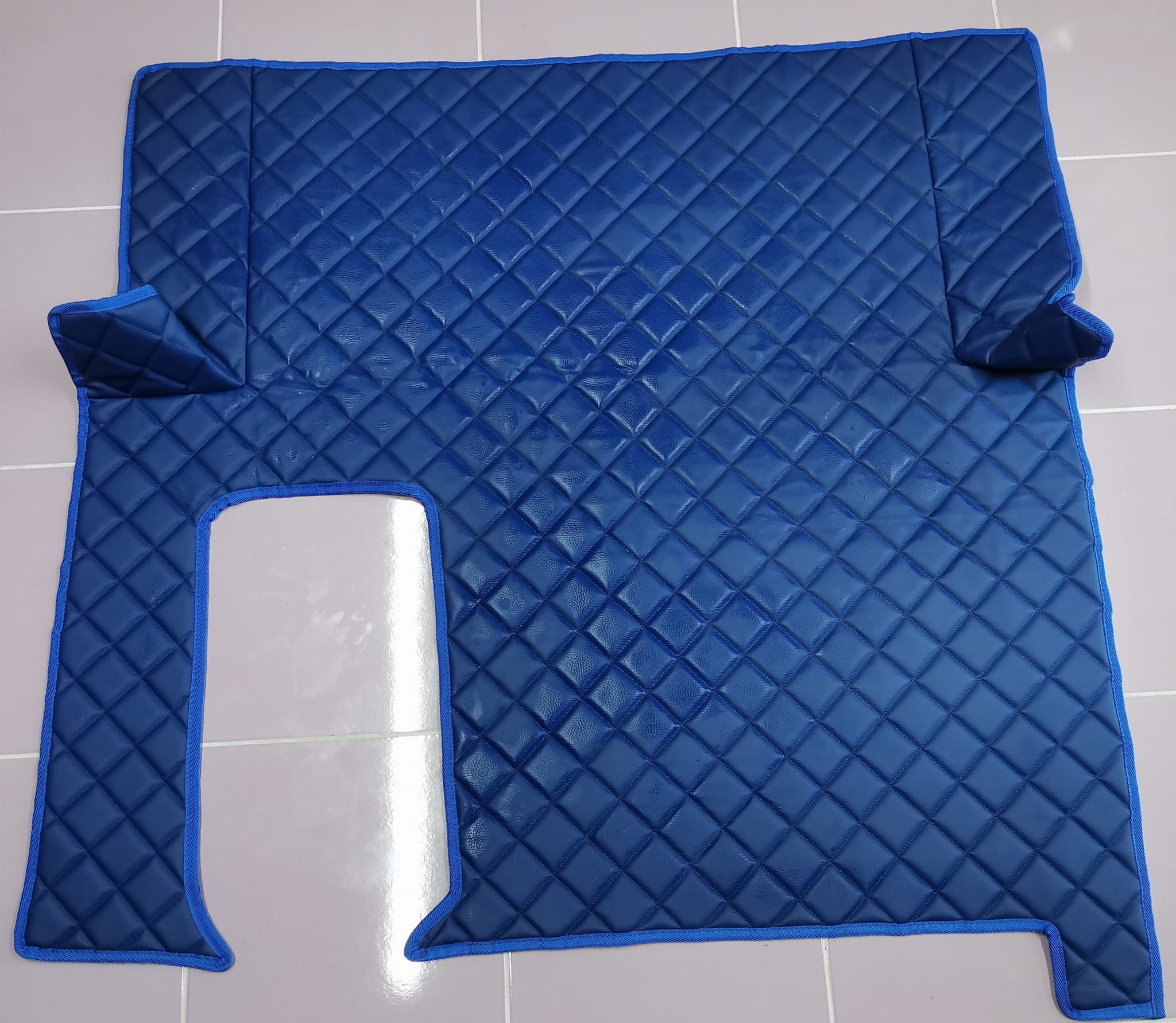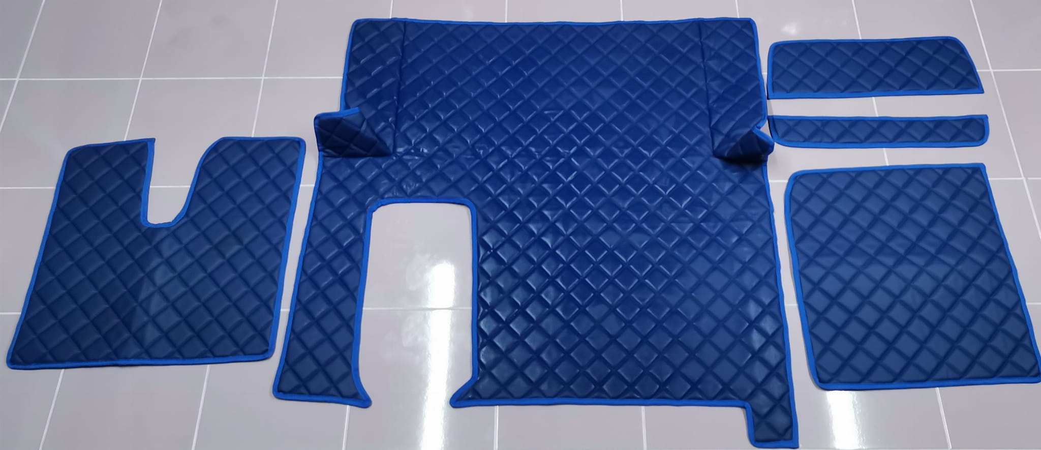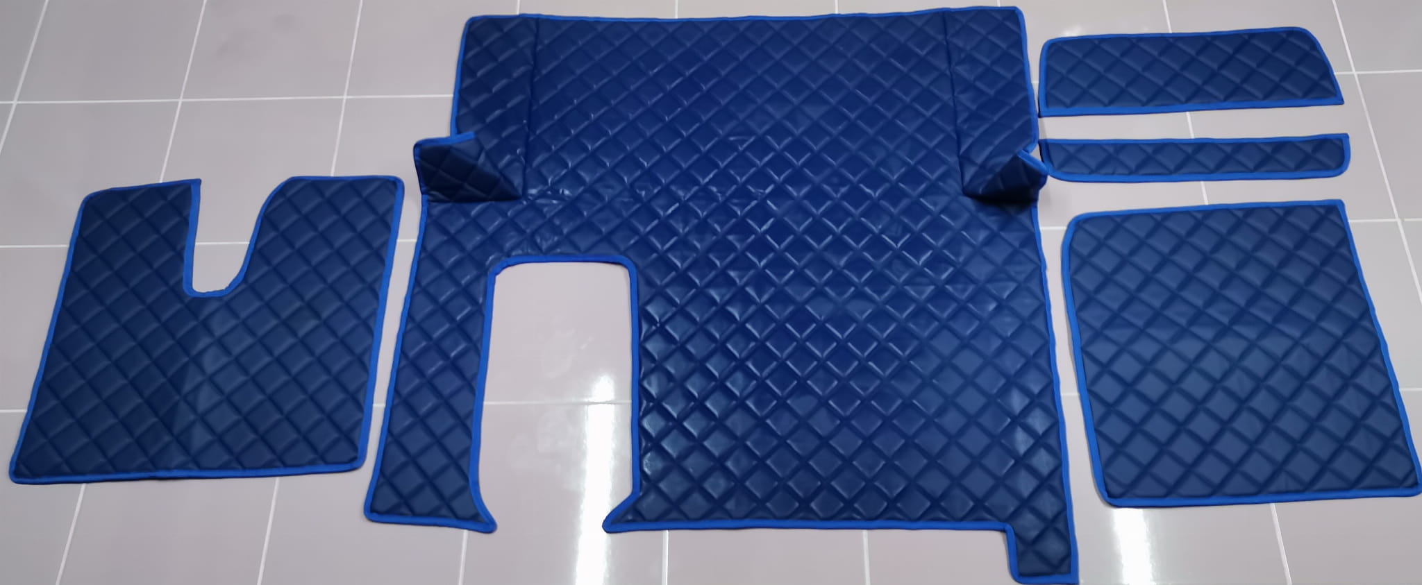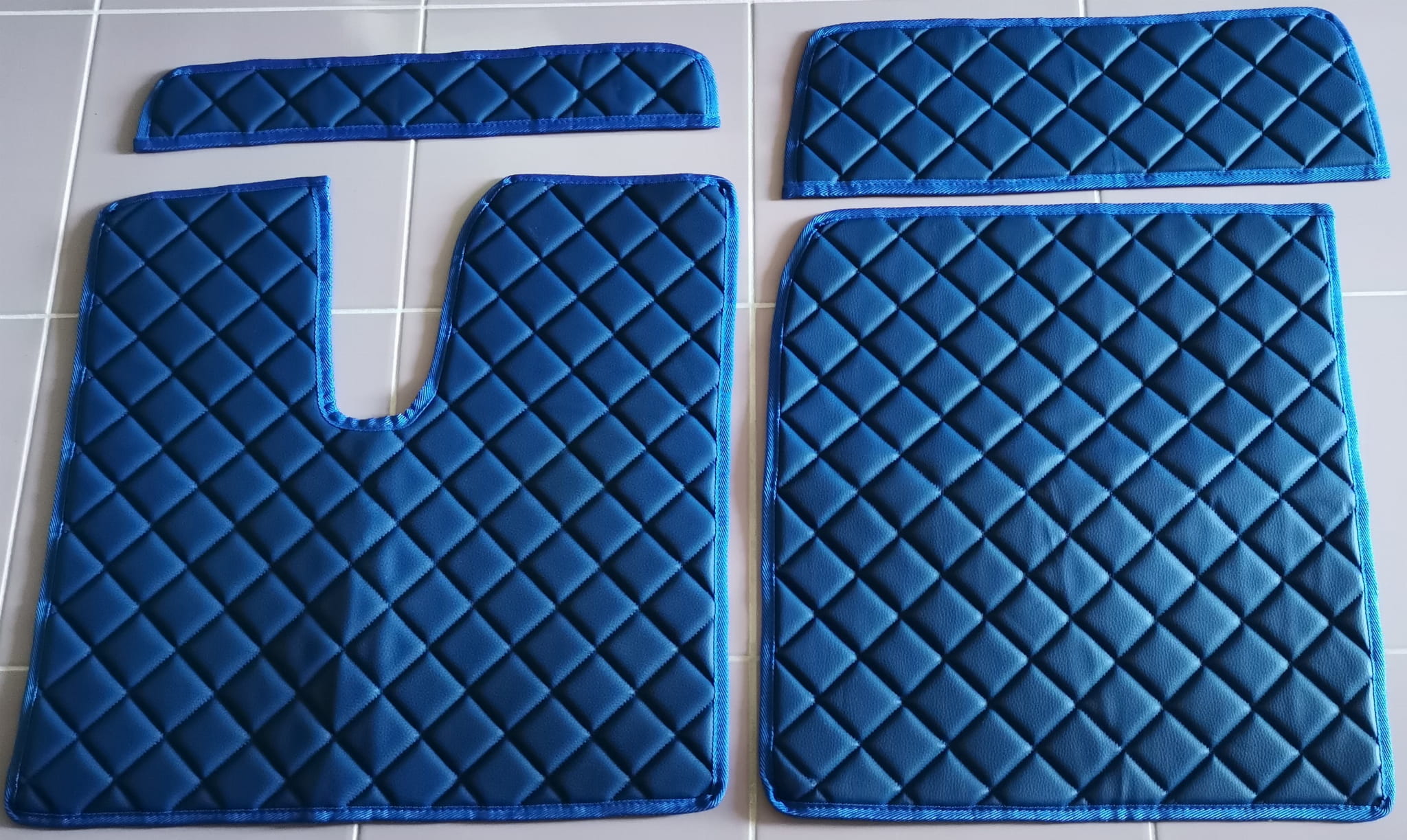 Wykonane są z pikowanej ekoskóry w kolorze ciemno niebieskim z obszyciem w tym samym kolorze. Dywaniki składają się z 5 części: tunel, 2 części pod nogi, 2 maty na półeczki.
