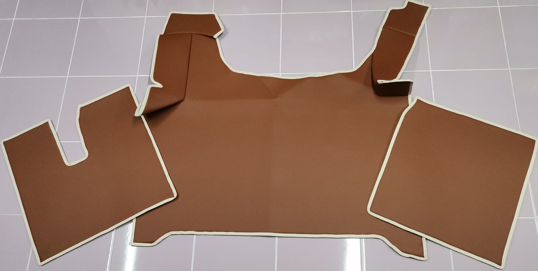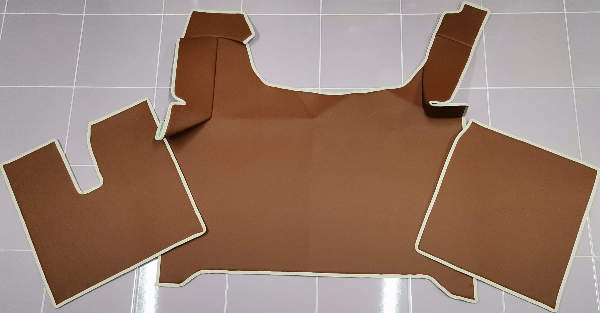 Wykonane są z gładkiej ekoskóry w kolorze jasno brązowym z obszyciem w kolorze beżowym. Dywaniki składają się z 3 części: tunel, 2 części pod nogi.