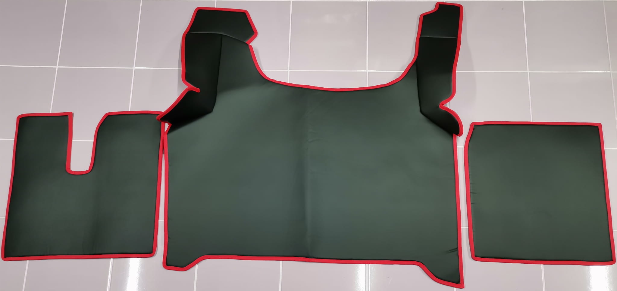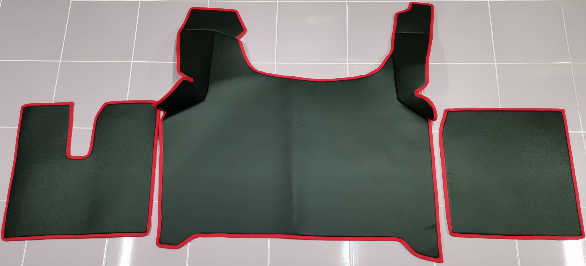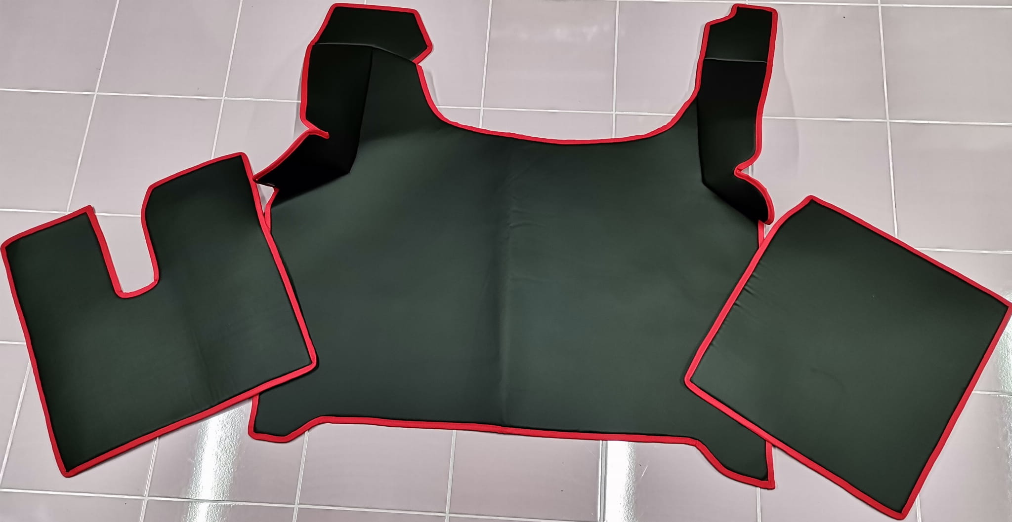 Wykonane są z gładkiej ekoskóry w kolorze czarnym z obszyciem w kolorze czerwonym. Dywaniki składają się z 3 części: tunel, 2 części pod nogi.