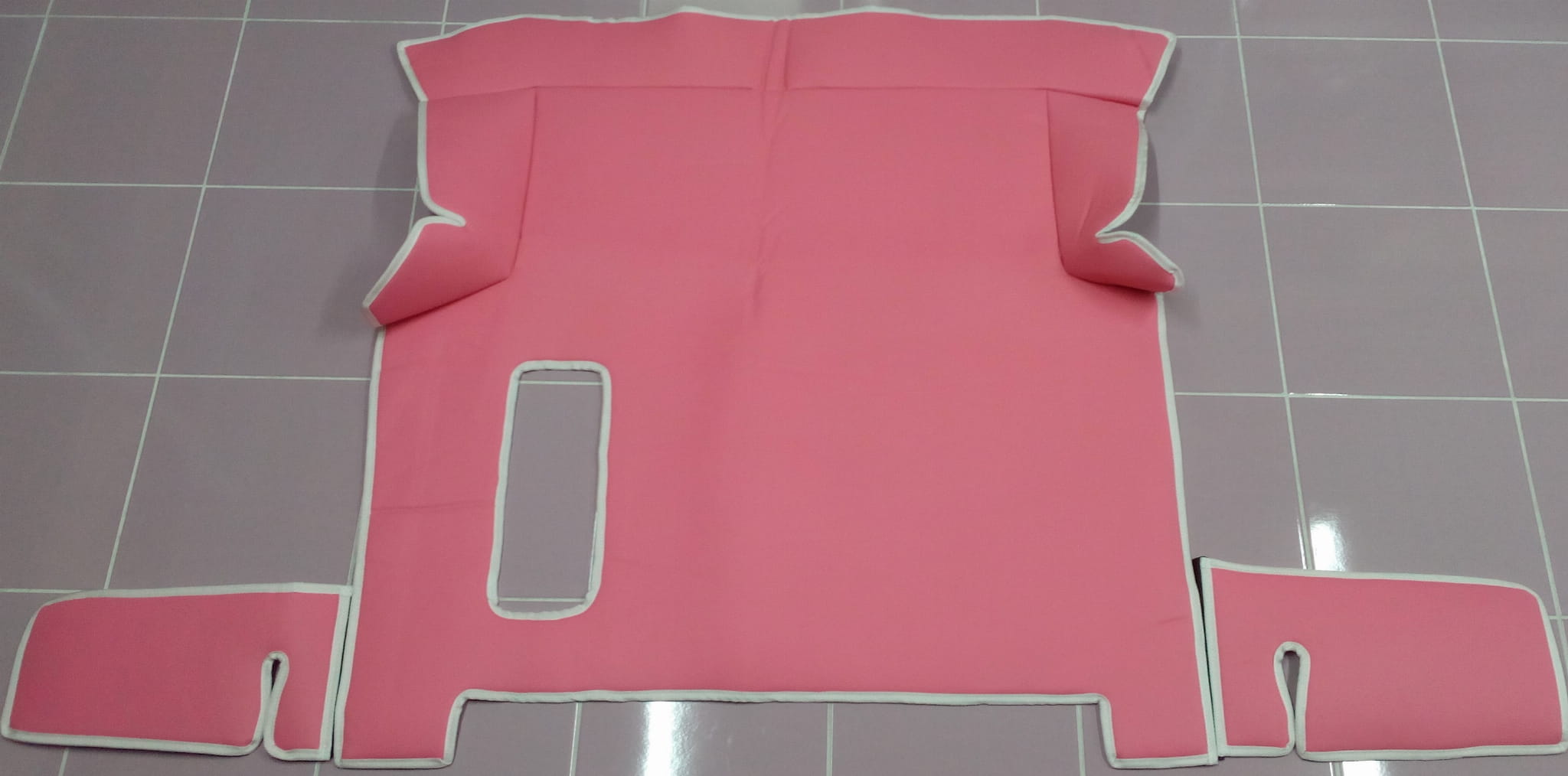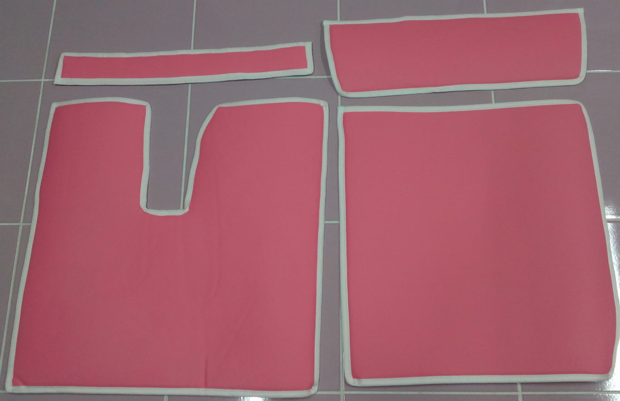 Wykonane są z gładkiej ekoskóry w kolorze różowym z obszyciem w kolorze białym. Dywaniki składają się z 5 części: tunel, 2 części pod nogi, 2 maty na półeczki.
