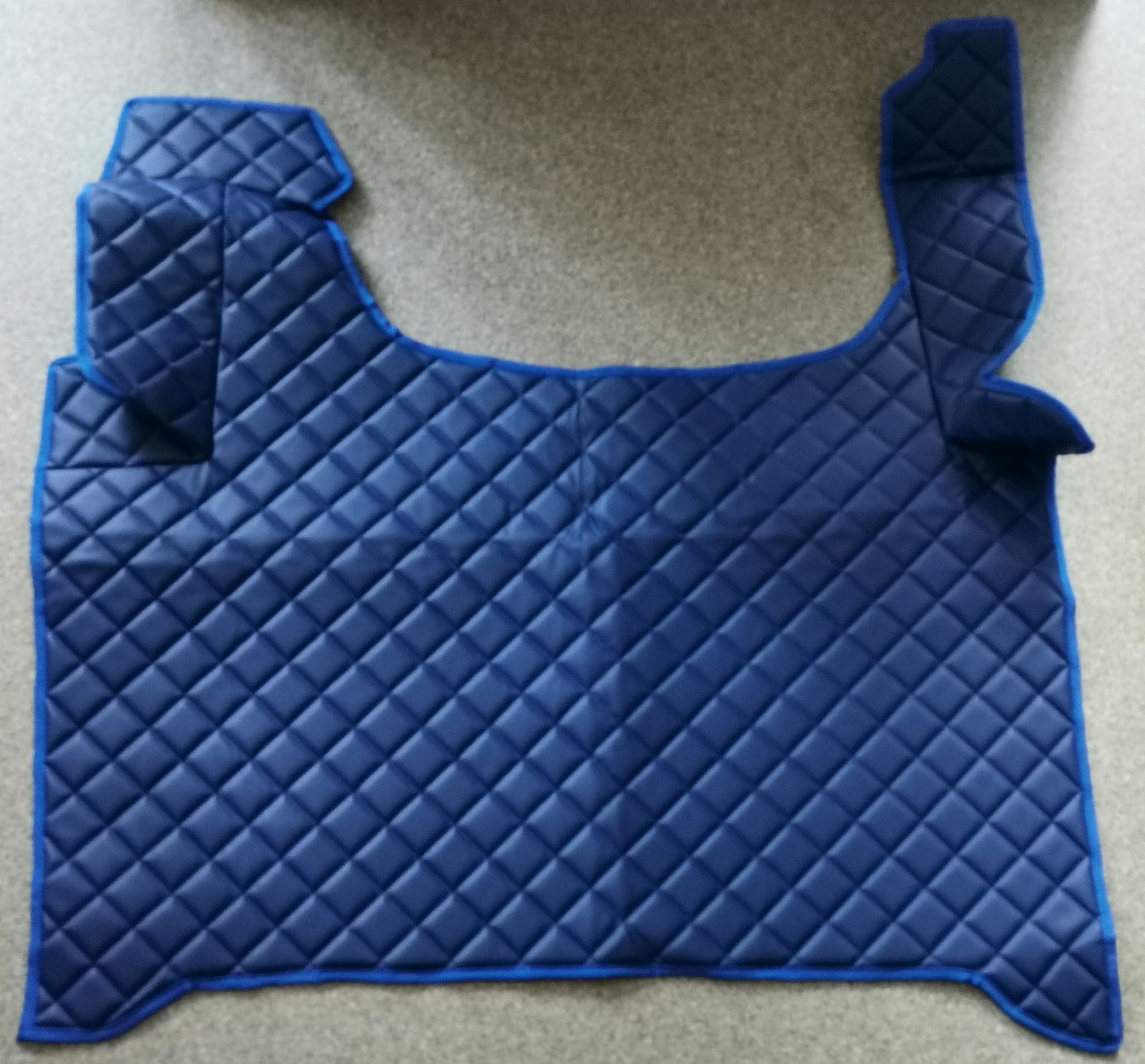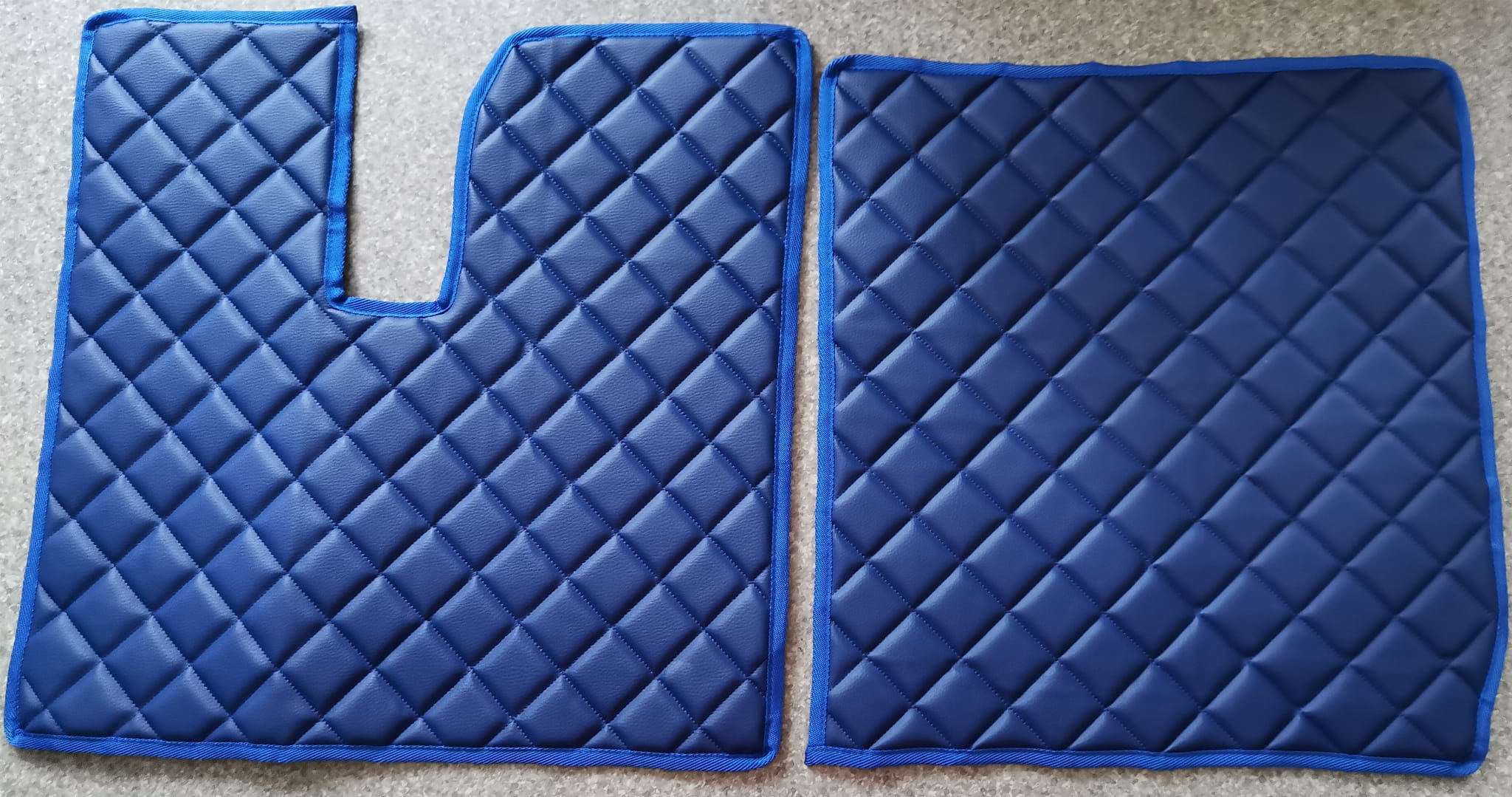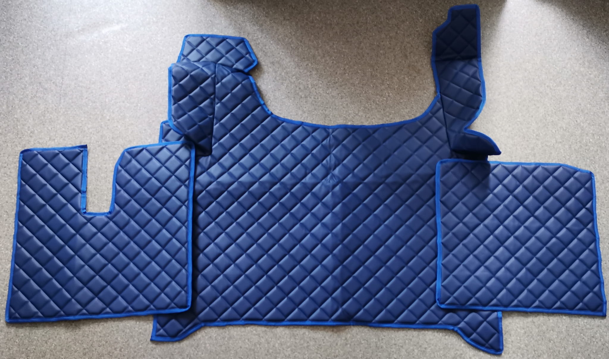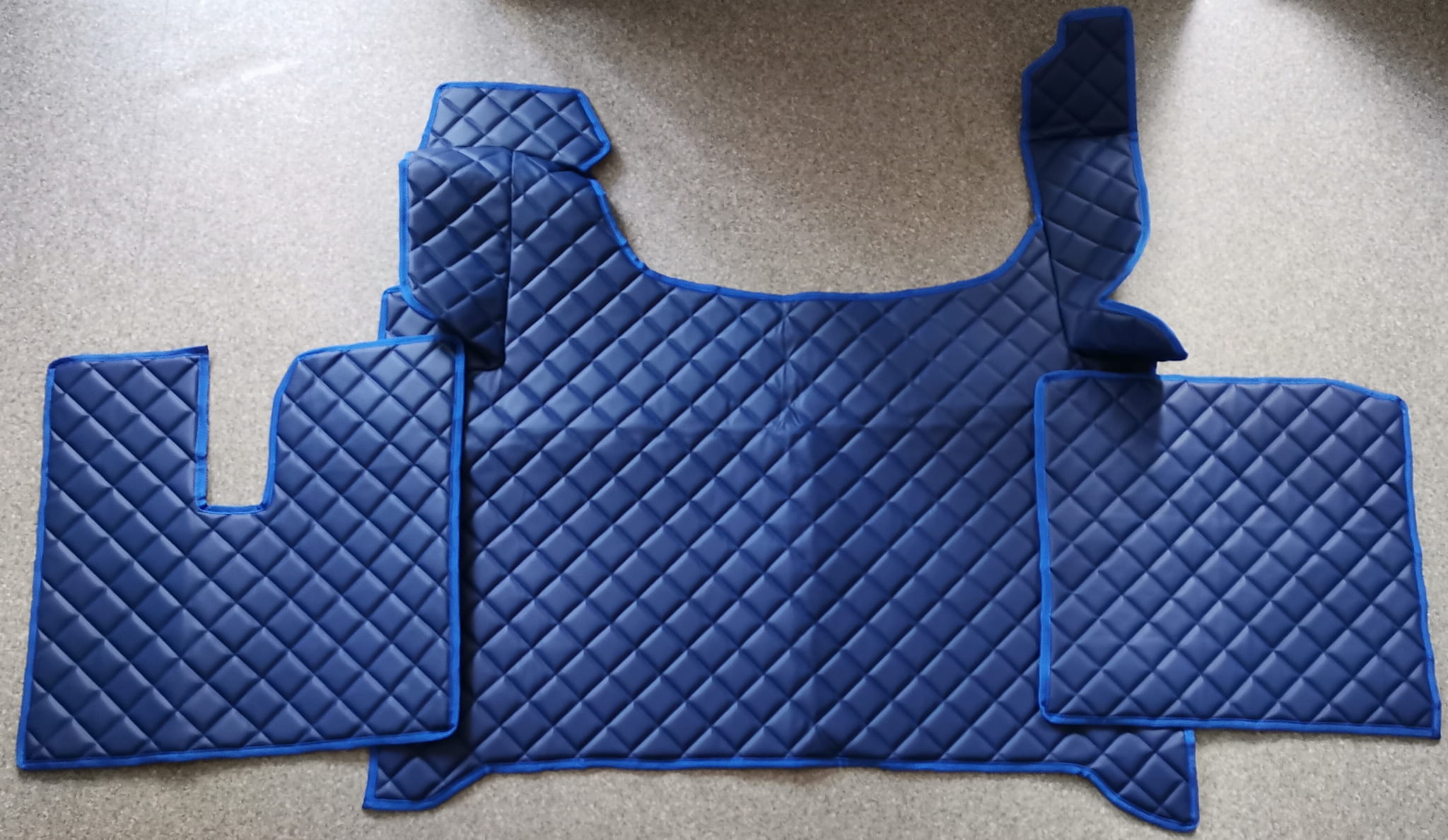 Wykonane są z pikowanej ekoskóry w kolorze ciemno niebieskim z obszyciem w identycznym kolorze. Dywaniki składają się z 3 części: tunel, 2 części pod nogi.