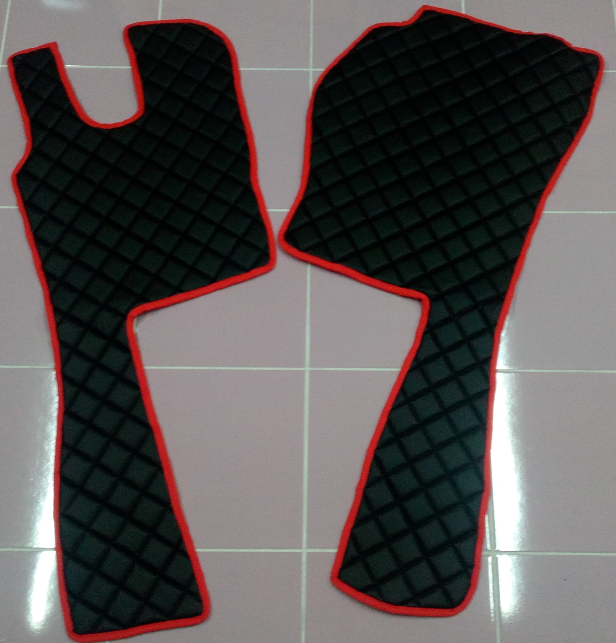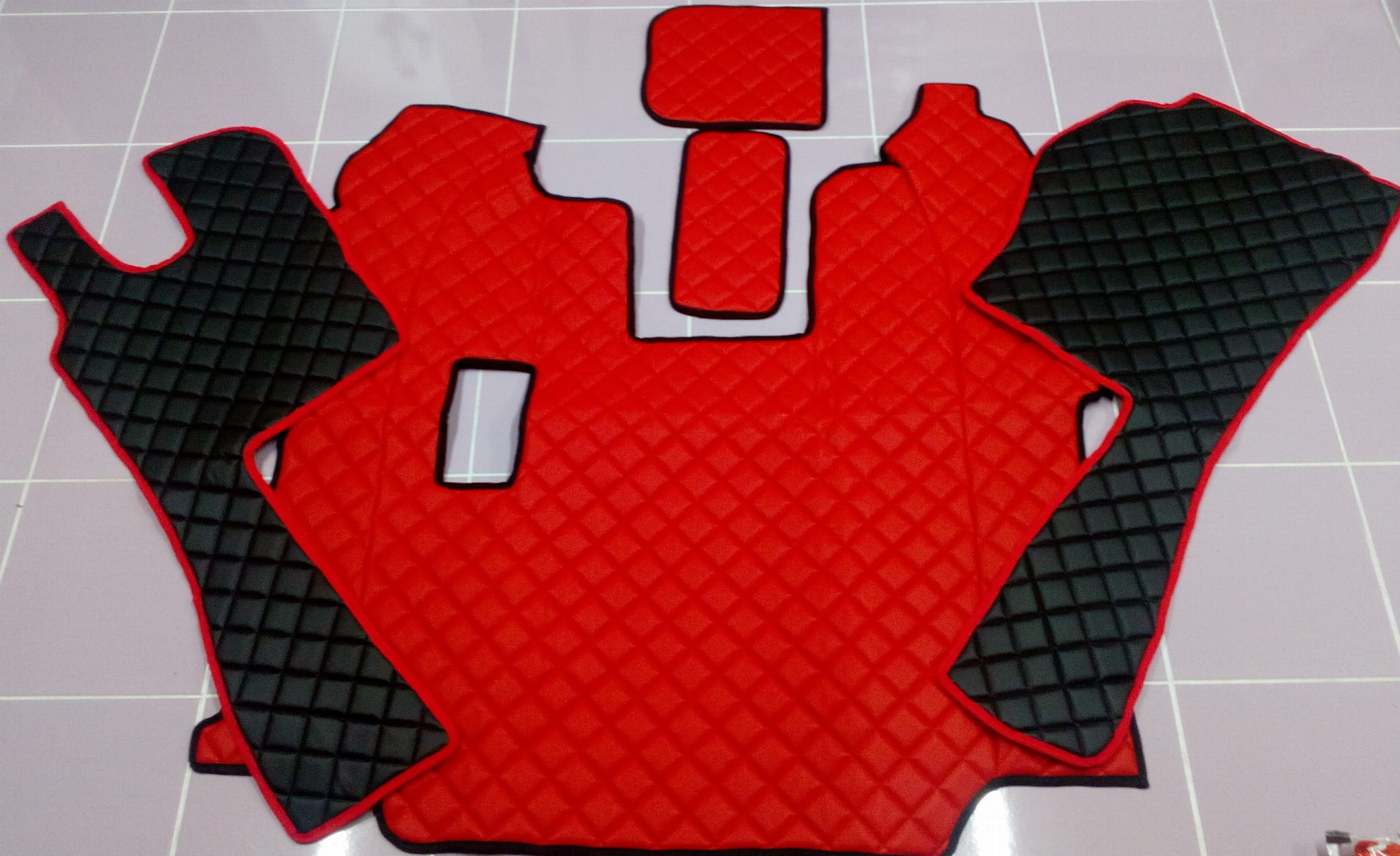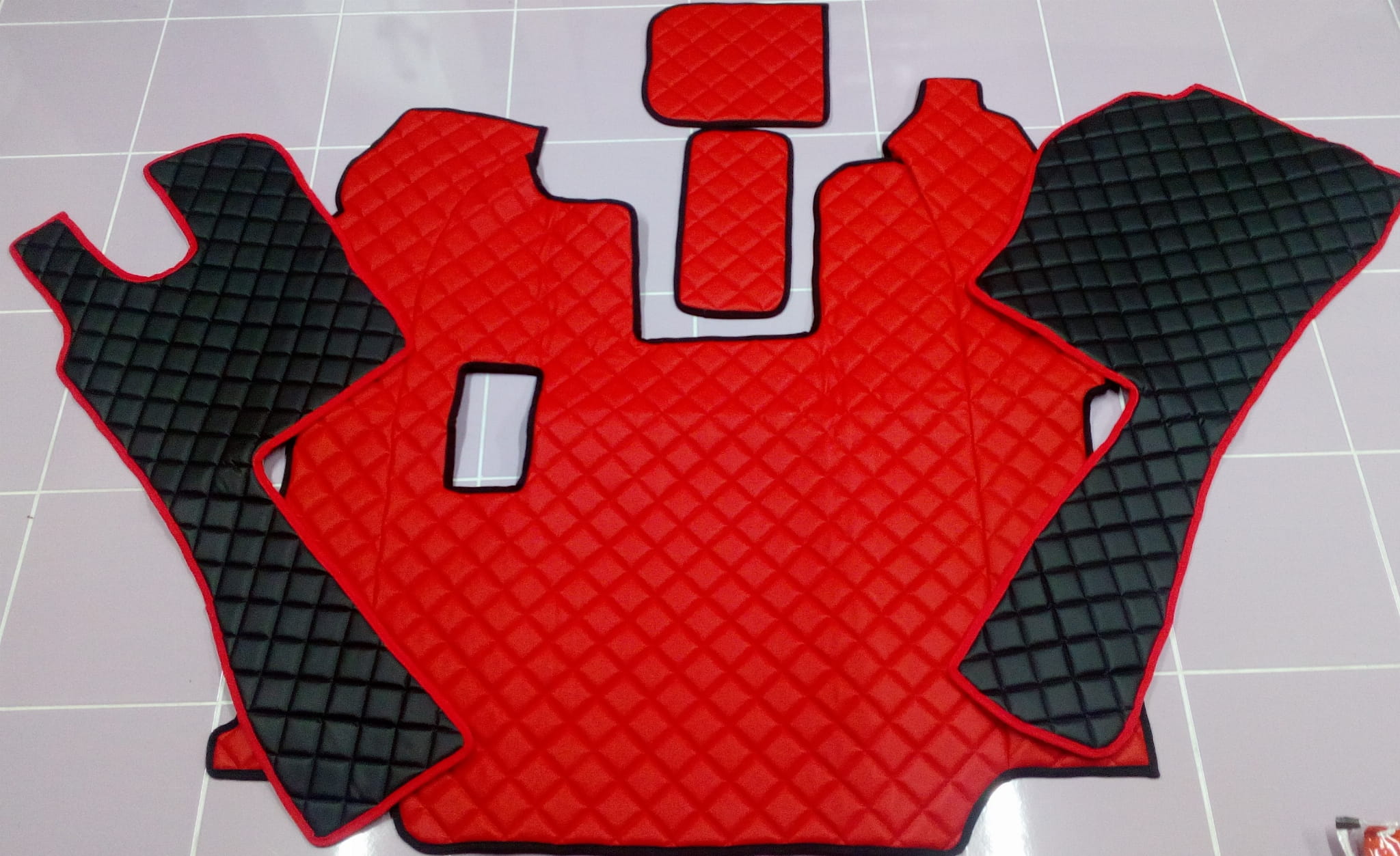 Wykonane są z pikowanej ekoskóry, w kombinacji czarno-czerwonej. Dywaniki składają się z 5 części: tunel, 2 części pod nogi, 2 maty na półeczki.