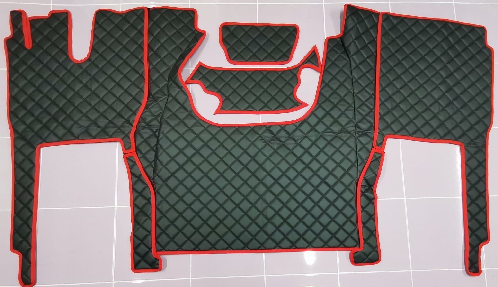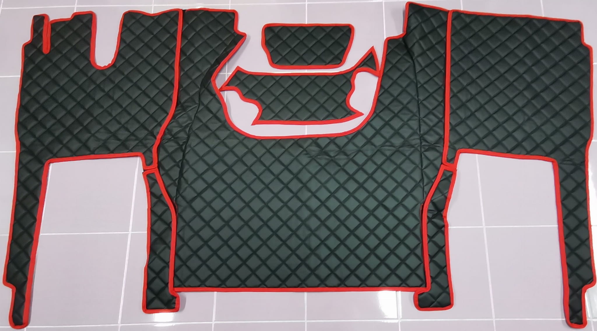 Dywaniki dedykowane są do najnowszego samochodu ciężarowego Iveco, model S-WAY, wersja z automatyczną skrzynią biegów. Wykonane są z pikowanej ekoskóry w kolorze czarnym, z obszyciem w kolorze czerwonym. Komplet składa się z 5 części: tunel, 2 części pod nogi, 2 maty na półeczki. Dywanik tworzy jedną całość ponieważ części składowe są połączone ze sobą za pomocą rzepów.