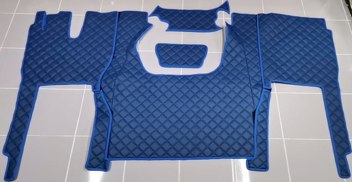 Dywaniki dedykowane są do najnowszego samochodu ciężarowego Iveco, model S-WAY, wersja z automatyczną skrzynią biegów. Wykonane są z pikowanej ekoskóry w kolorze niebieskim z obszyciem w identycznym kolorze. Komplet składa się z 5 części: tunel, 2 części pod nogi, 2 maty na półeczki. Dywanik tworzy jedną całość ponieważ części składowe są połączone ze sobą za pomocą rzepów.