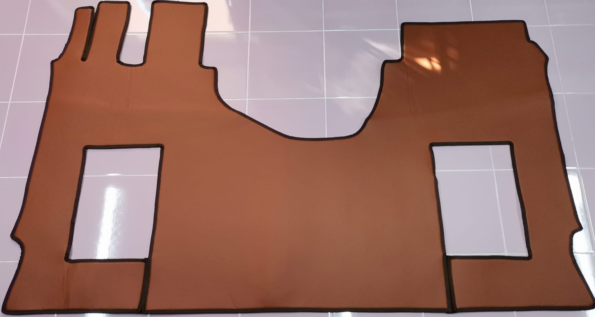 Wykonane są z gładkiej ekoskóry w kolorze jasno brązowym z czarnym obszyciem. Dywaniki wykonane są z jednego kawałka ekoskóry.
