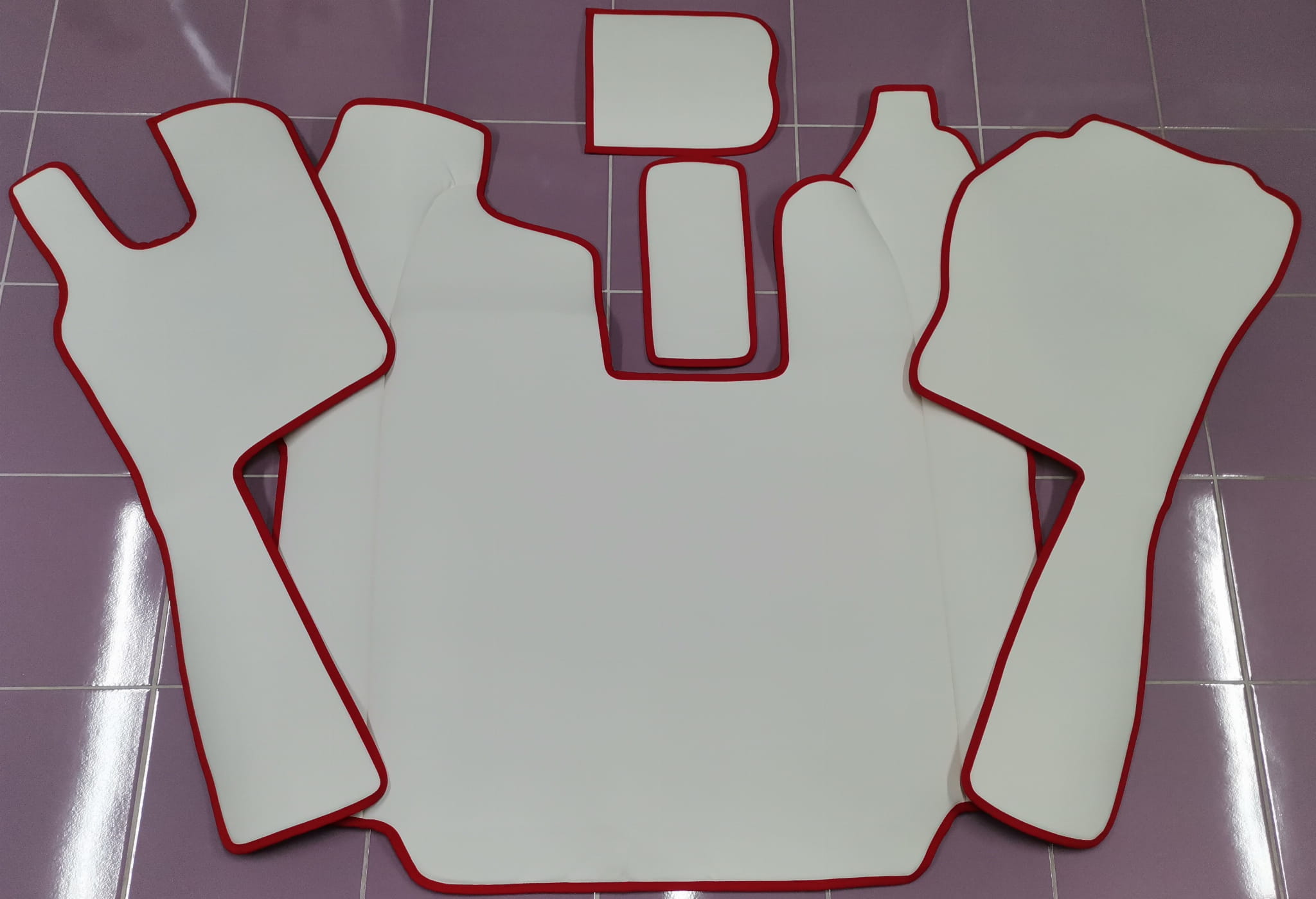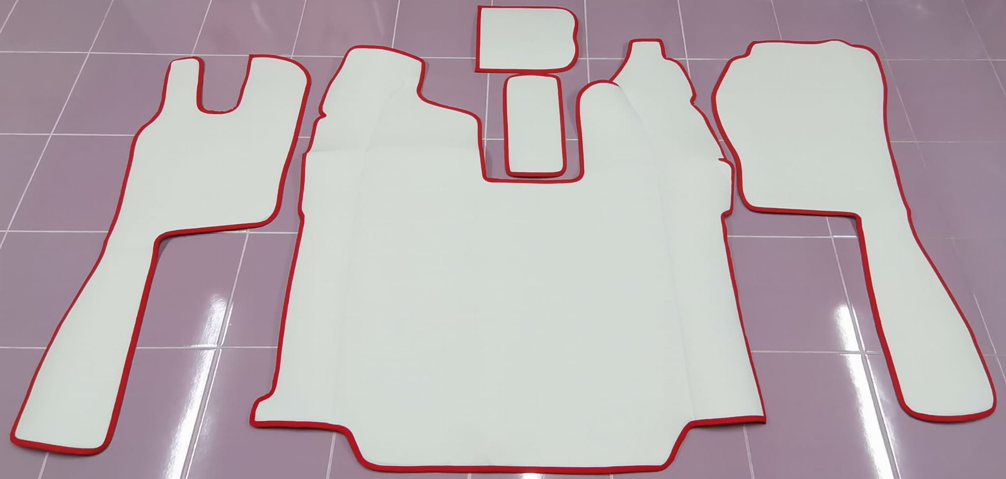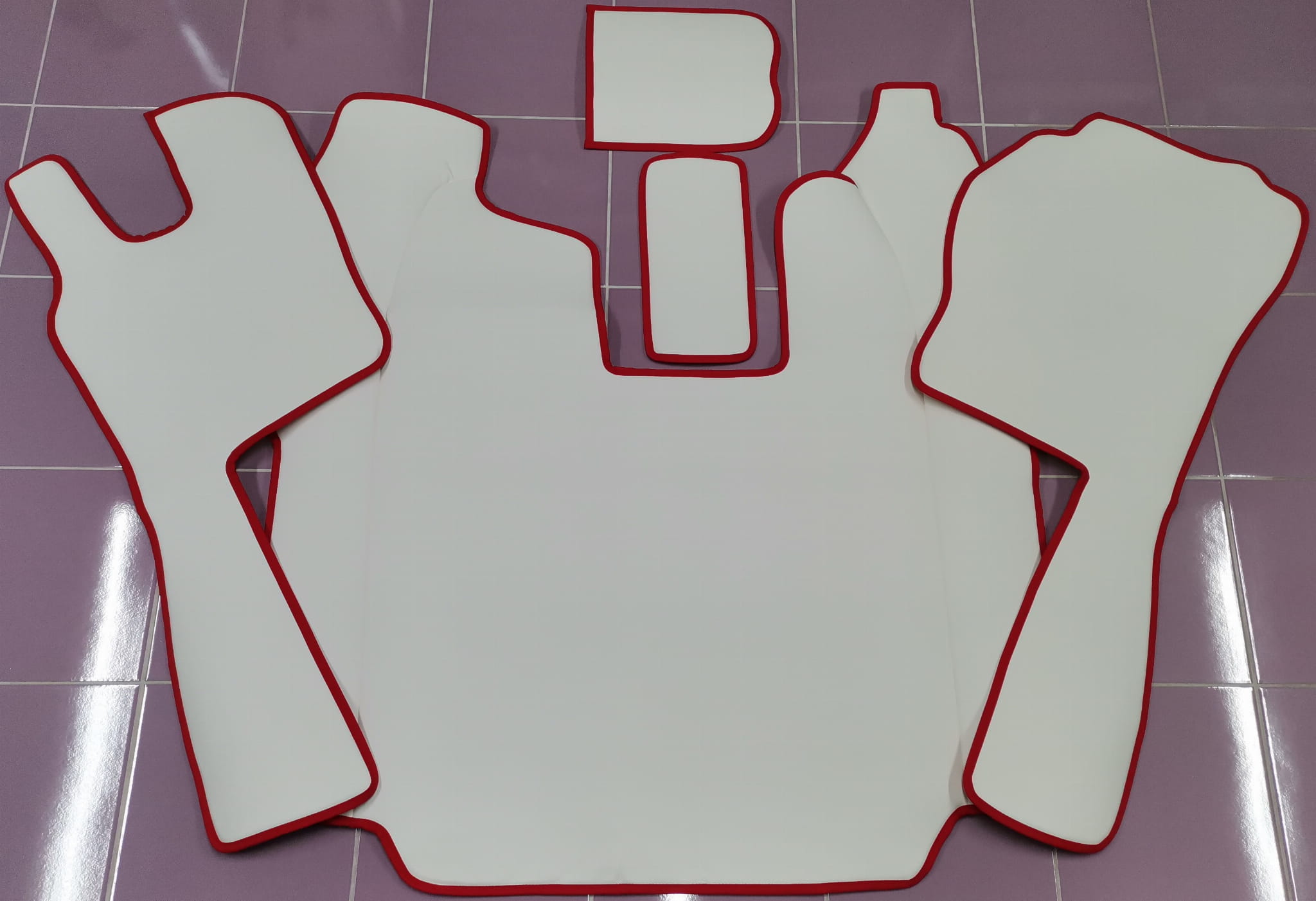 Wykonane są z gładkiej białej ekoskóry z obszyciem w kolorze czerwonym. Dywaniki składają się z 5 części: tunel, 2 części pod nogi, 2 maty na półeczki.