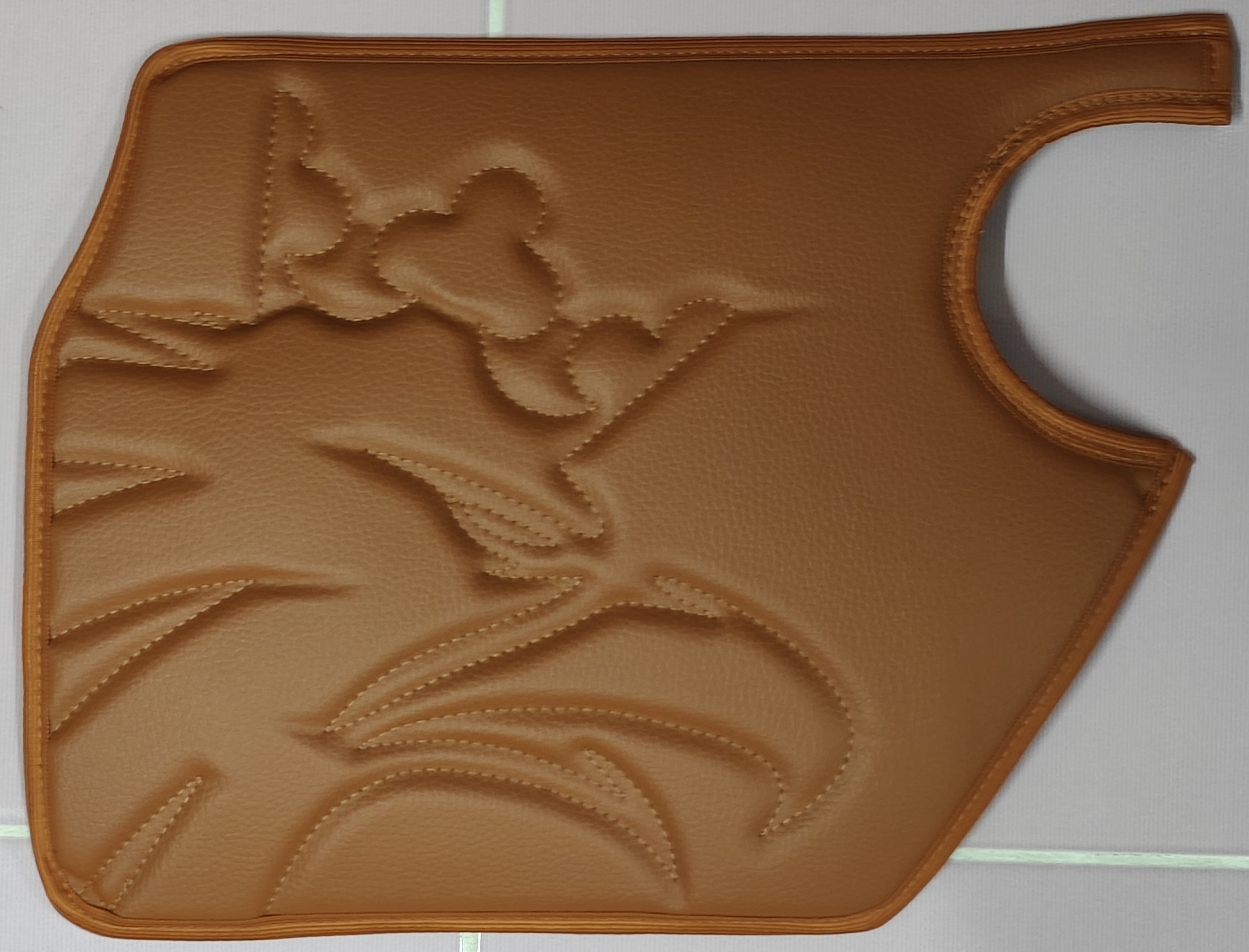 Dywaniki wykonane z jasno brązowej ekoskóry, naszyte wzory identycznym kolorze, obszycie jasno brązowe.