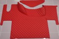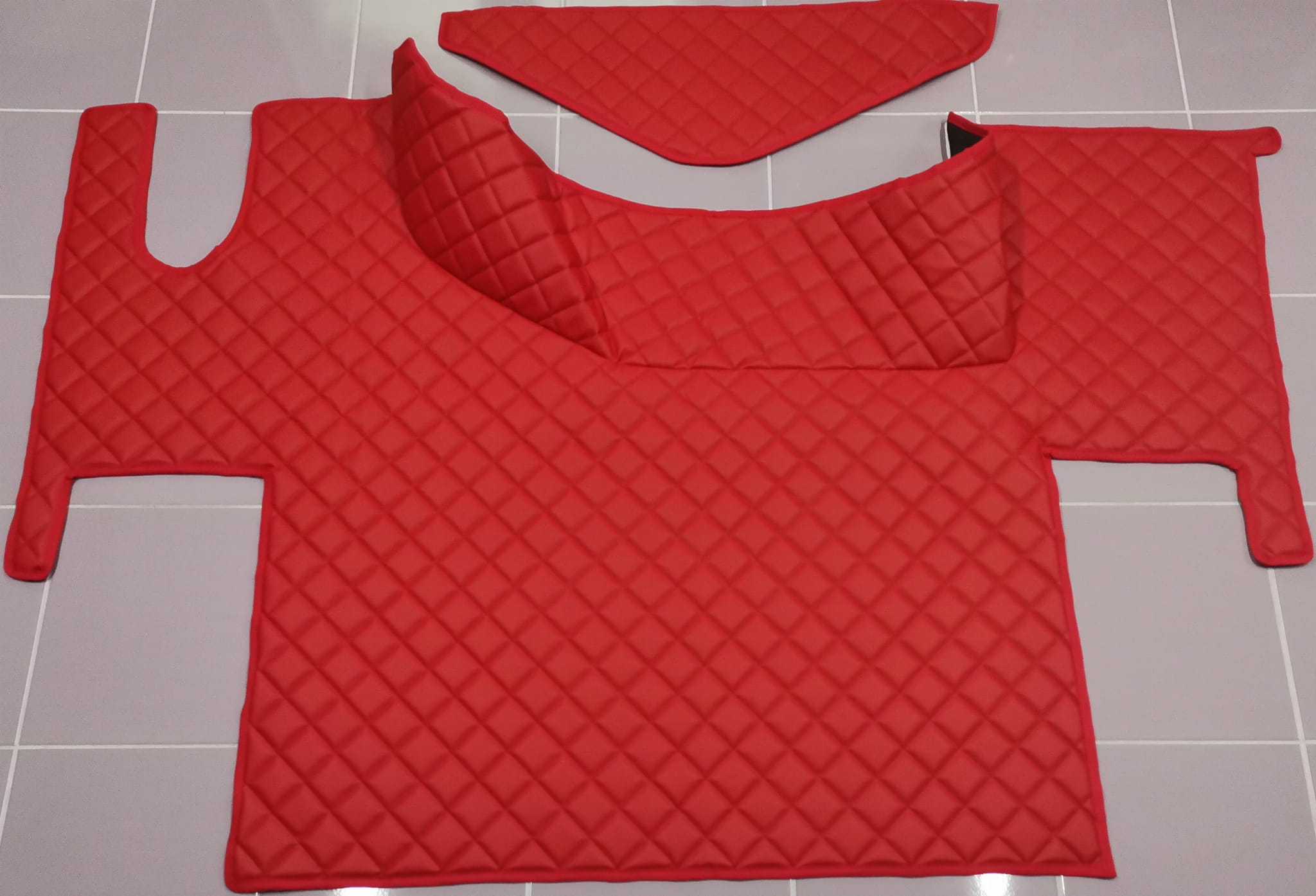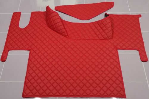 Dywaniki dedykowane do samochodu ciężarowego Renault gama T z płaską podłogą (bez wysokiego tunelu). Dywaniki wykonane są z pikowanej czerwonej ekoskóry z czerwonym obszyciem.