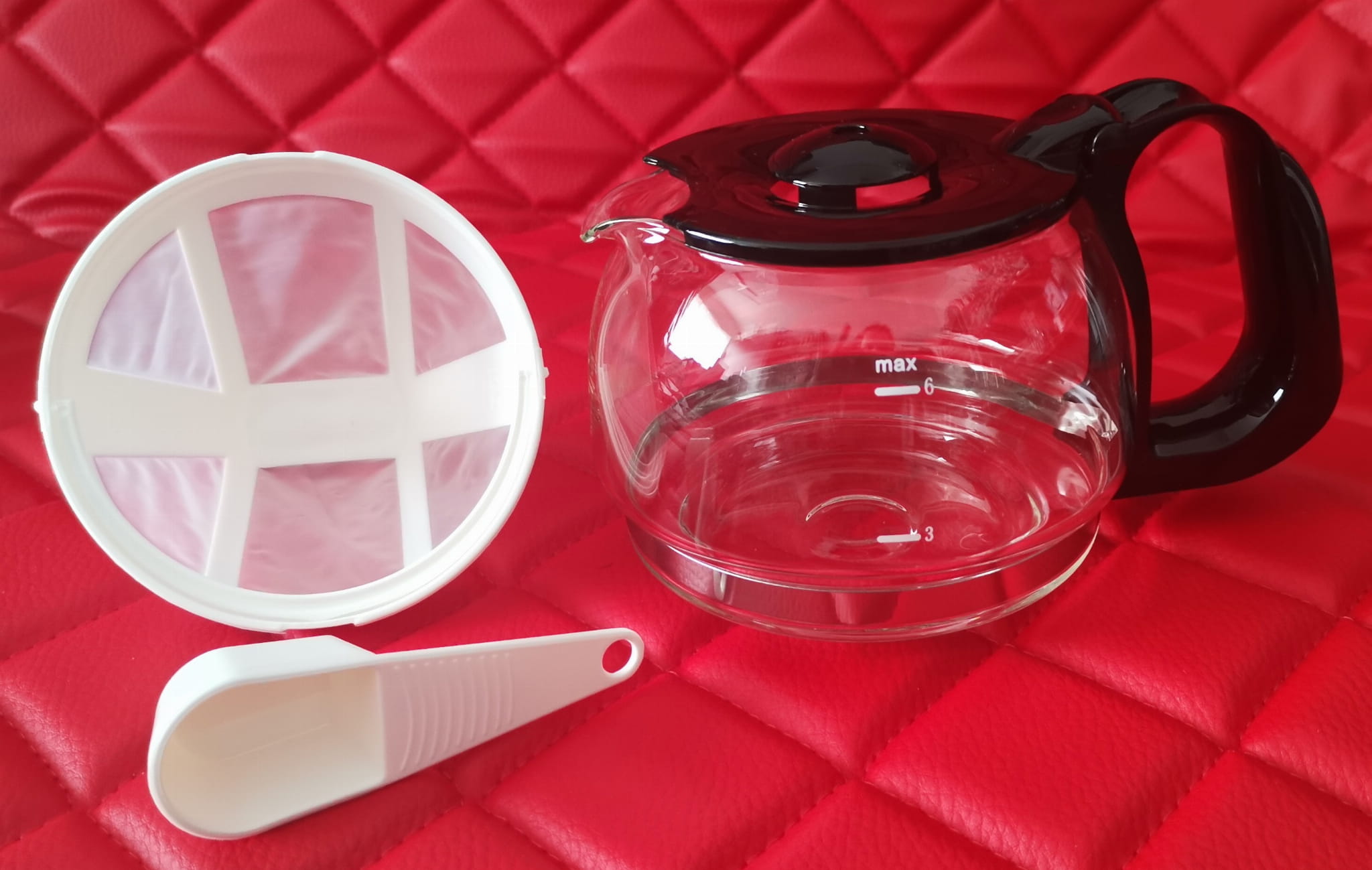 W skład ekspresu wchodzi dzbanek szklany z rączką, o pojemności 0,65 L, co daje mozliwość zaparzenia od 4-6 filiżanek kawy. Ekspres zawiera także wielorazowy plastikowy filtr (myjemy jak naczynia), do którego wsypuje się kawę, w celu zaparzenia.