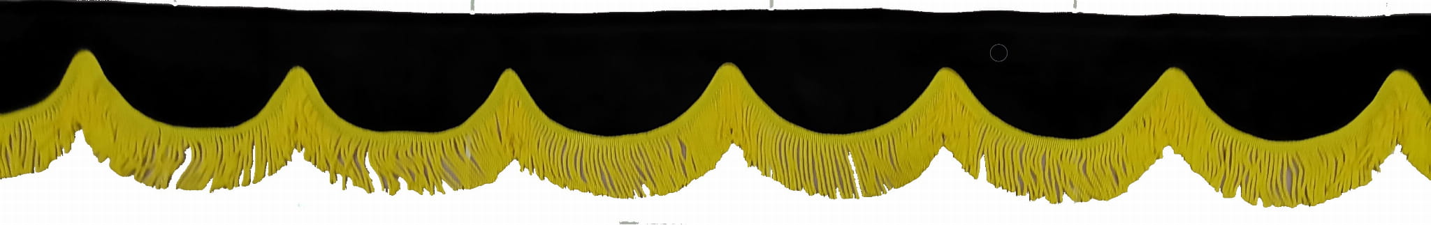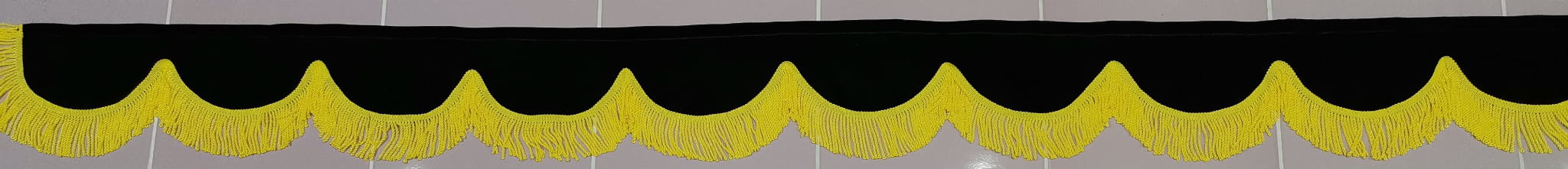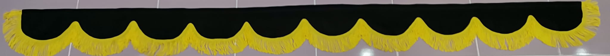 Zasłonka wykonana jest z czarnego pluszu, wykończona jest frędzlami prostymi w kolorze żółtym.