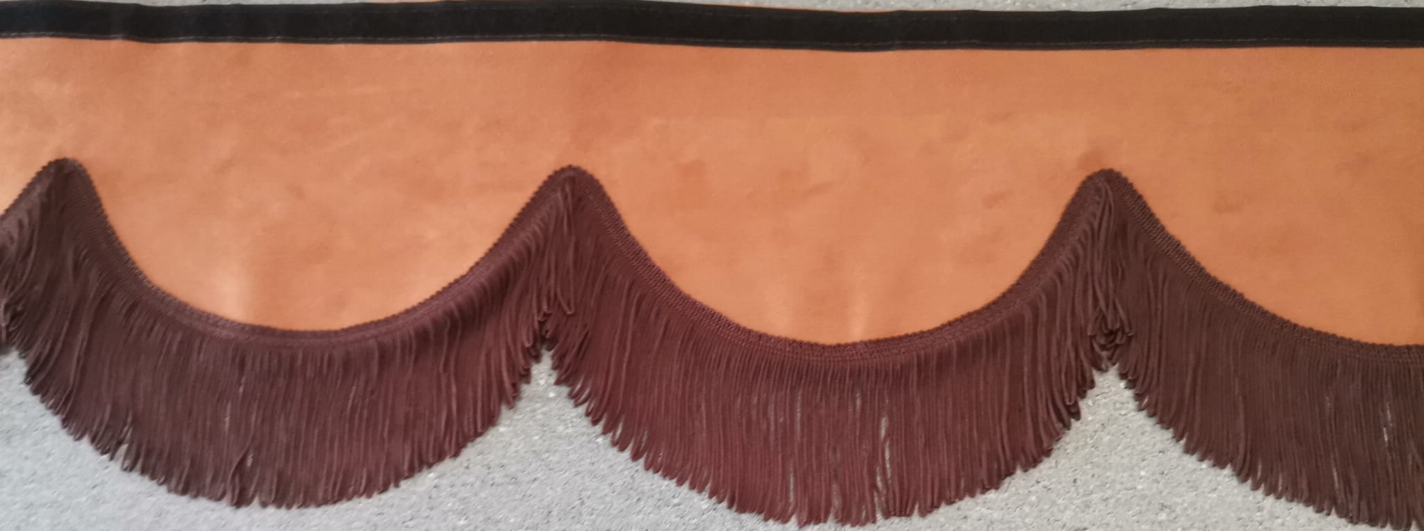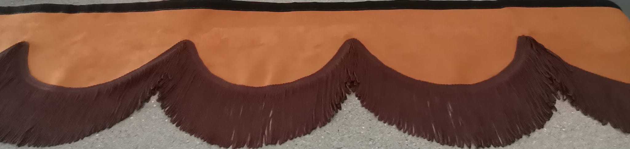 Podwójna falbana wykonana jest z 2 warstw materiału- pluszu w kolorze karmelowym. Falbana posiada taki sam kolor z prawej i lewej strony. Falbana wykończona jest cienkimi frędzlami typu "makaron nitki" w kolorze ciemno brązowym (jednostronne obszycie frędzlami).