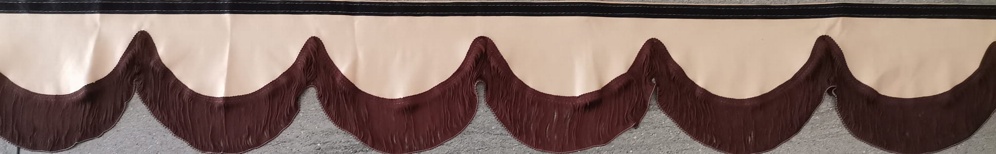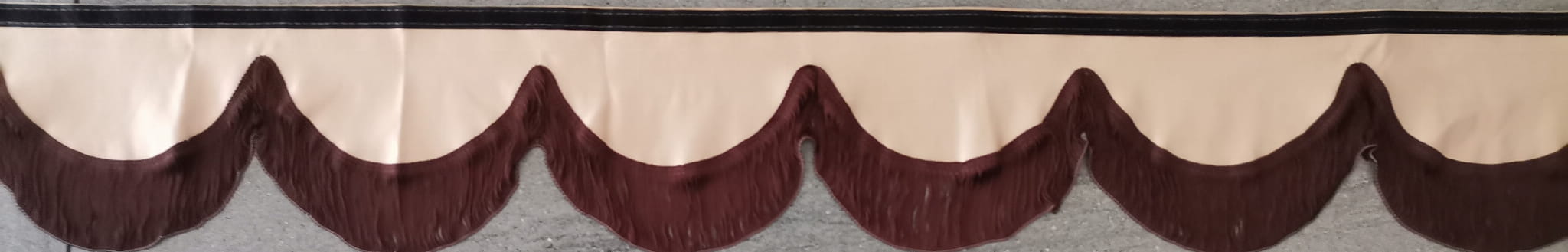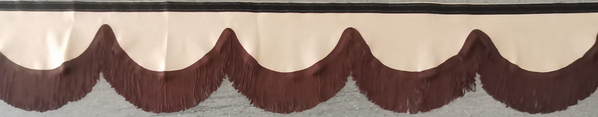 Zasłonka wykonana jest z beżowego (kremowego) pluszu, wykończona jest cienkimi frędzlami typu "makaron nitki" w kolorze brązowym.