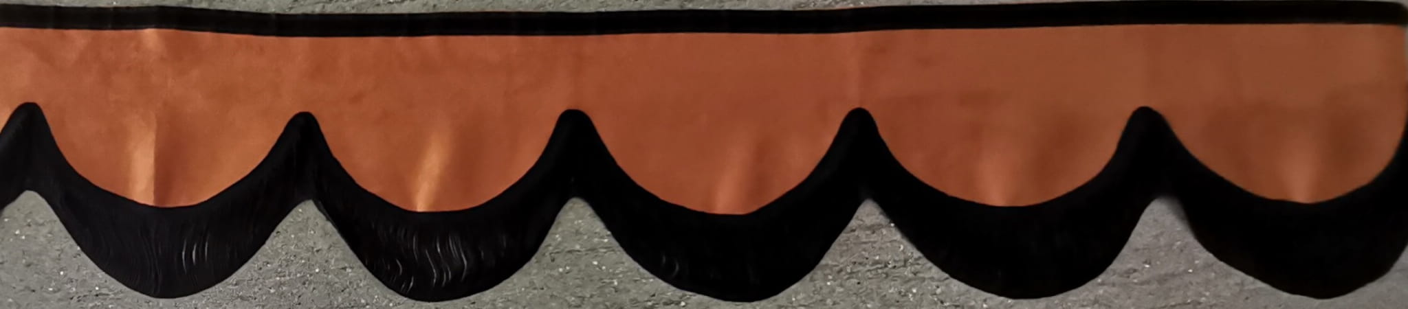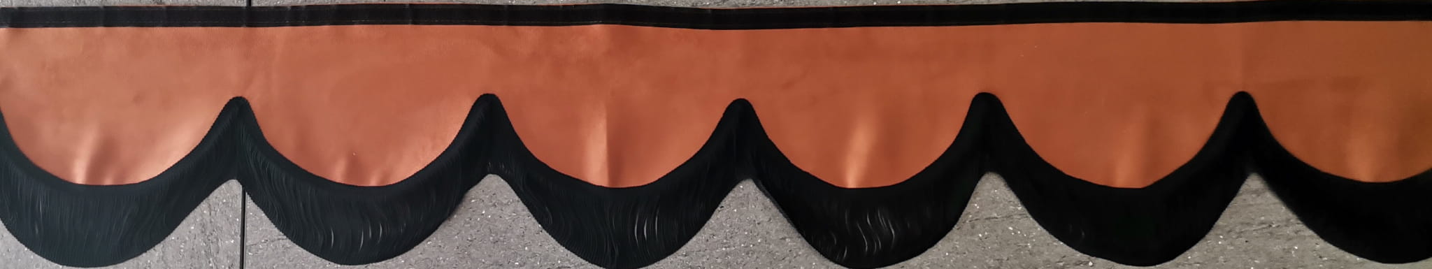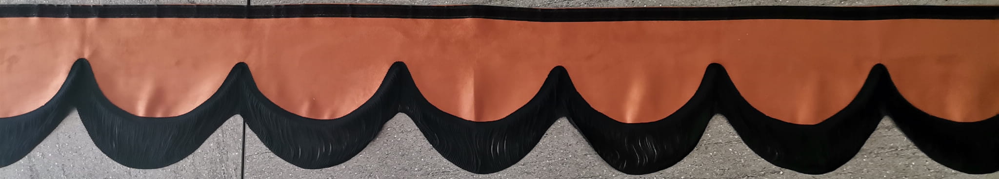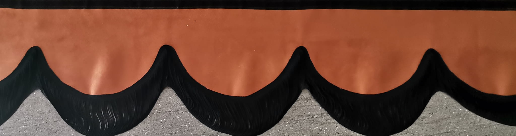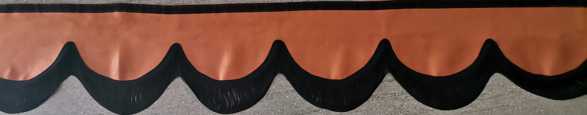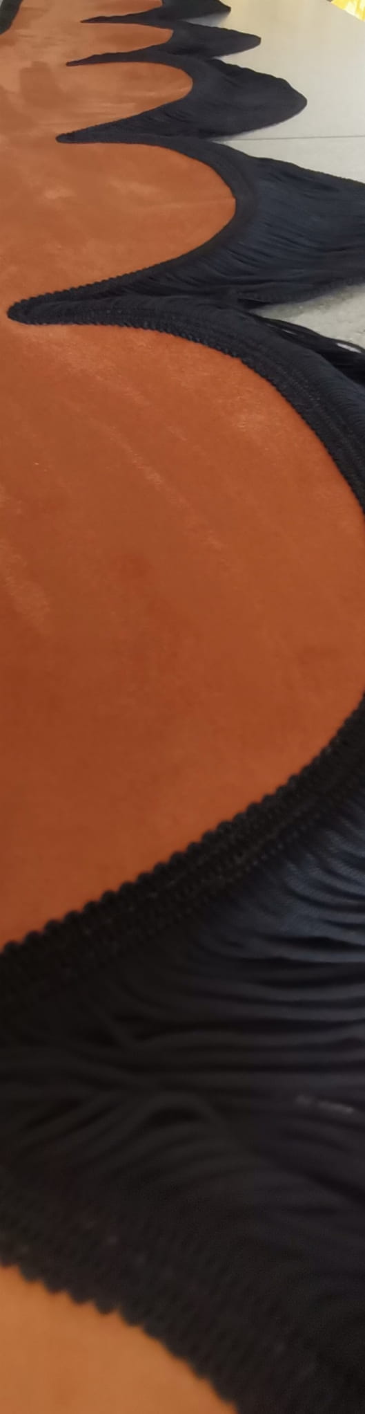 Falbana wykończona jest cienkimi frędzlami typu "makaron nitki" w kolorze czarnym (jednostronne obszycie frędzlami).