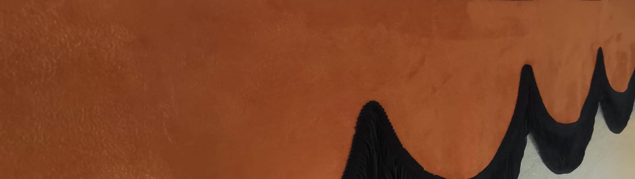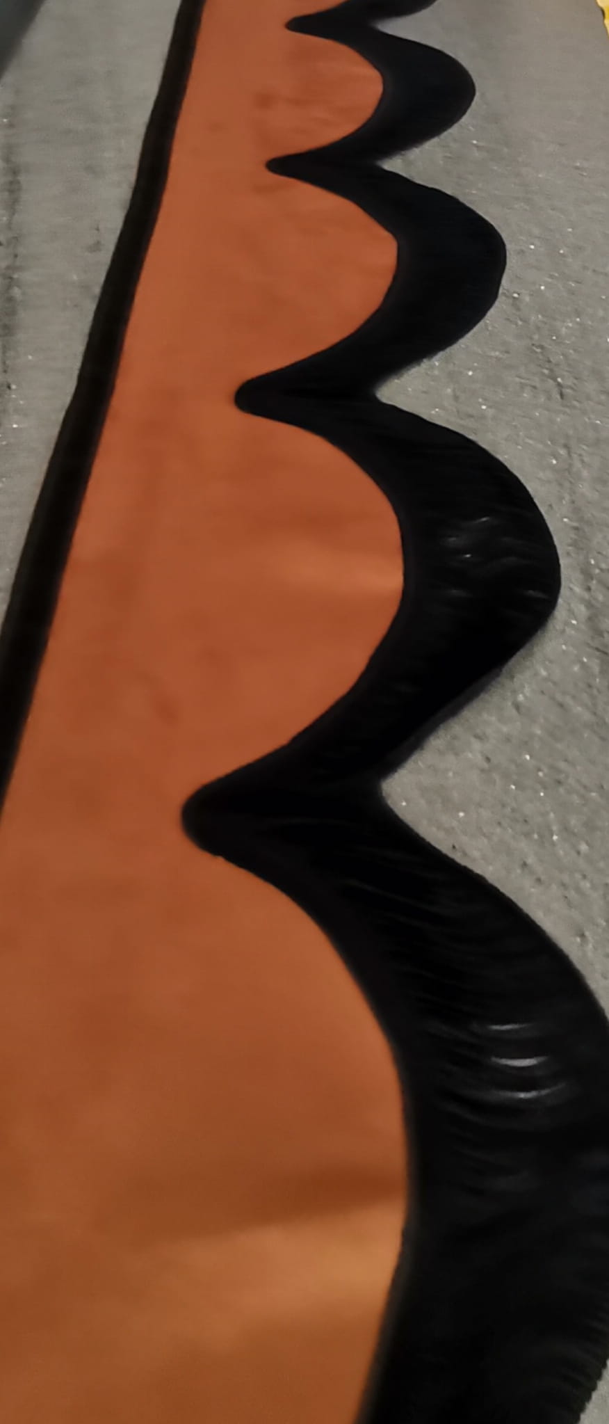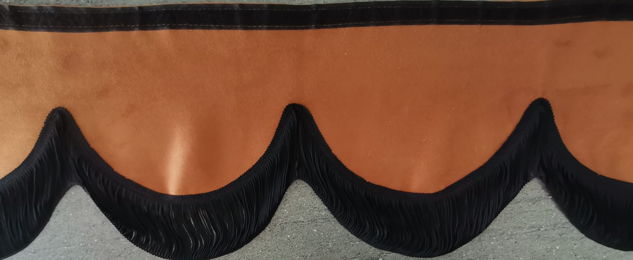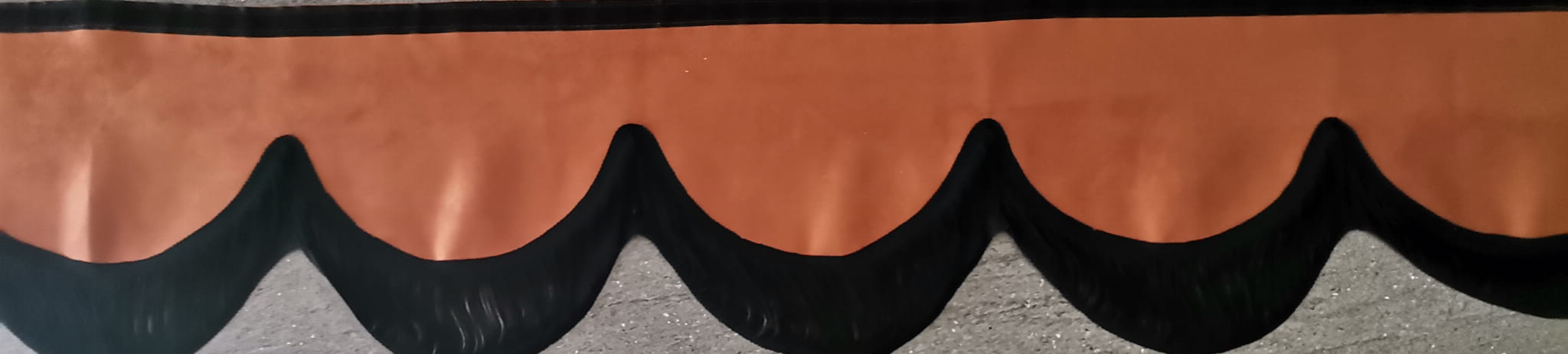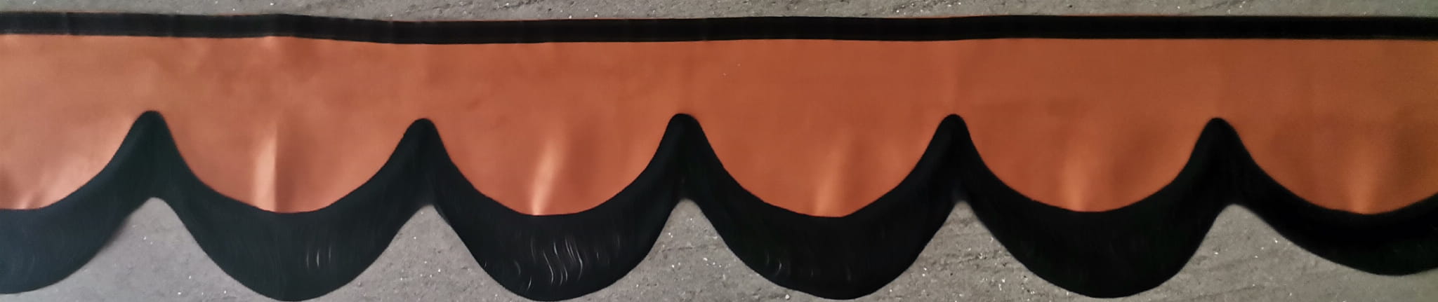 Falbana wykończona jest cienkimi frędzlami typu "makaron nitki" w kolorze czarnym (jednostronne obszycie frędzlami).