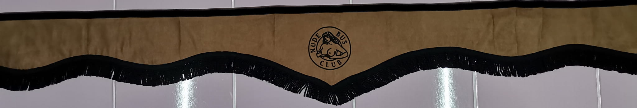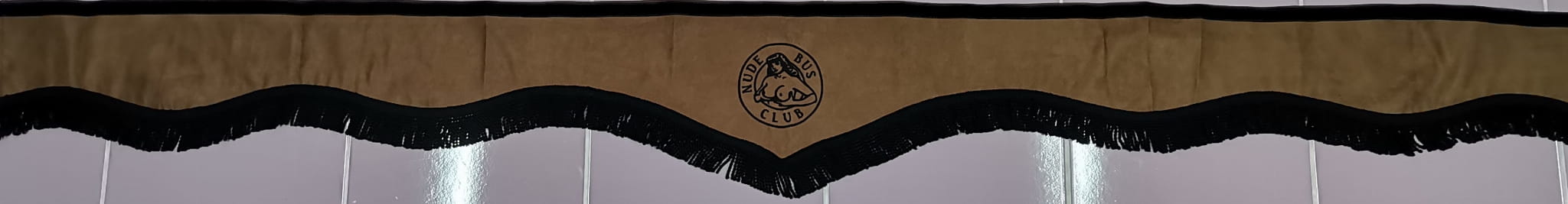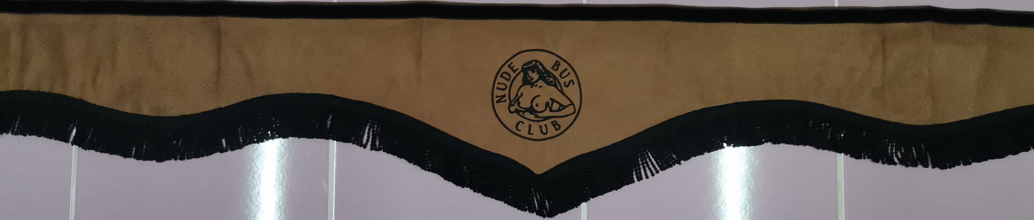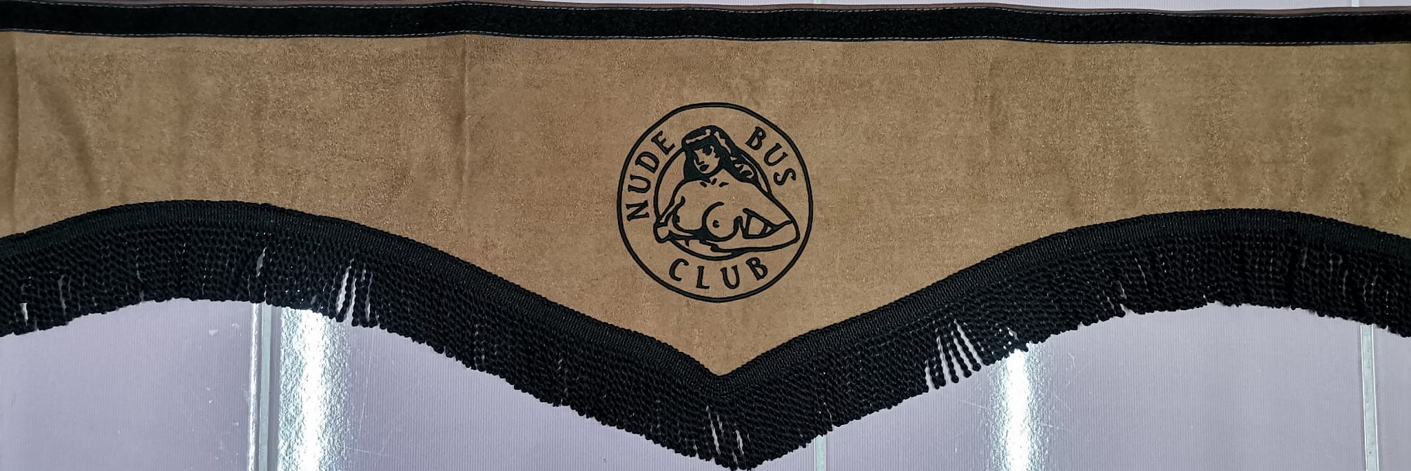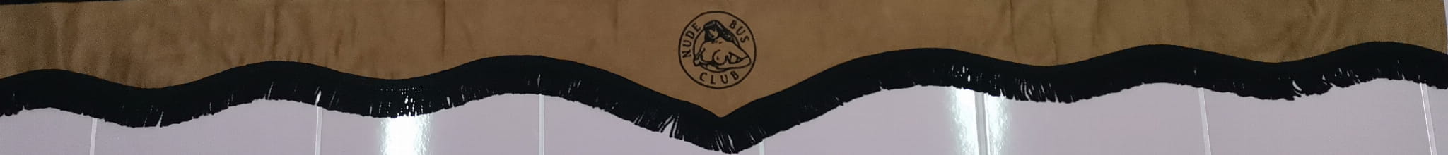 Zasłonka wykonana jest z jasno brązowego pluszu, wykończona jest czarnymi frędzlami prostymi. Posiada efektowny haft NUDE BUS CLUB w kolorze czarnym.