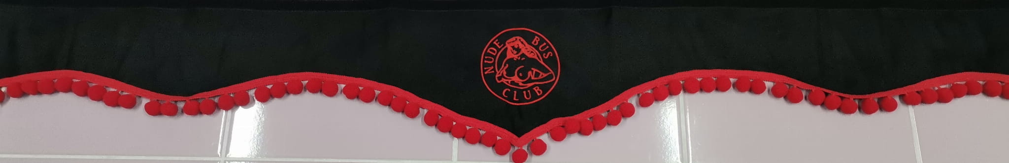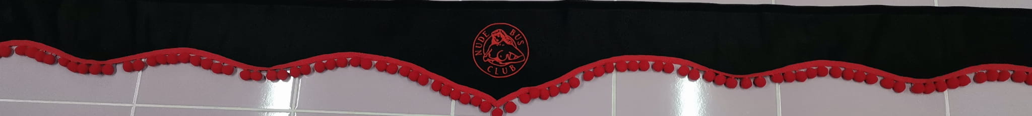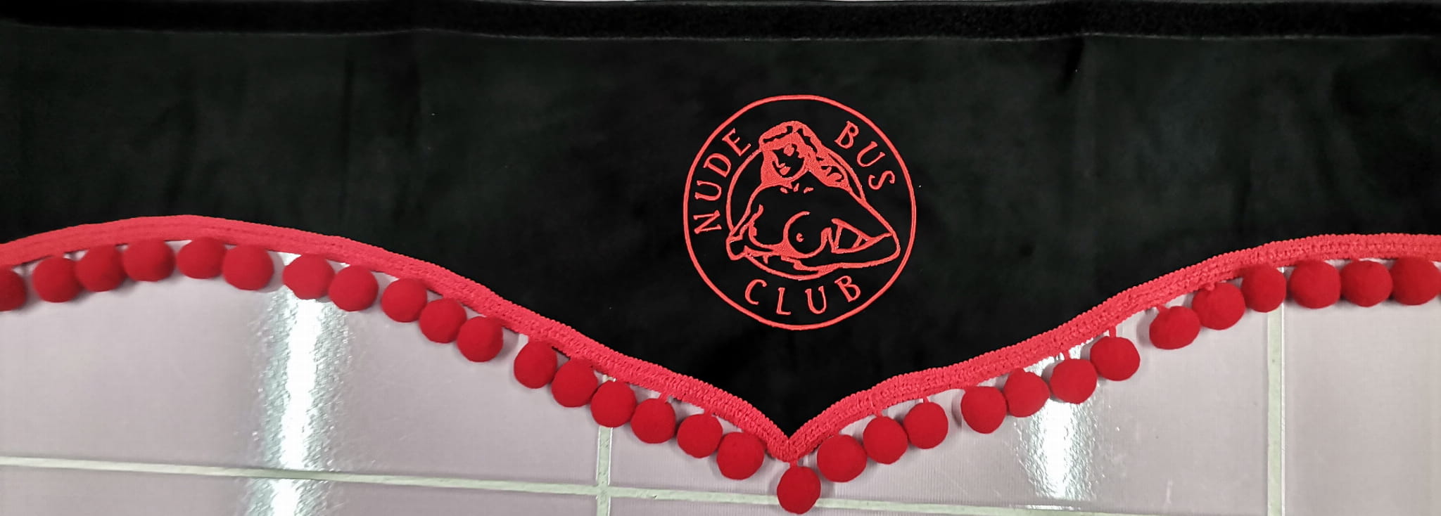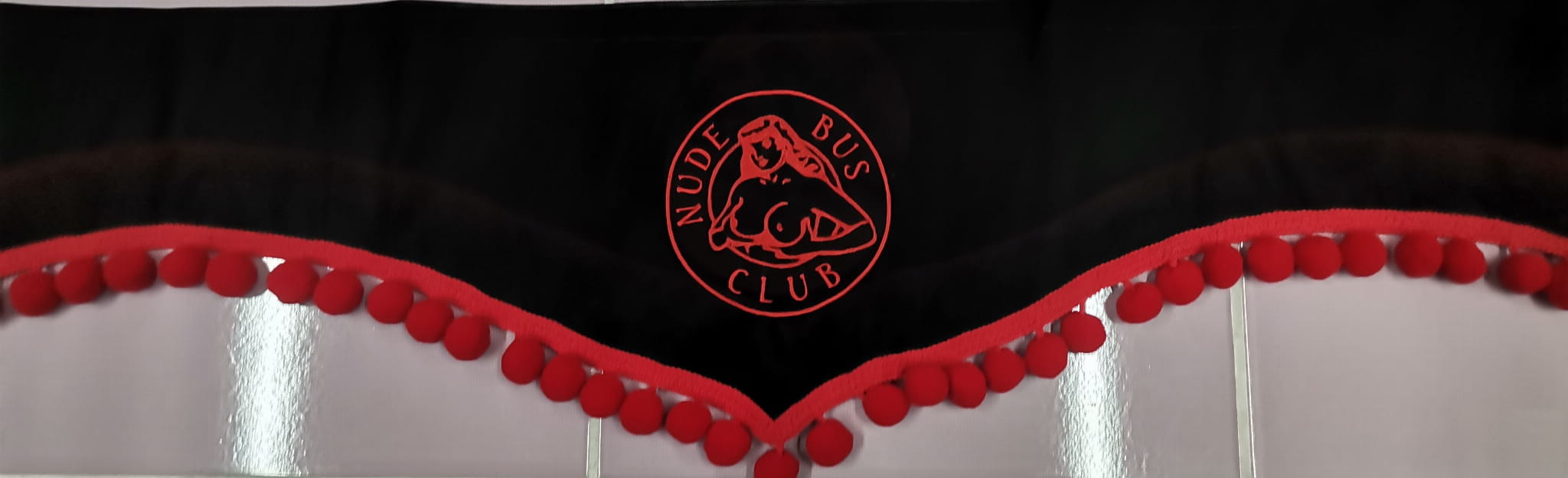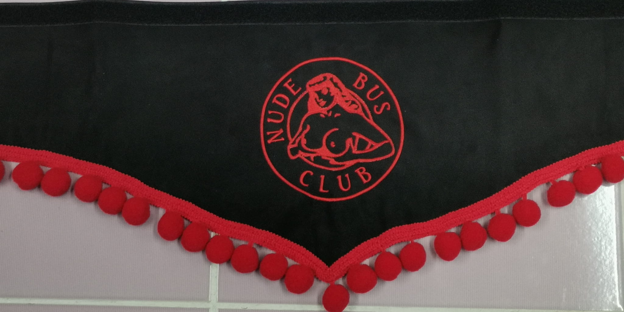Zasłonka wykonana jest z czarnego pluszu, wykończona jest czerwonymi frędzlami w kształcie kulek. Posiada efektowny haft NUDE BUS CLUB w kolorze czerwonym.
