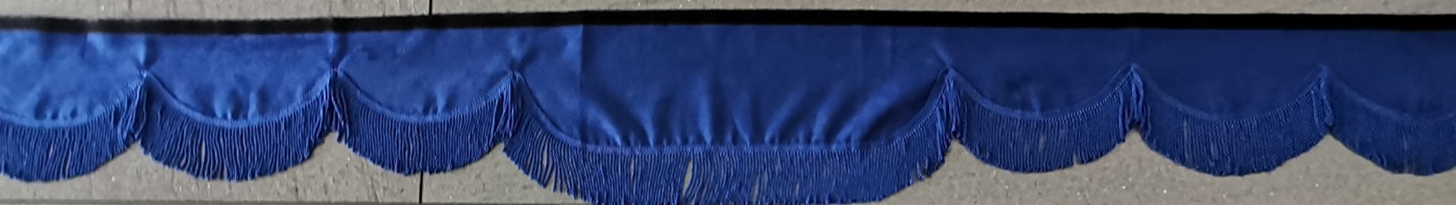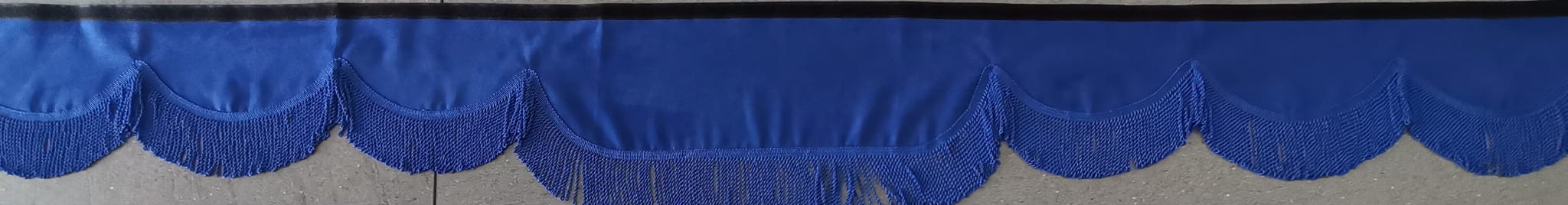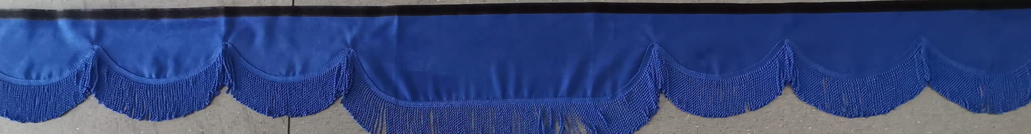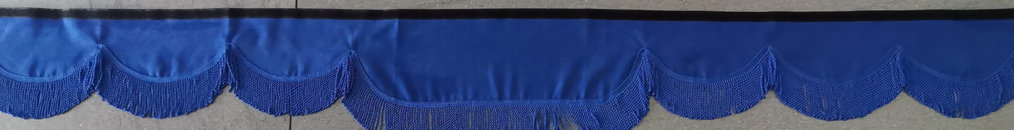 Zasłonka wykonana jest z niebieskiego pluszu, wykończona jest frędzlami prostymi w kolorze niebieskim.