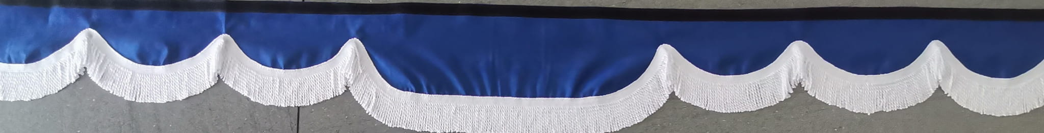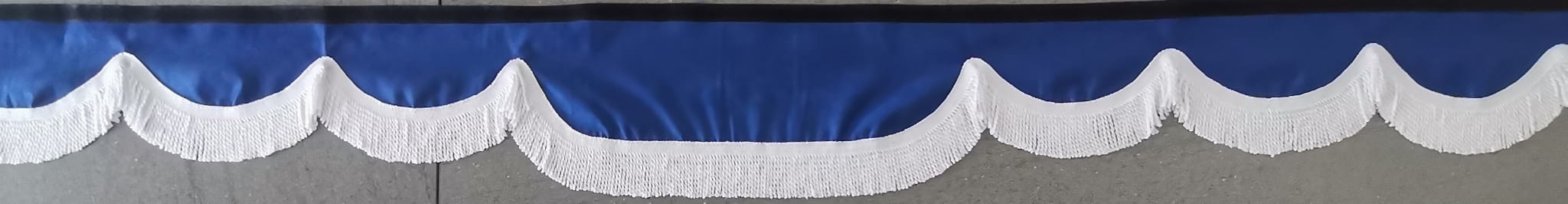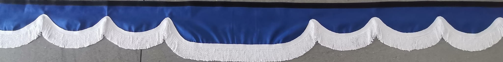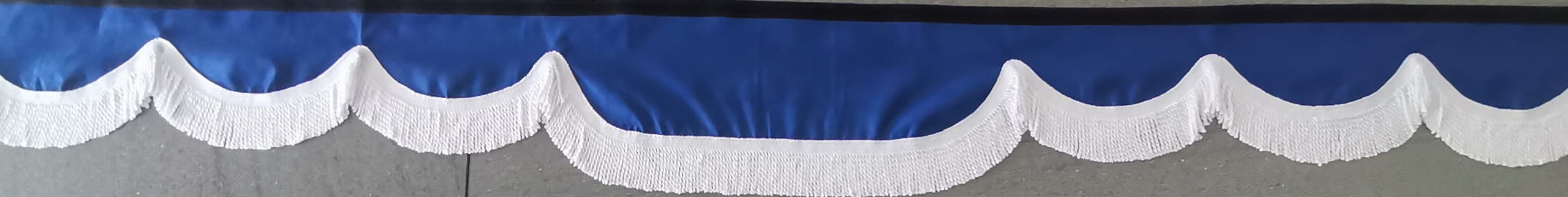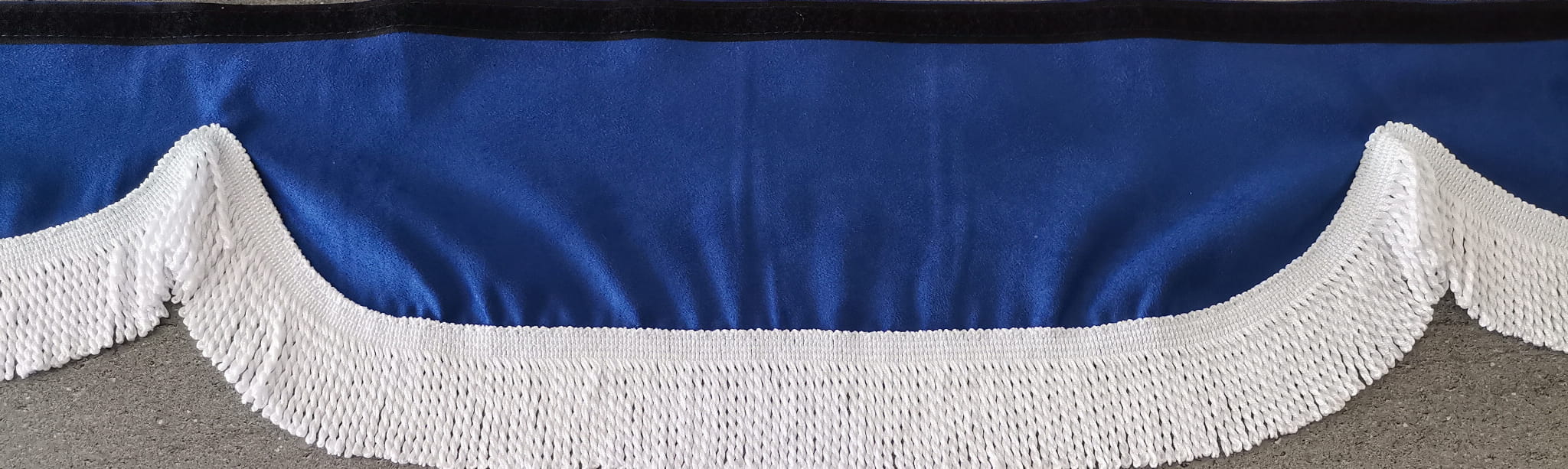 Zasłonka wykonana jest z niebieskiego pluszu, wykończona jest frędzlami prostymi w kolorze białym.