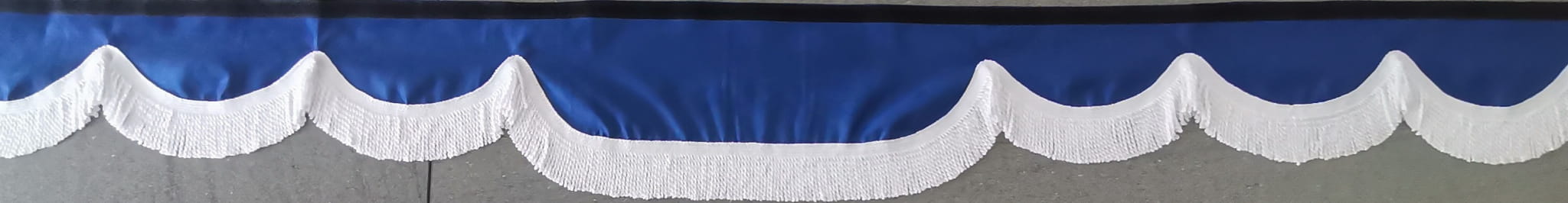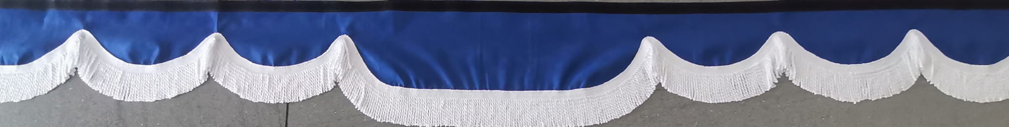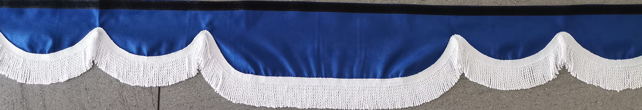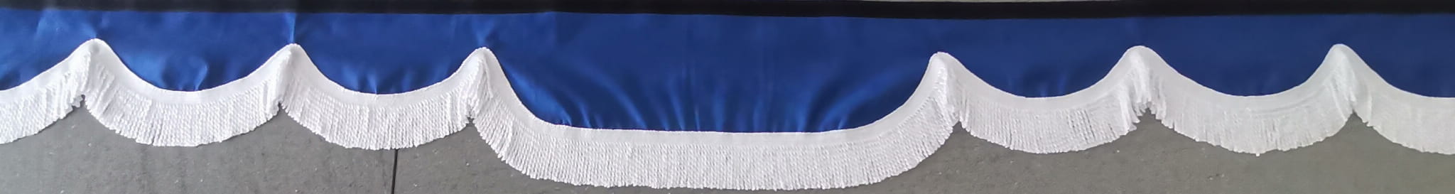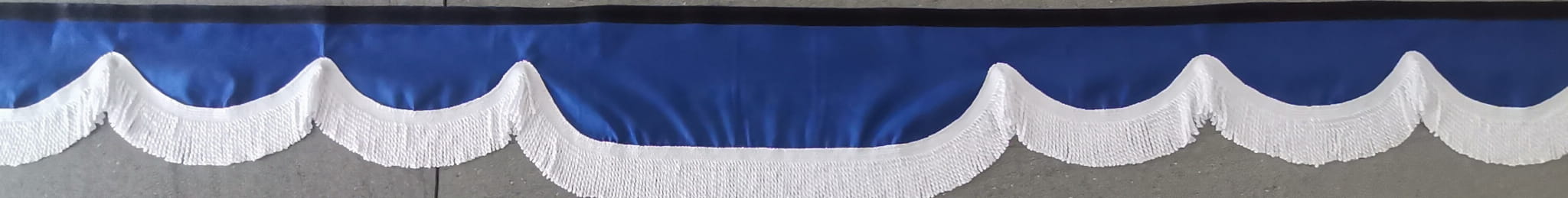 Zasłonka wykonana jest z niebieskiego pluszu, wykończona jest frędzlami prostymi w kolorze białym.