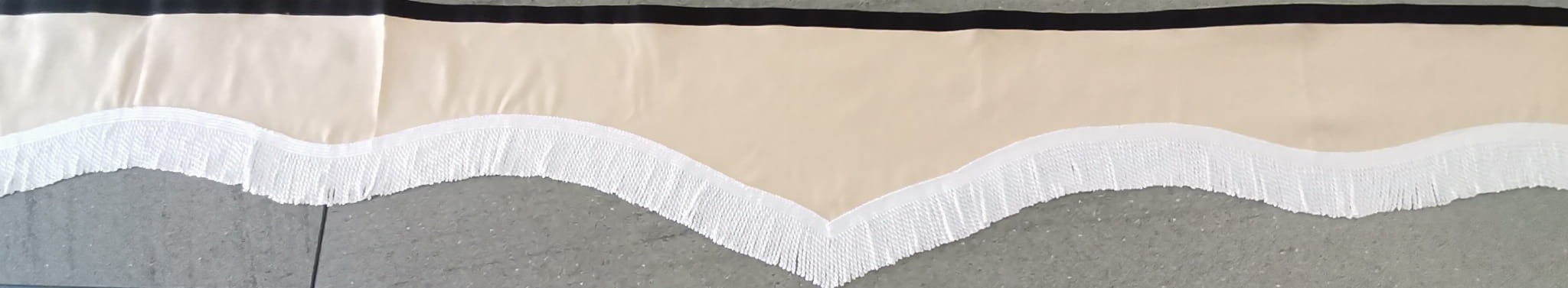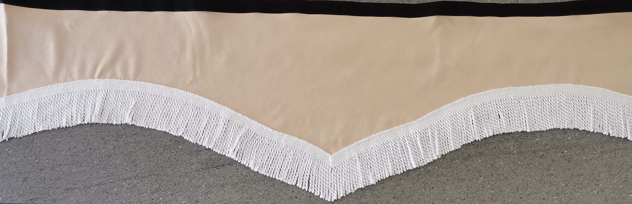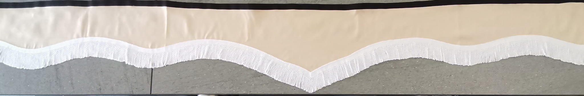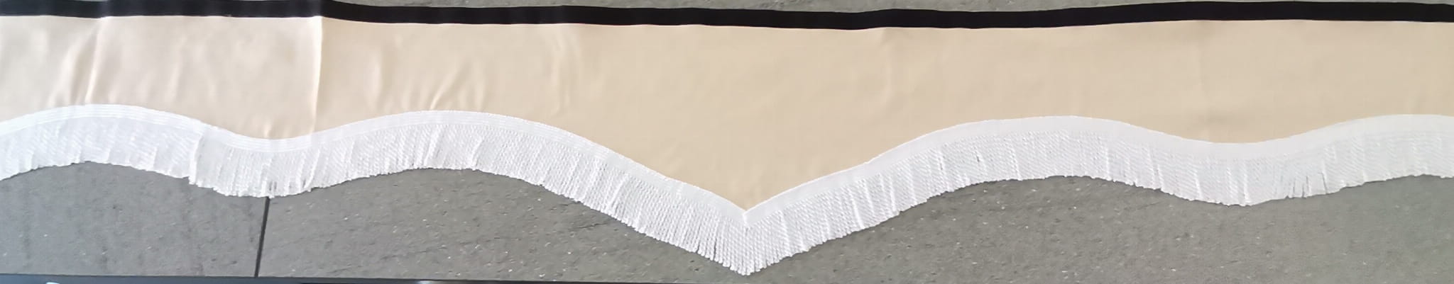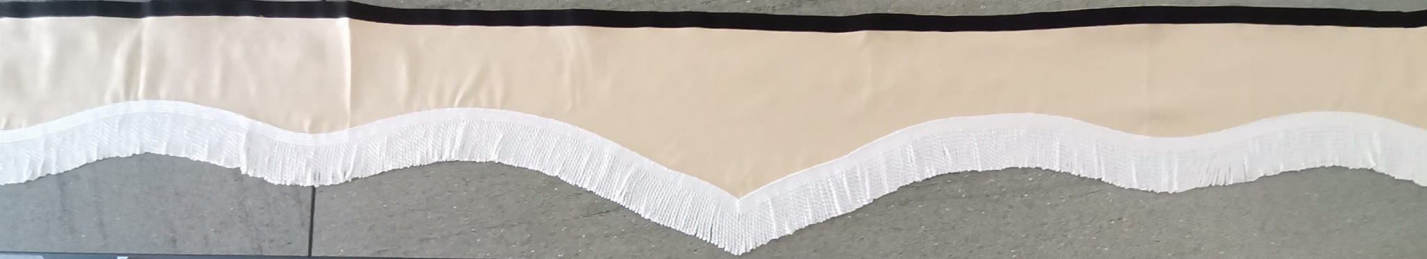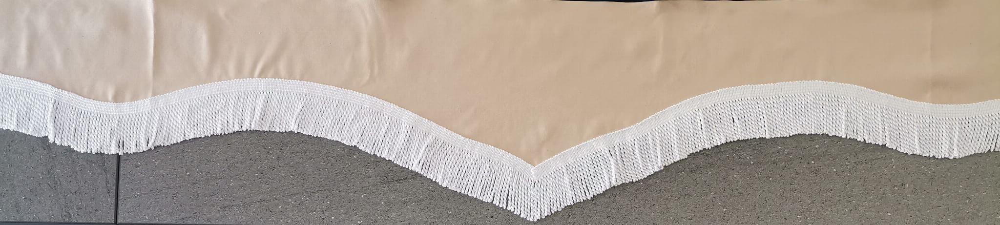 Zasłonka wykonana jest z kremowo-beżowego pluszu, wykończona jest białymi frędzlami prostymi.