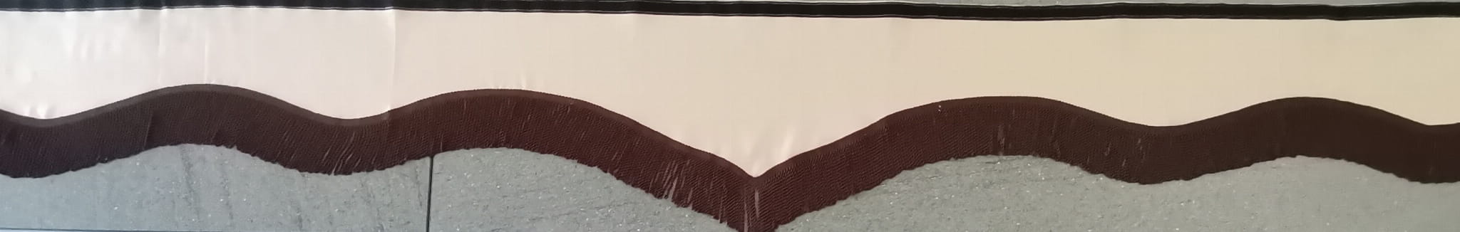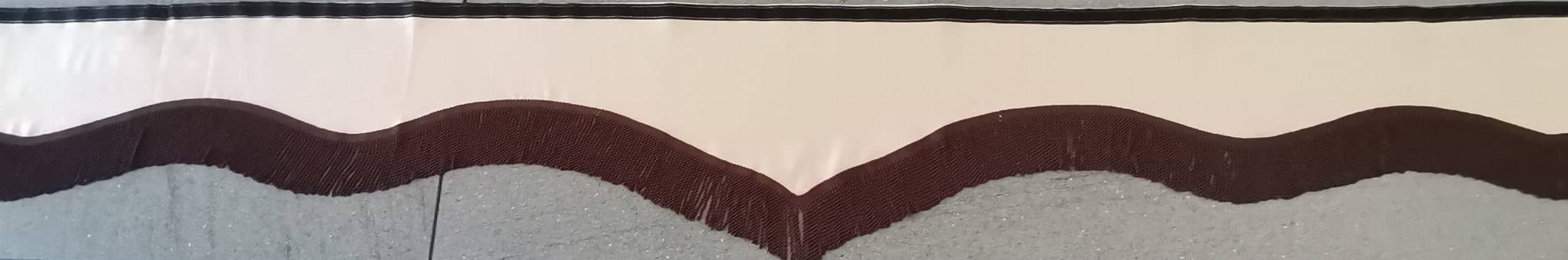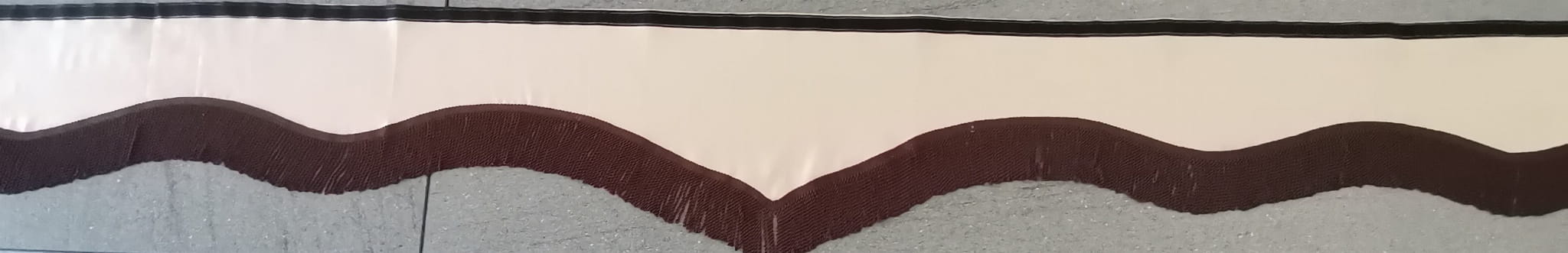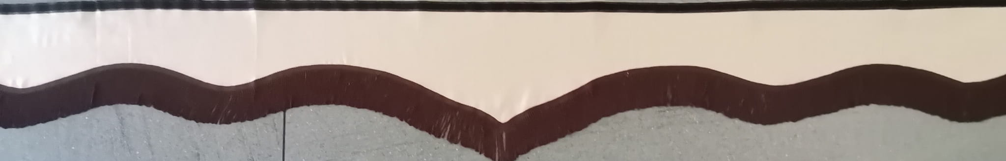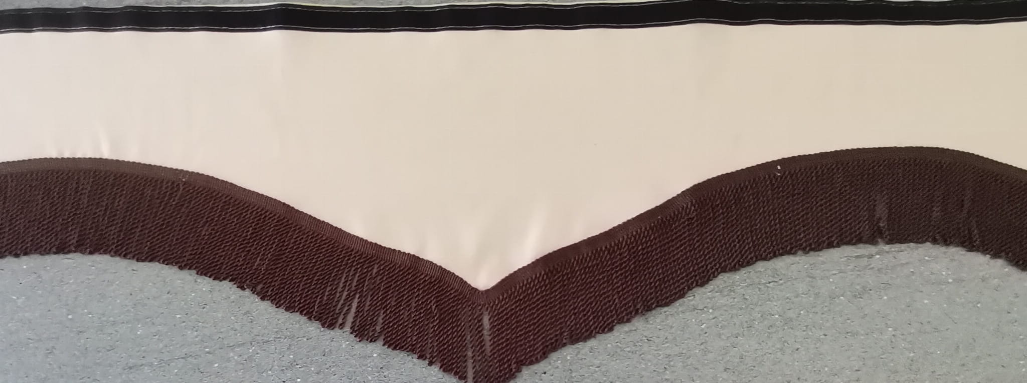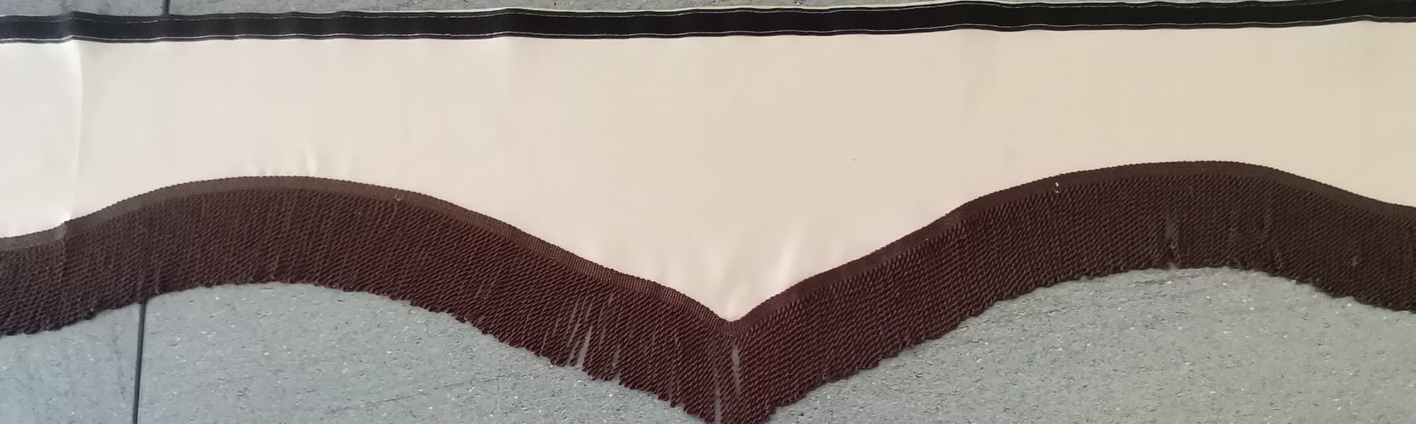 Falbana wykonana jest z kremowo-brązowego pluszu, wykończona ciemno brązowymi frędzlami prostymi (kolor gorzkiej czekolady).