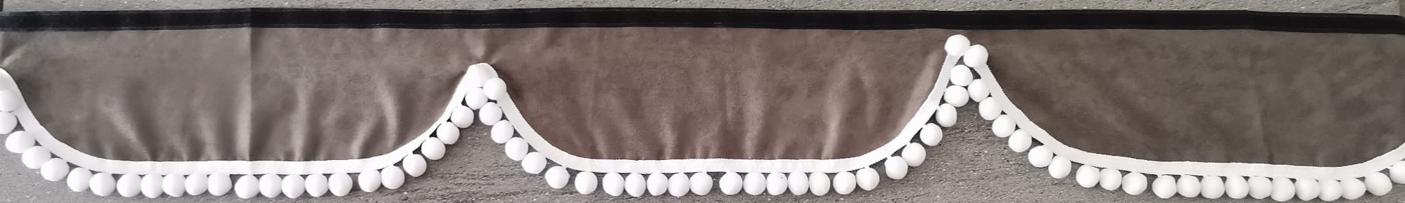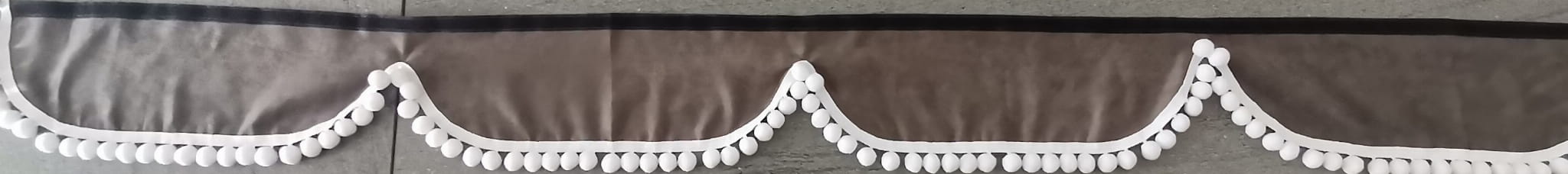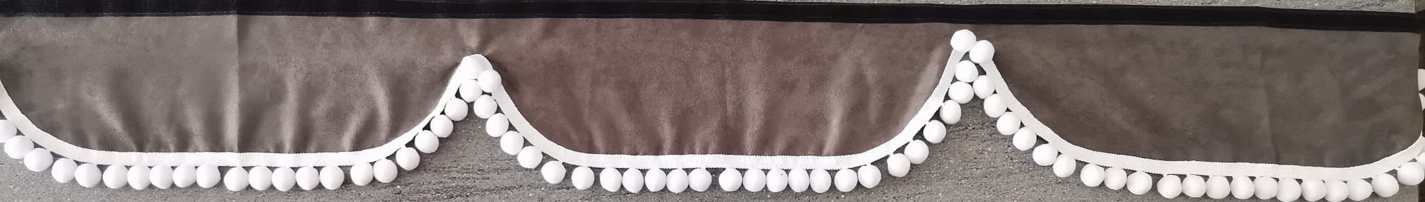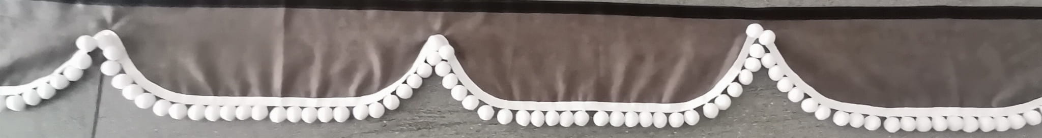 Zasłonka wykonana jest z ciemno szarego pluszu, wykończona jest białymi frędzlami w kształcie kulek.