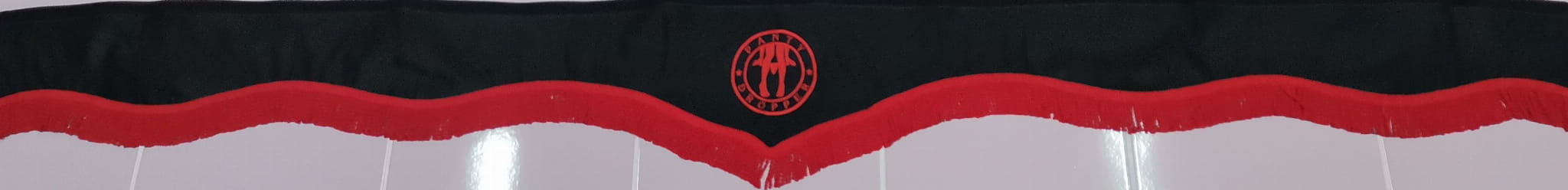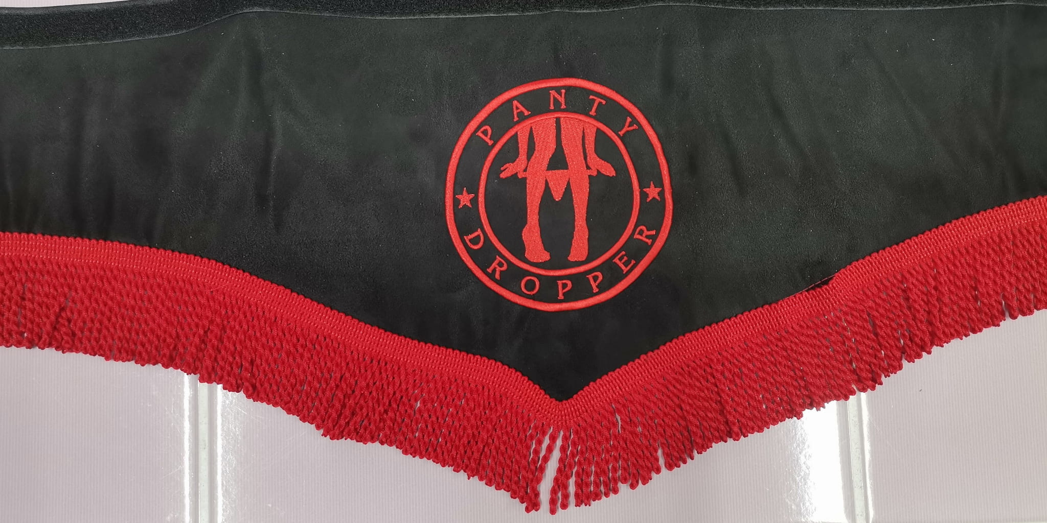 Zasłonka wykonana jest z czarnego pluszu, wykończona jest czerwonymi, prostymi frędzlami. Posiada efektowny haft PANTY DROPPER w kolorze czerwonym.