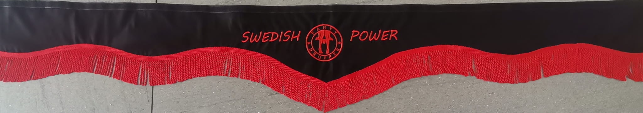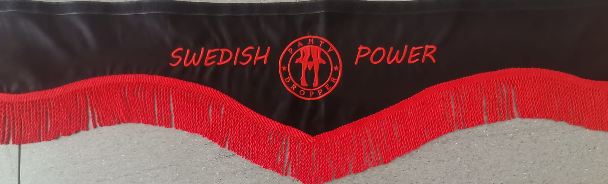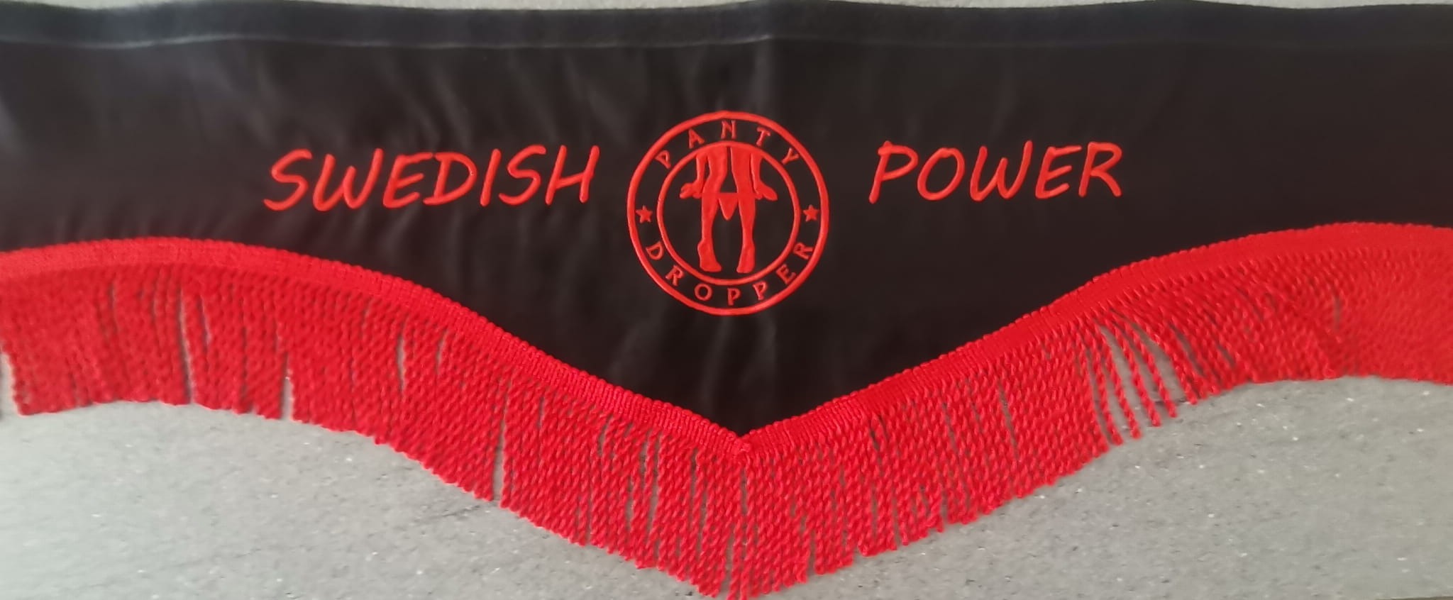 Falbana wykonana jest z czarnego pluszu, wykończona jest prostymi frędzlami w czerwonym kolorze. Posiada efektowny haft "PANTY DROPPER swedish power" w kolorze czerwonym.