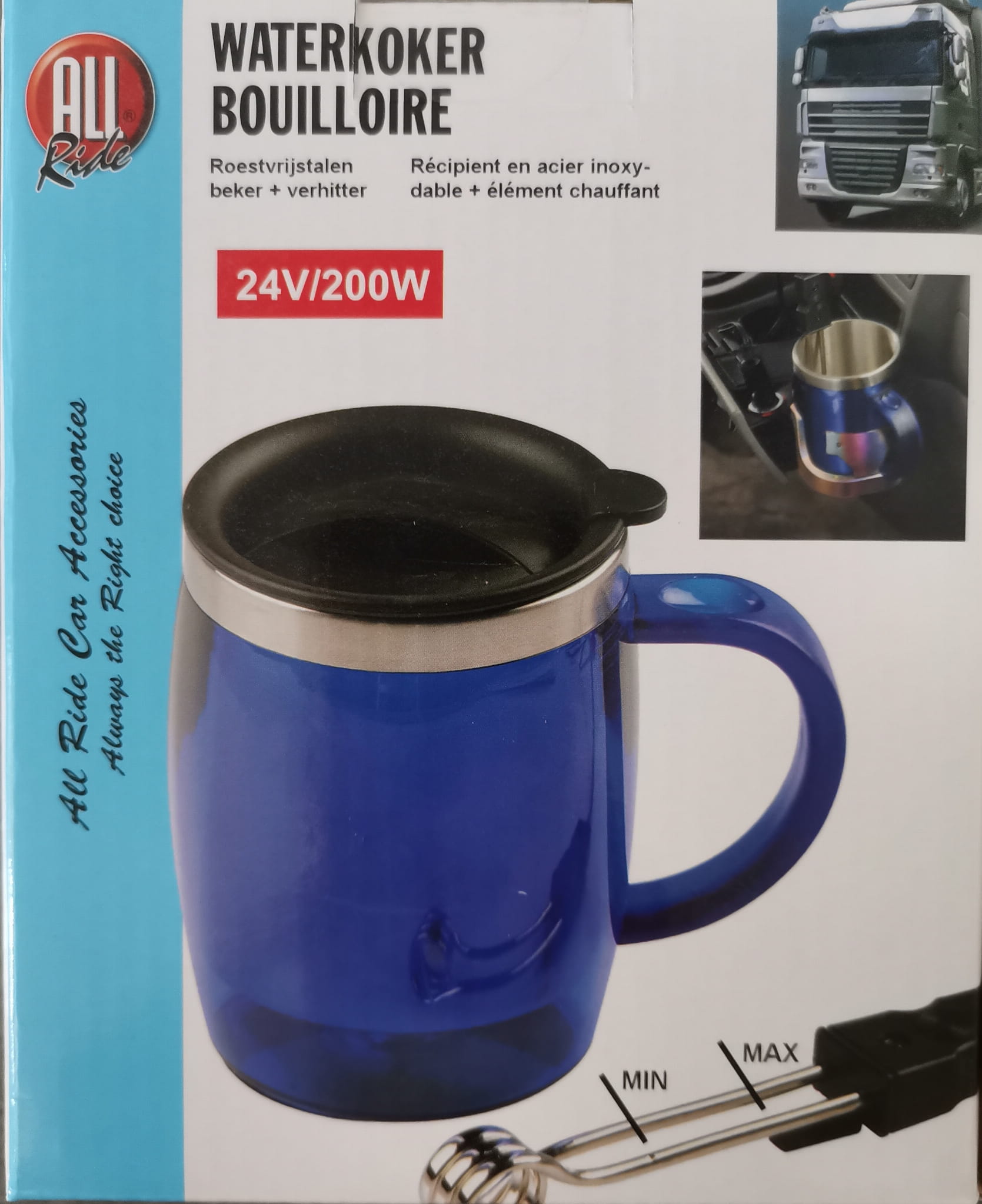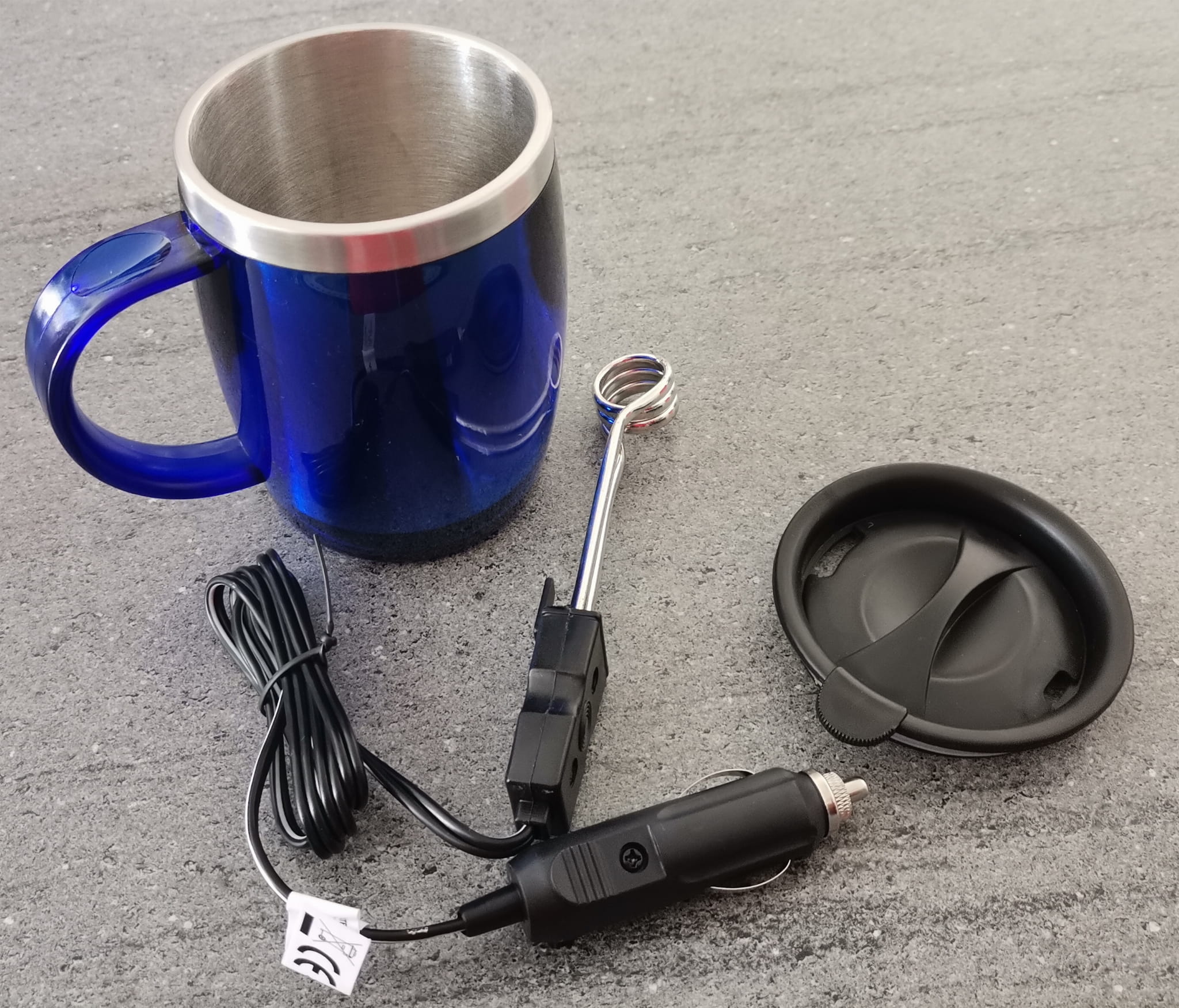 Termiczny kubek wykonany ze stali nierdzewnej wysokiej jakości z dekielkiem. Do zestawu dołączona jest zanurzeniowa grzałka zasilana z gniazda zapalniczki o napięciu 24 V. Moc grzewcza grzałki 200 W (grzałka jest osobnym elementem).