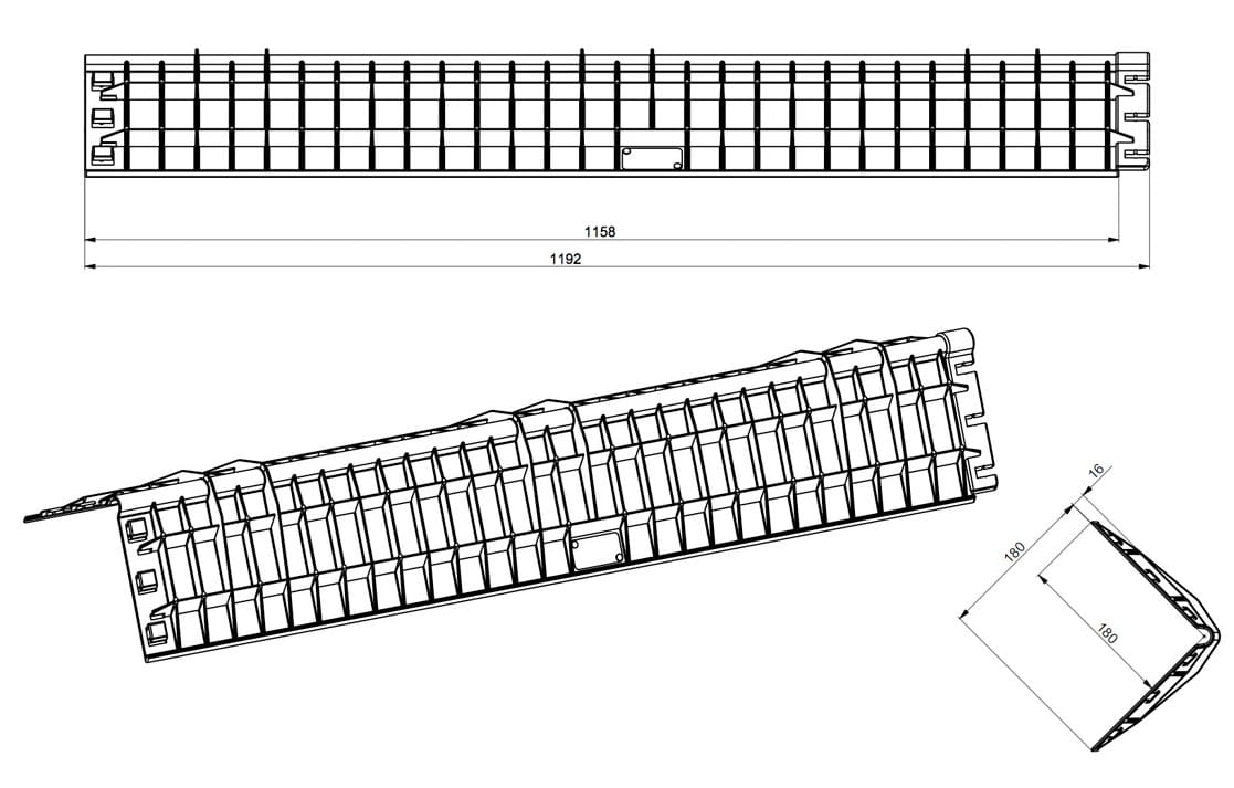 Listwa kątowa o długości 60 cm wykonana jest z wysokiej jakości tworzywa sztucznego. Wytrzymuje setki kilogramów nacisku w różnych płaszczyznach oraz chroni krawędzie ładunku przed uszkodzeniem, dopasowuje się do różnych kształtów ładunku (płaskiego i okrągłego). Chroni także taśmę pasa transportwego przed przecięciem.