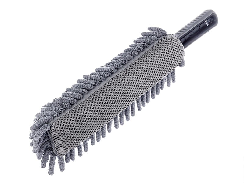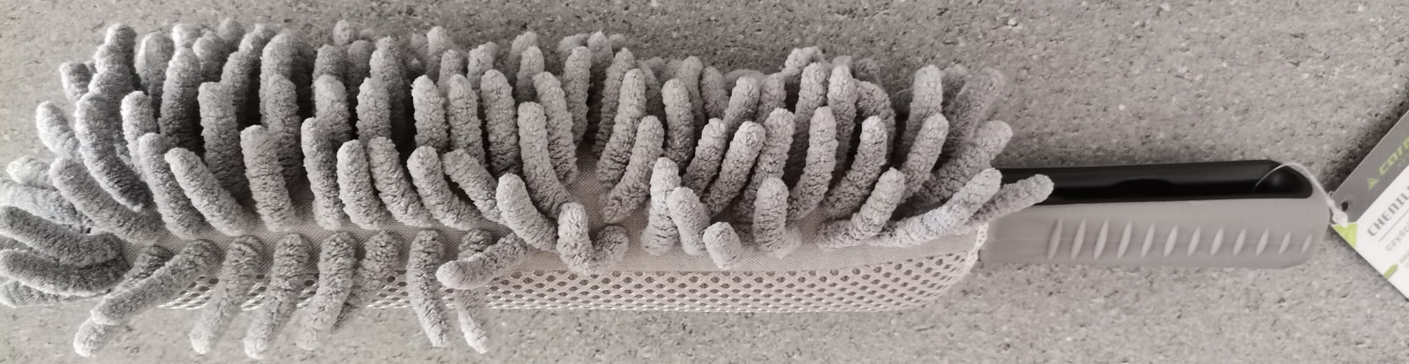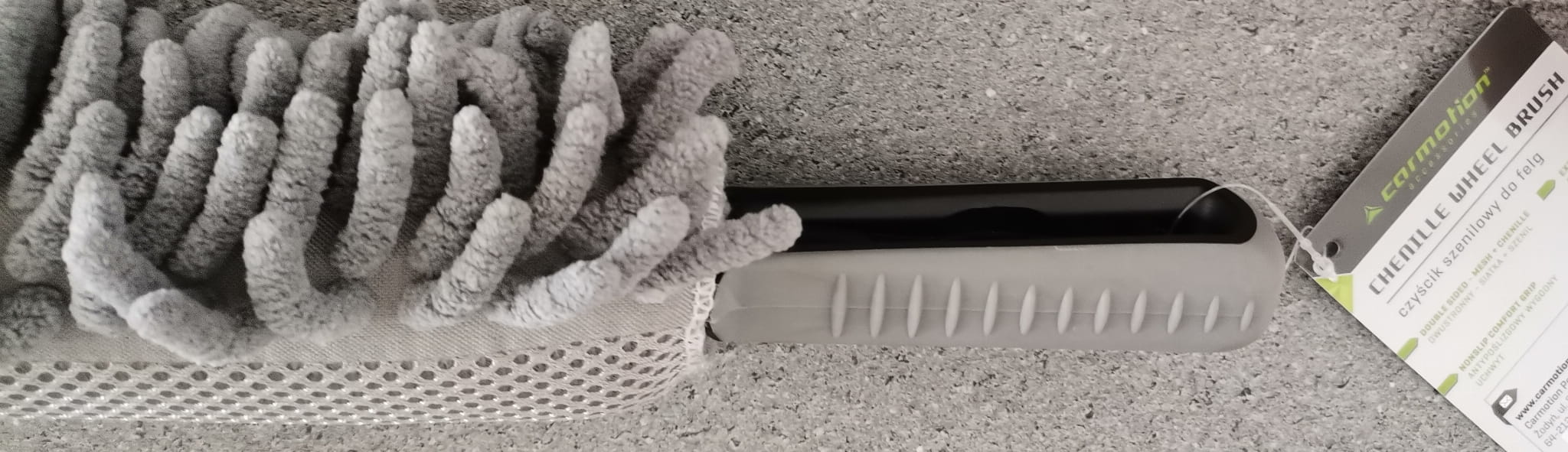 Czyścik do mycia felg samochodowych jest dwustronny. Z jednej strony są miękkie włókna szenilowe, z drugiej strony jest gąbka siatkowa. Całkowita dlugość czyścika to 36 cm. Szenil efektywnie myje bez zarysowań, siatka skutecznie usuwa trudniejsze zabrudzenia. Antypoślizgowy uchwyt (o długości 10 cm) zapewnia pewny chwyt. Szczotka jest odporna na działanie chemii myjącej oraz preparatów kwasowych i zasadowych.