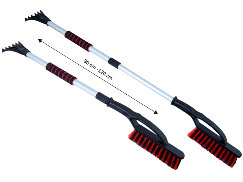 Teleskopowy trzonek zakończony jest z jednej strony skrobaczka do szyb z drugiej strony szczotką o szerokości 20 cm. Trzonek jest składany i można go regulować w zakresie od 90 do 120 cm.