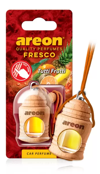 Markowy zapach samochodowy Areon Fresco z zawieszką. Odświeżacz powietrza o TUTTI FRUTTI jest od razu gotowy do użycia. Można zawiesić gdziekolowiek w samochodzie. Poza wspaniałym i bardzo trwałym zapachem odznacza się bardzo eleganckim wyglądem. Mały szklany słoiczek zapakowany w naturalne drewno z pomarańczowym sznureczkiem.