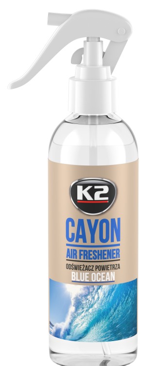 Samochodowy odświeżacz powietrza K2 Cayon w sprayu o zapachu morskich fal. Energetyczny, aromatyczny, odświeżający, zapakowany w ergonomiczną buteleczkę o pojemności 250 ml.