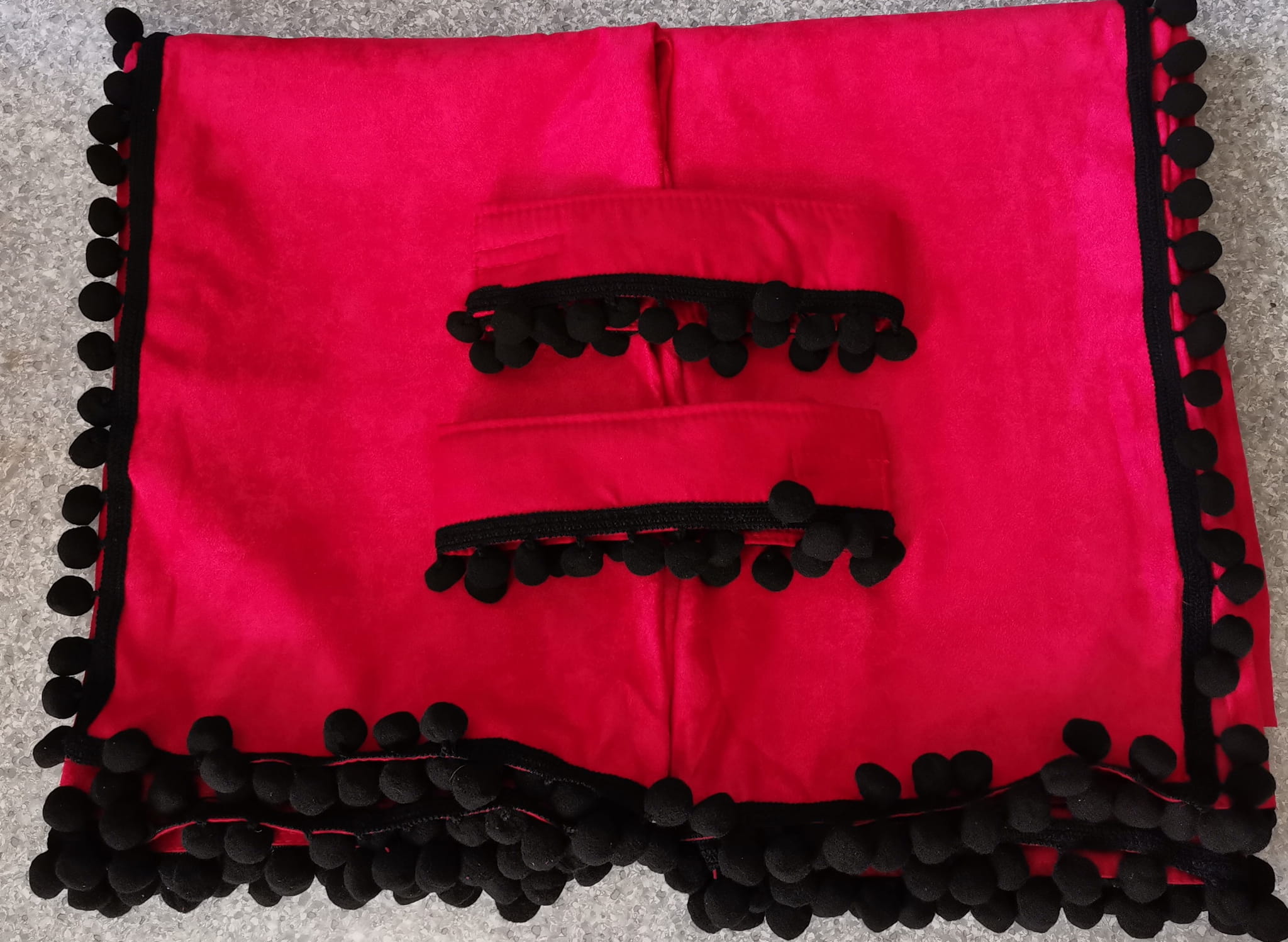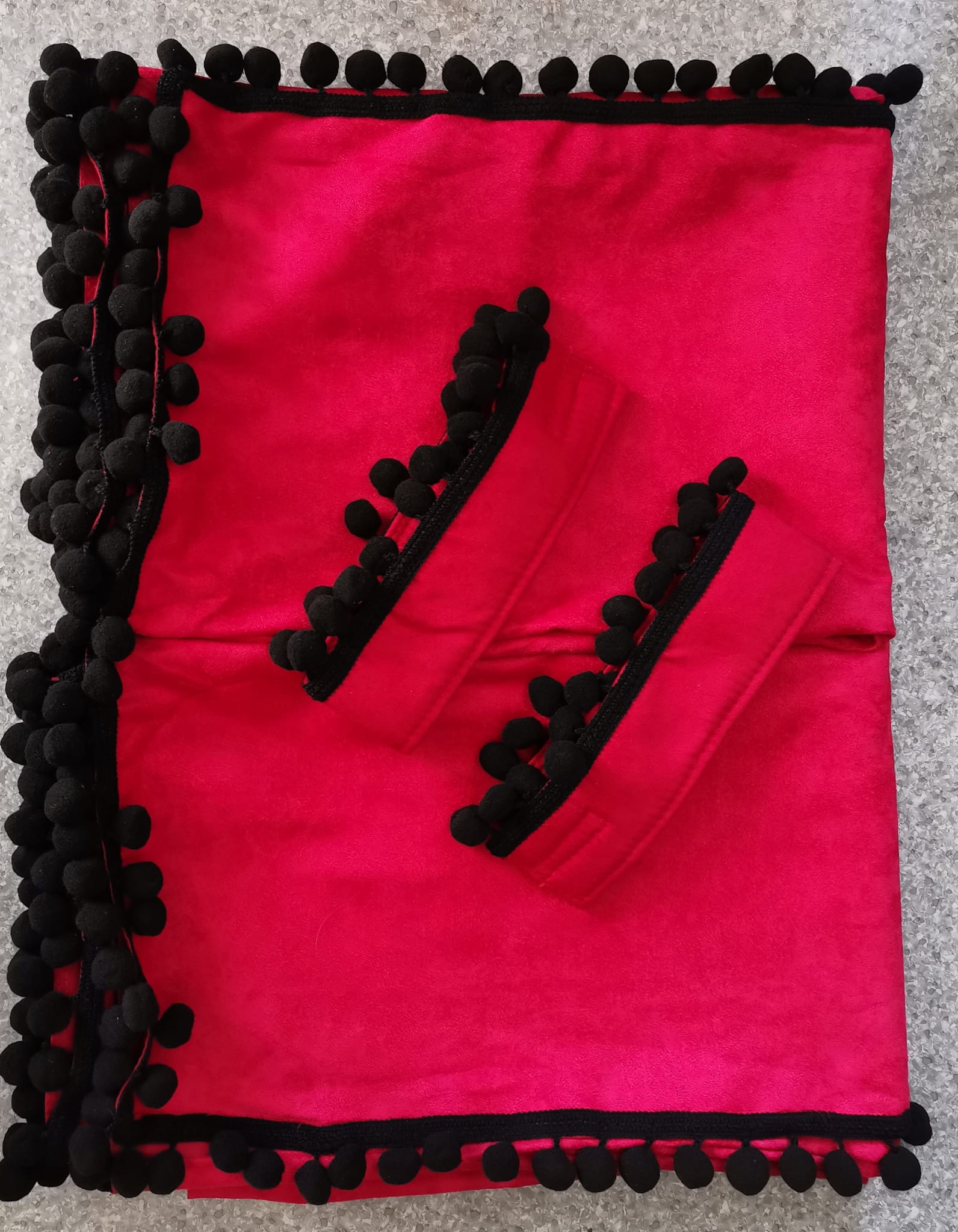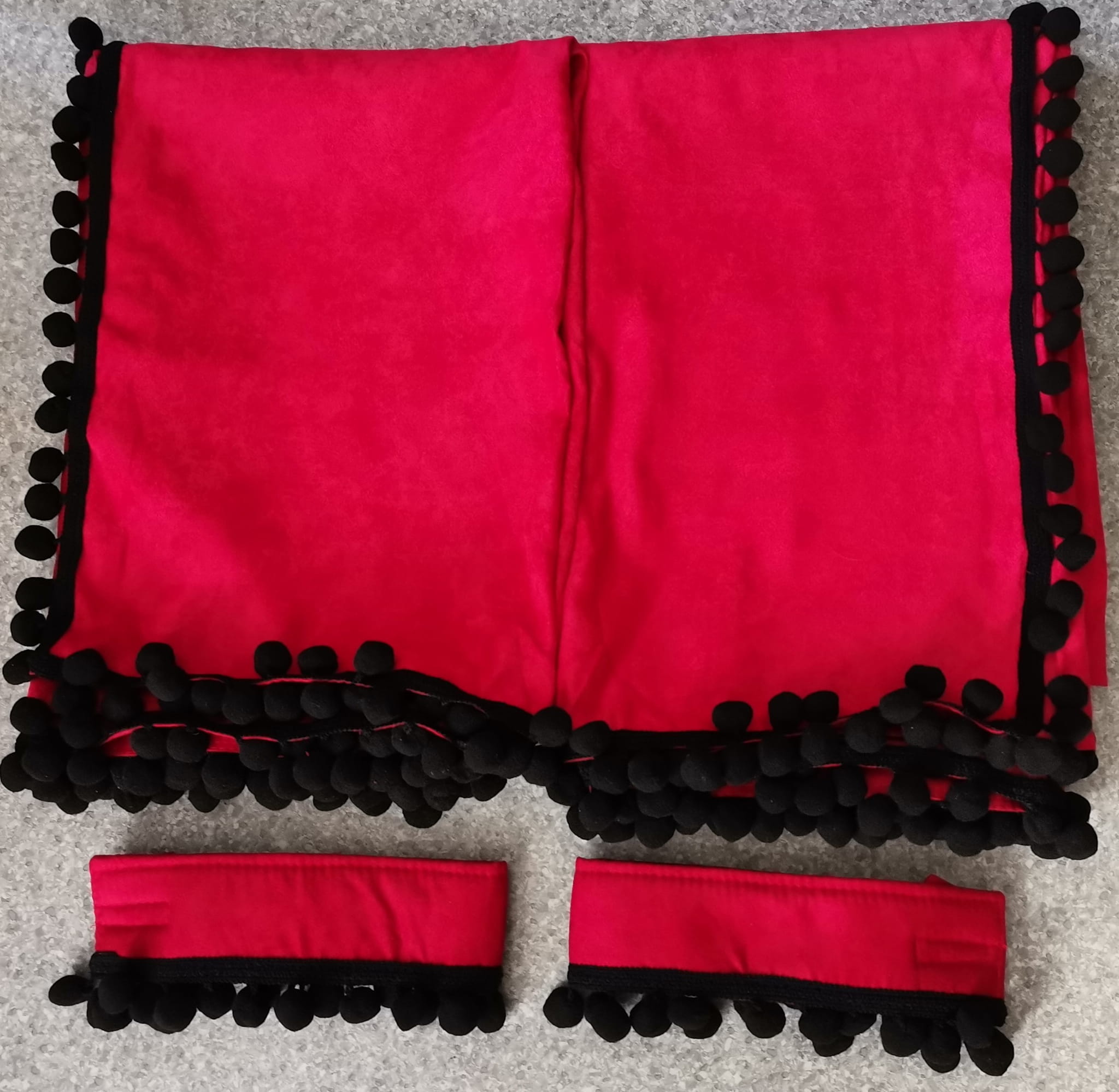 Firany przedstawione na zdjęciach wykonane są z wysokojakościowego pluszu w kolorze czerwonym (1 warstwa materiału). Zasłony obszyte są czarnymi frędzlami w kształcie kulek. Frędzlami obszyta jest część dolna i boczna każdej firany. Do każdej zasłony od strony środkowej wszyta jest taśma na założenie haczyków mocujących. Komplet zasłon nie zawiera haczyków mocujących (haczyki dostępne są osobno w sprzedaży w zależności od danej marki pojazdu).