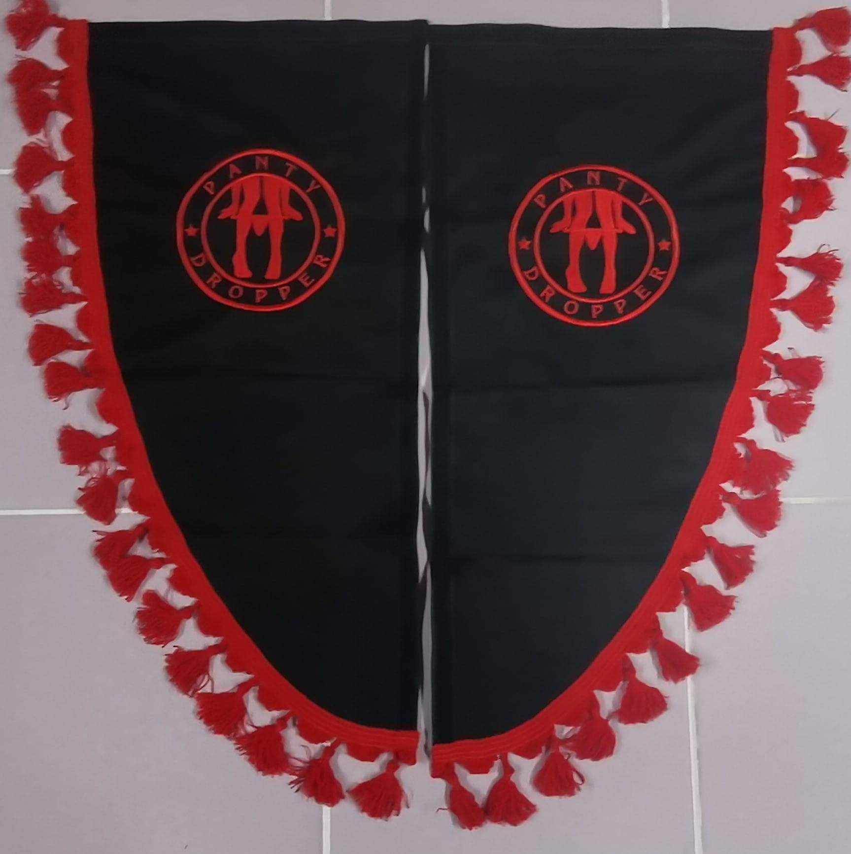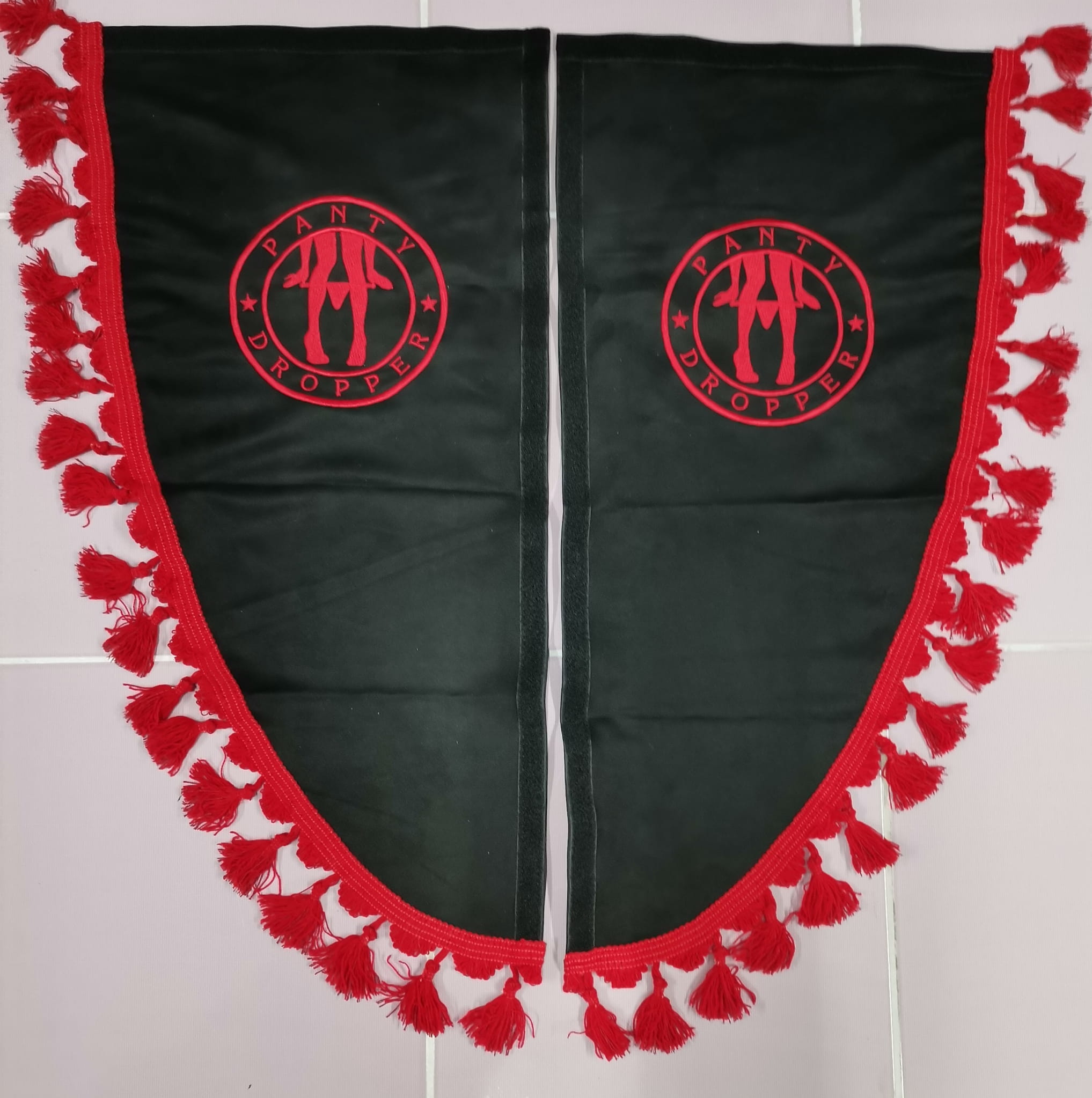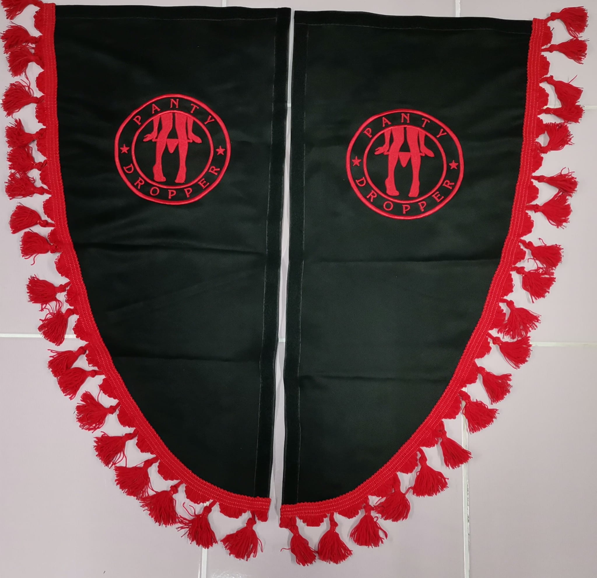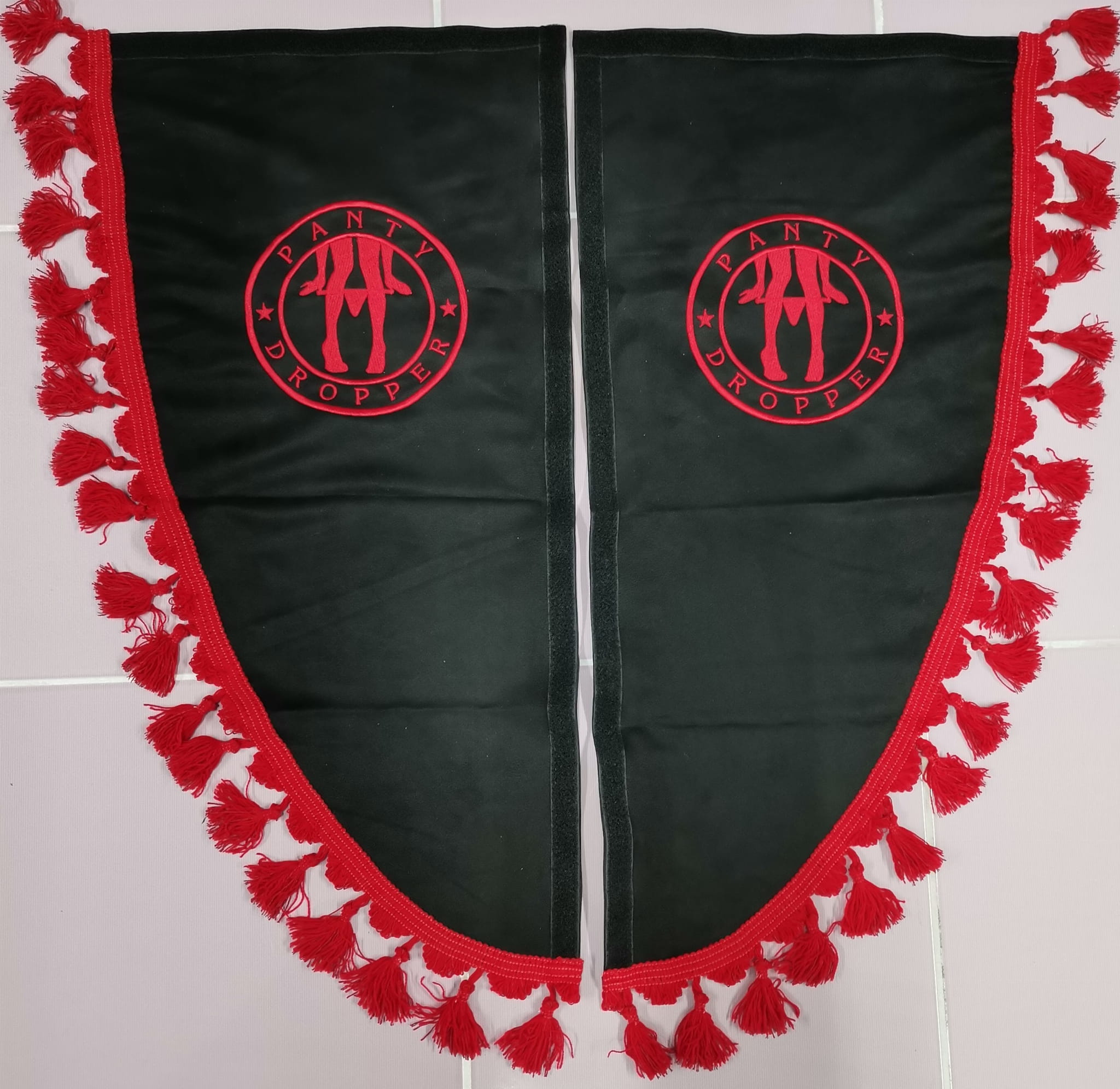 Zasłonki sa uniwersalne, w kształcie półksiężyców (trójkątów). Wykonane są z czarnego pluszu a wykończone frędzlami w kształcie dzwonków w kolorze czerwonym. Posiadają efektowny haft PANTY DROPPER w kolorze czerwonym.