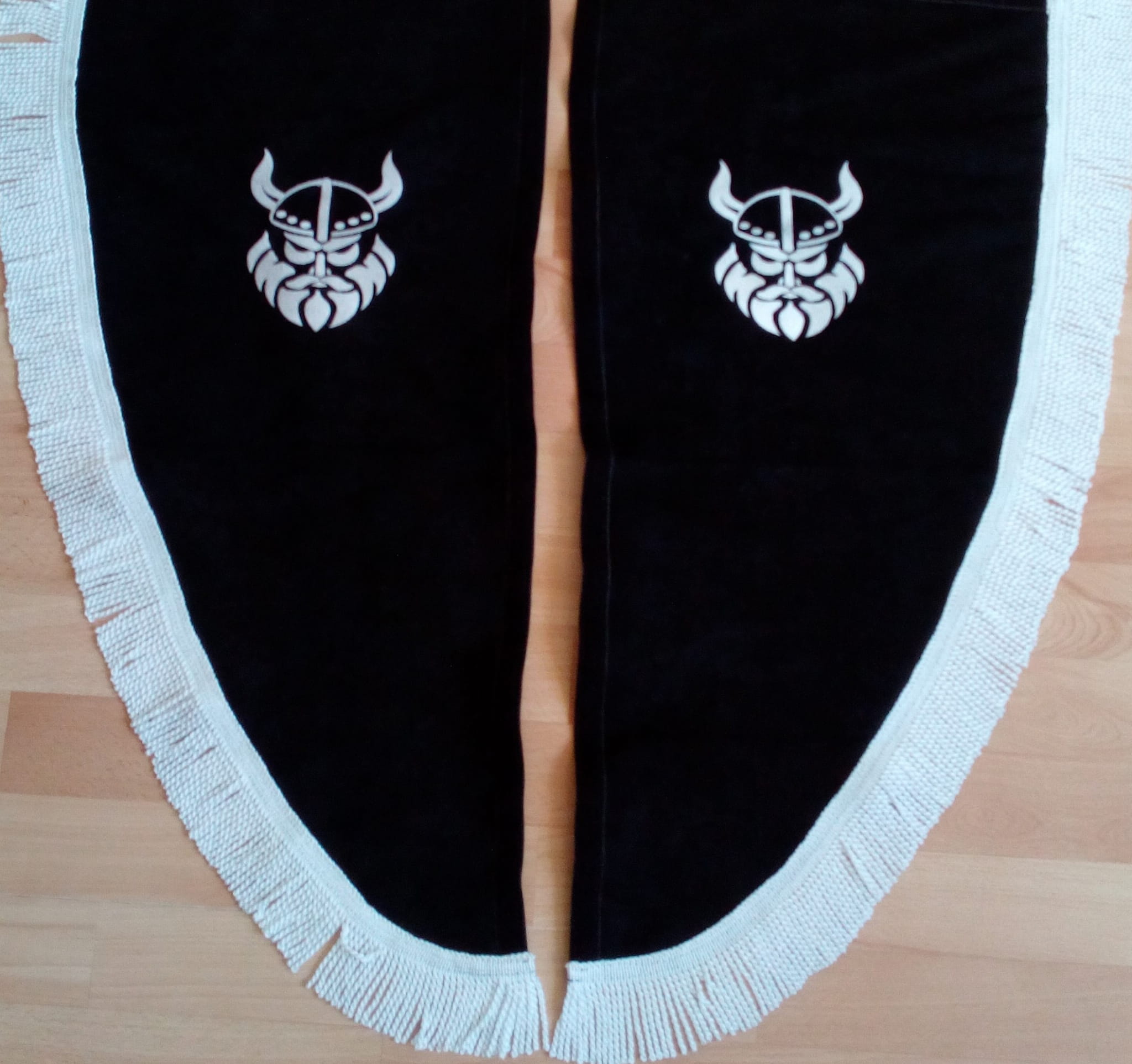 Zasłonki w kształcie półksiężyców (trójkątów) wykonane są z czarnego pluszu a wykończone frędzlami w kształcie dzwonków w kolorze białym. Posiadają efektowny haft WIKINGA w kolorze białym.