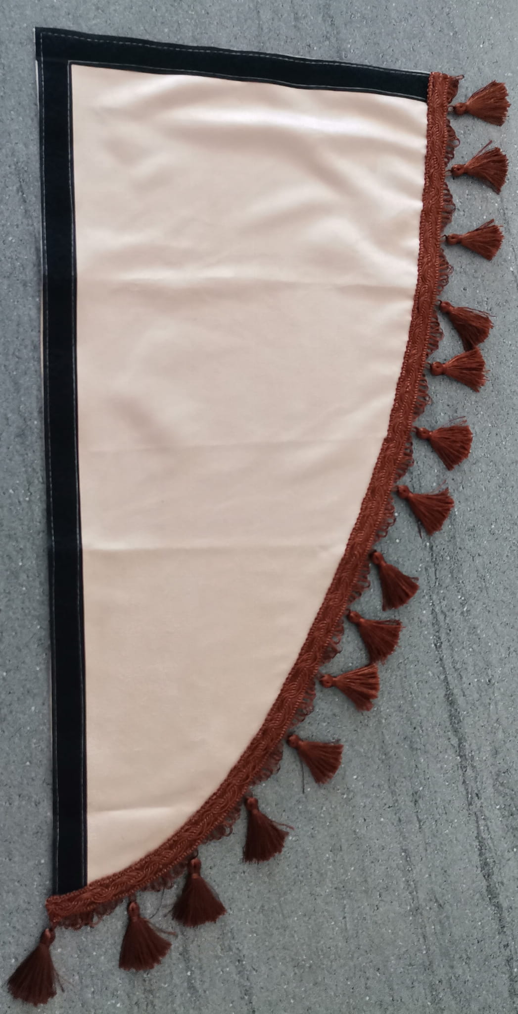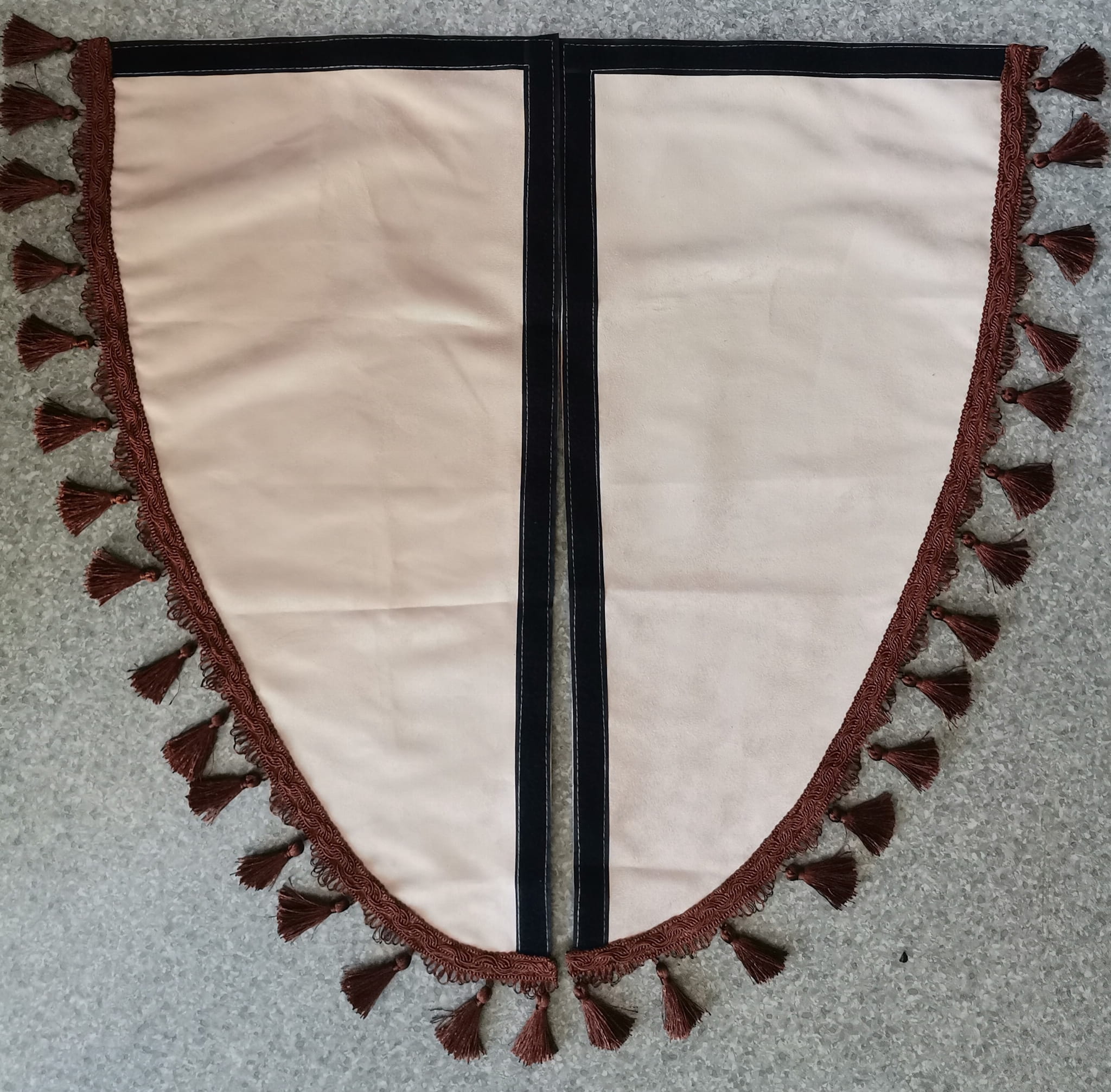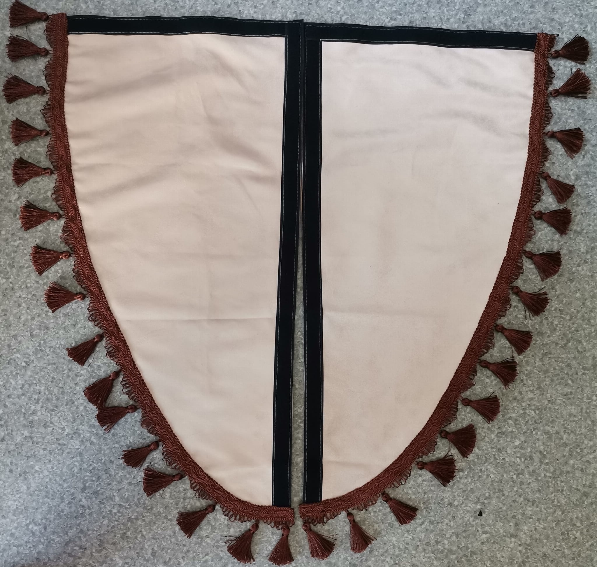 Zasłonki przedstawione na zdjeciach wykonane są z kremowego (beżowego) pluszu wykończonymi brązowymi frędzlami w kształcie dzwoneczków.