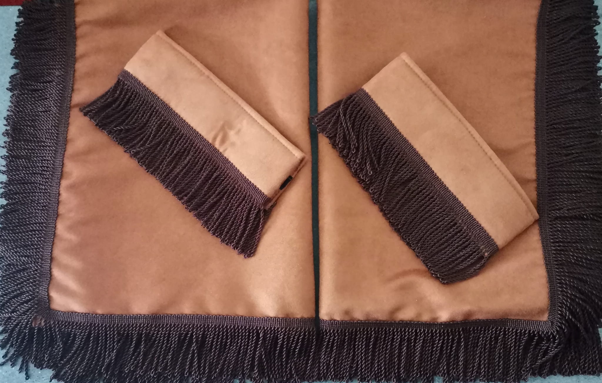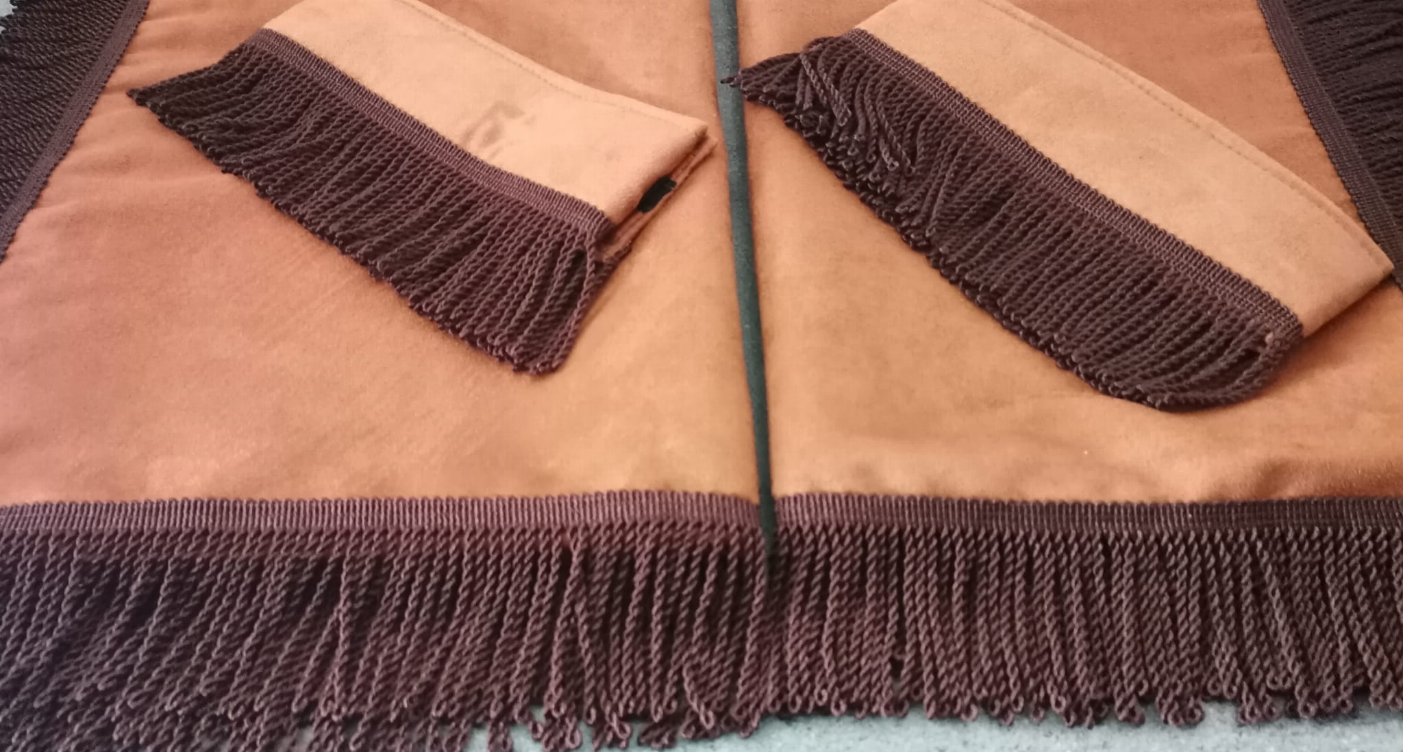 Zasłony obszyte są prostymi frędzlami w kolorze ciemno brązowym. Frędzlami obszyta jest część dolna i boczna każdej firany oraz ozdobne opaski spinające.