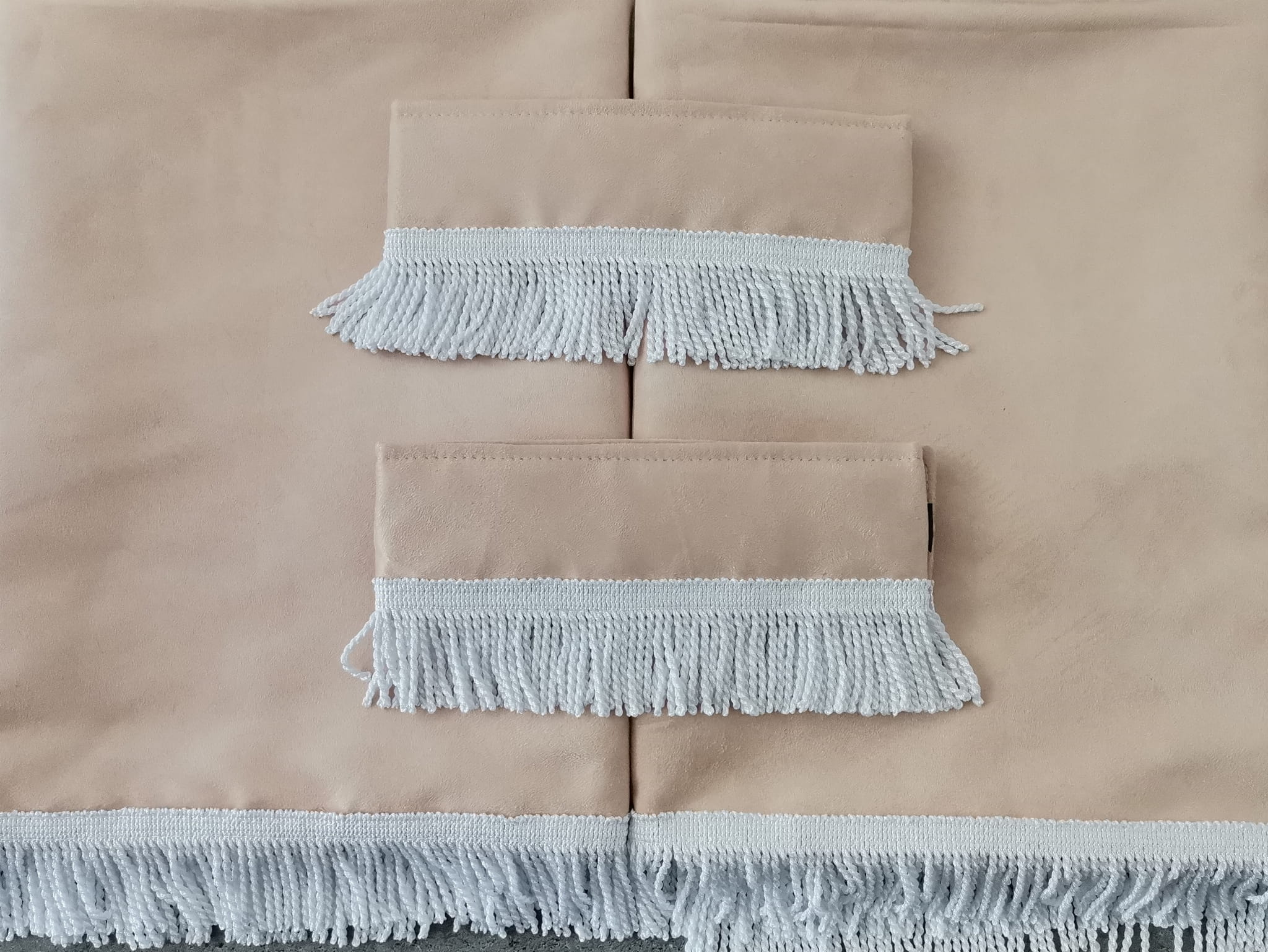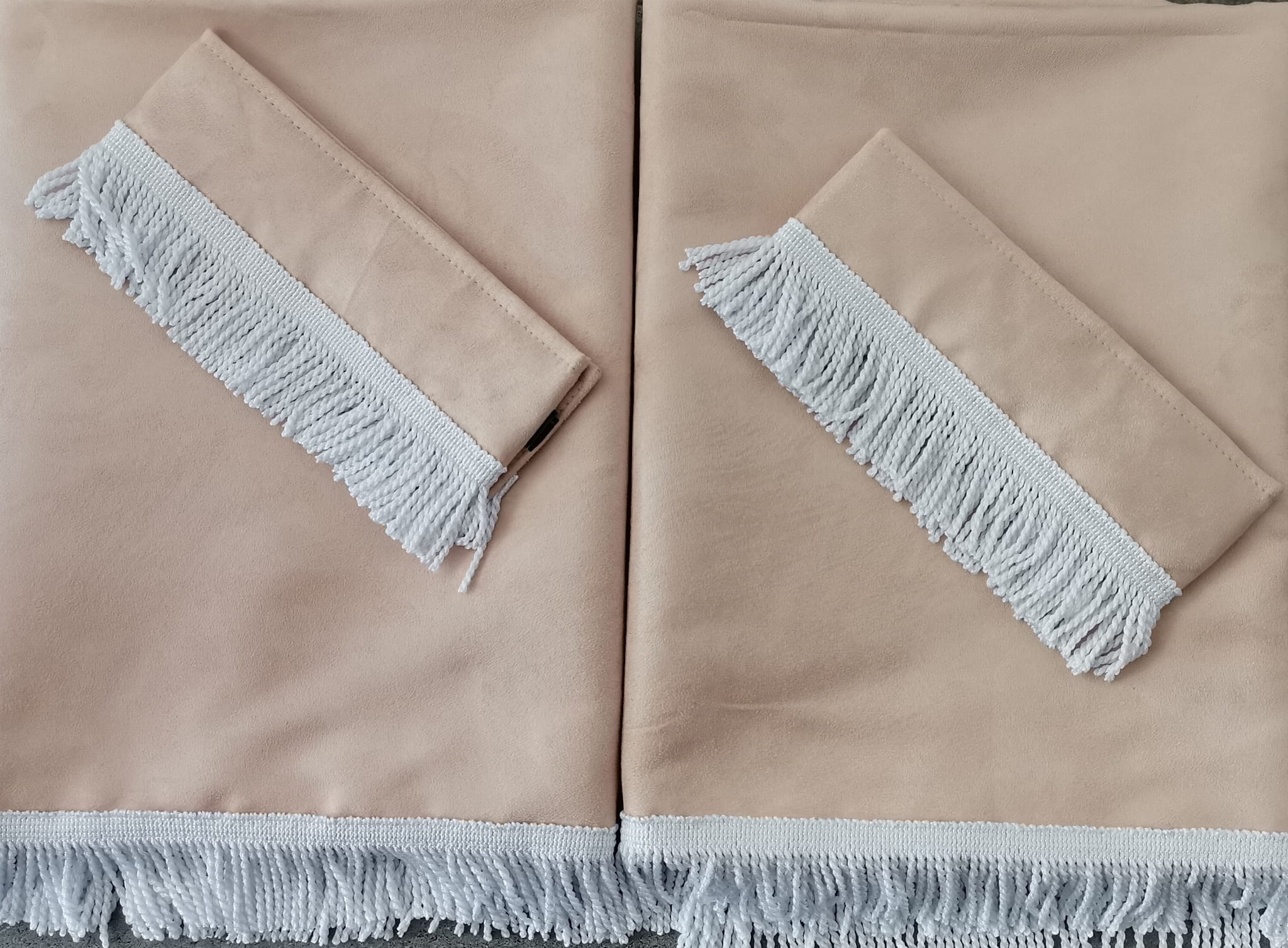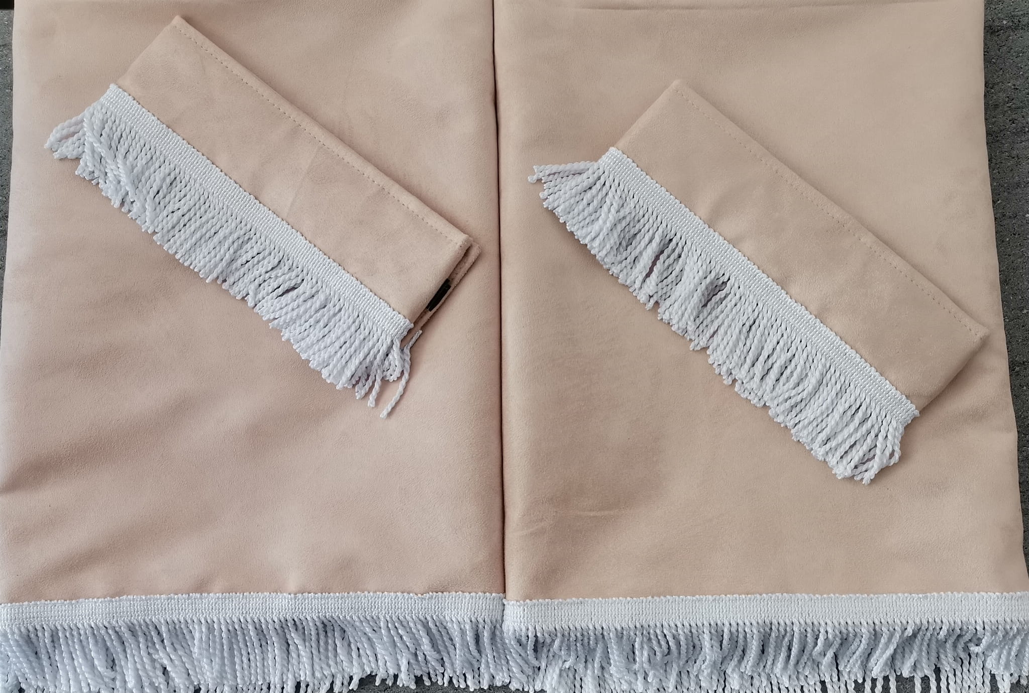 Firany przedstawione na zdjęciach wykonane są z wysokojakościowego pluszu w kolorze kremowym -beżowym (2 warstwy beżowego pluszu). Zasłony obszyte są prostymi frędzlami w kolorze białym. Frędzlami obszyta jest część dolna i boczna każdej firany.