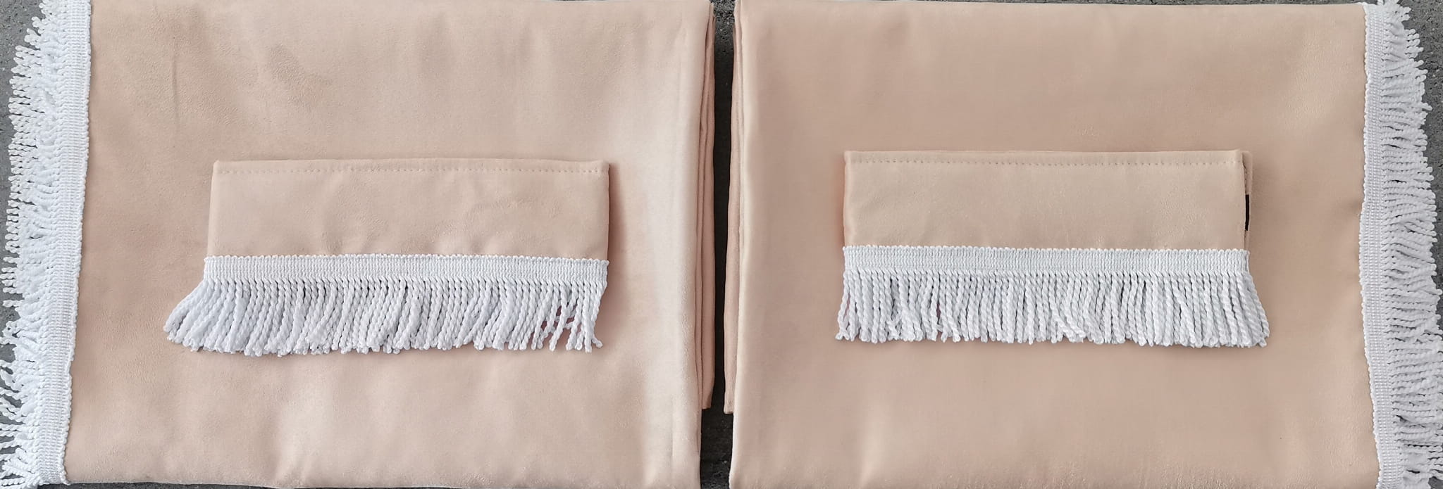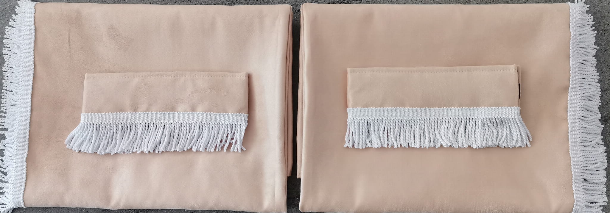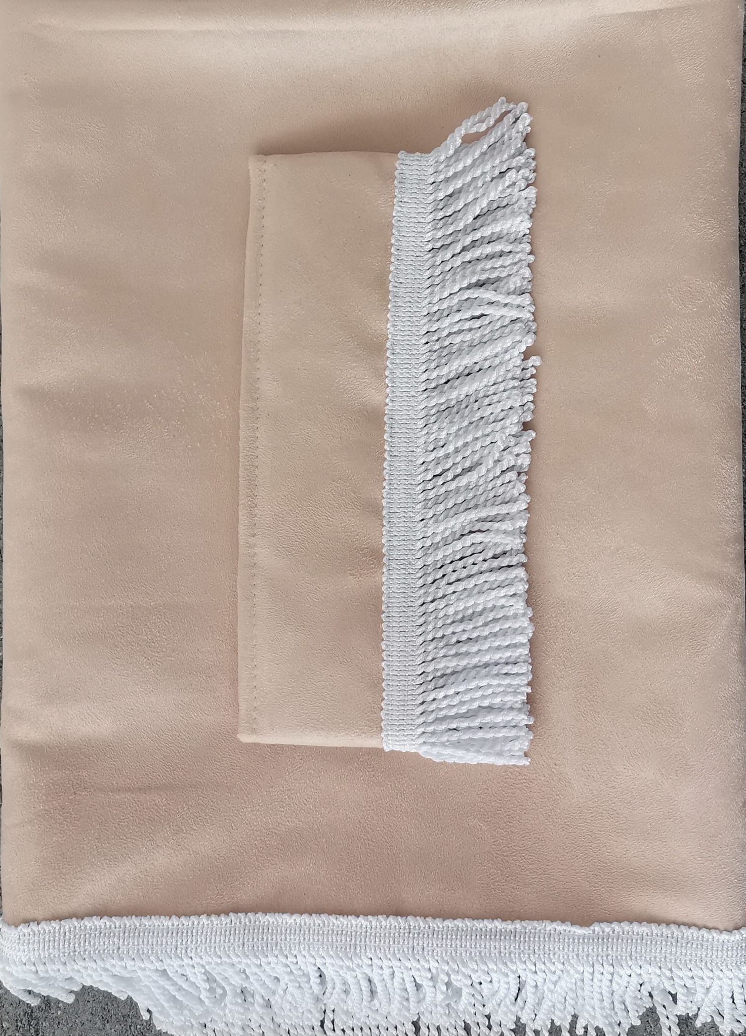 Firany przedstawione na zdjęciach wykonane są z wysokojakościowego pluszu w kolorze kremowym -beżowym (2 warstwy beżowego pluszu). Zasłony obszyte są prostymi frędzlami w kolorze białym. Frędzlami obszyta jest część dolna i boczna każdej firany.