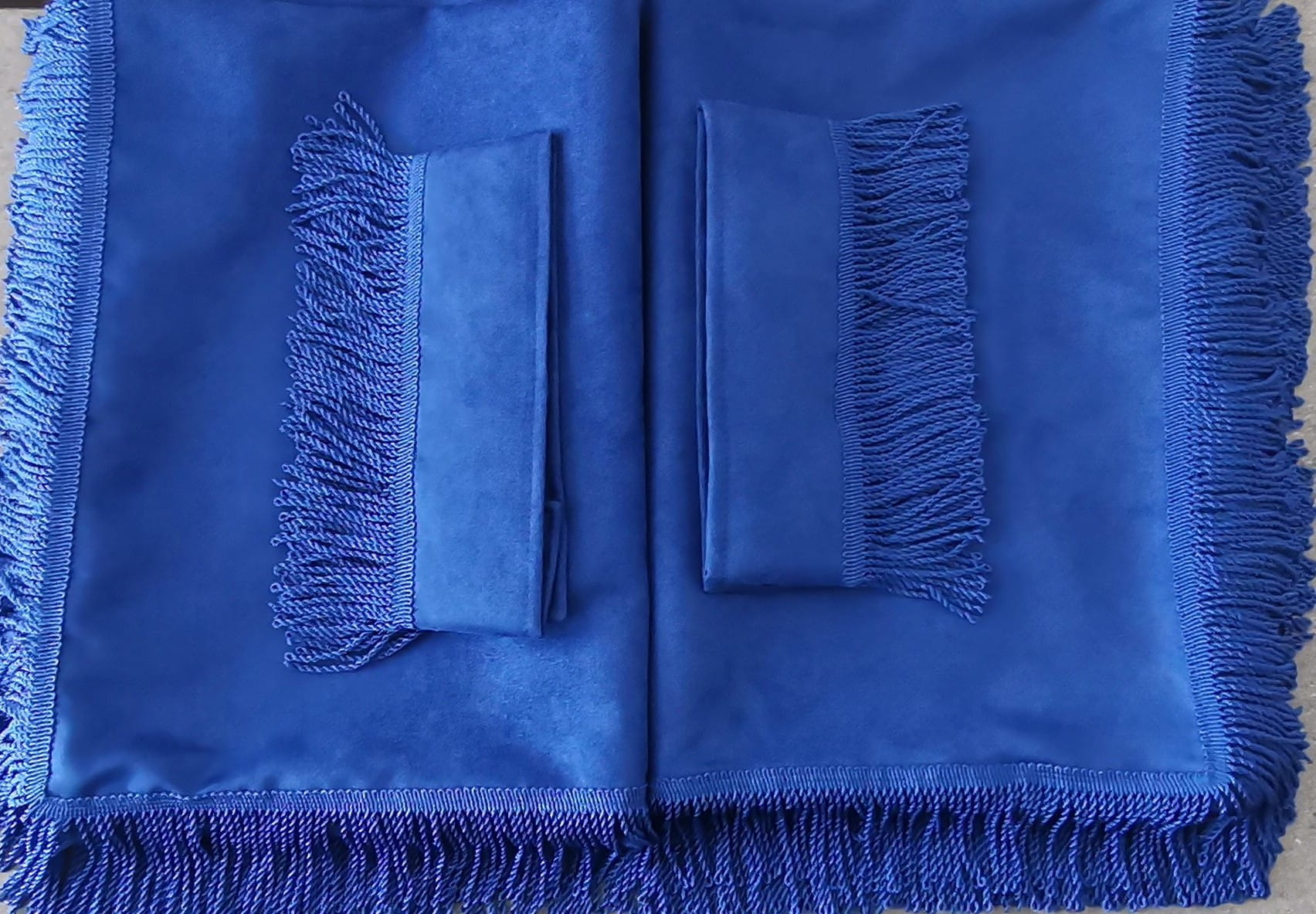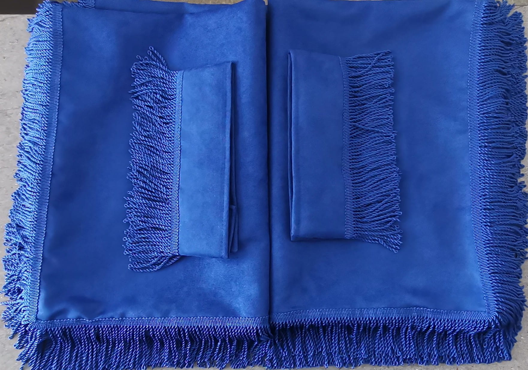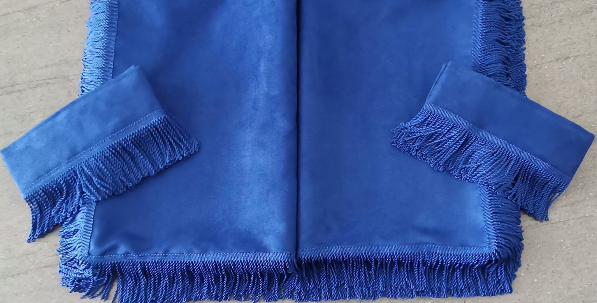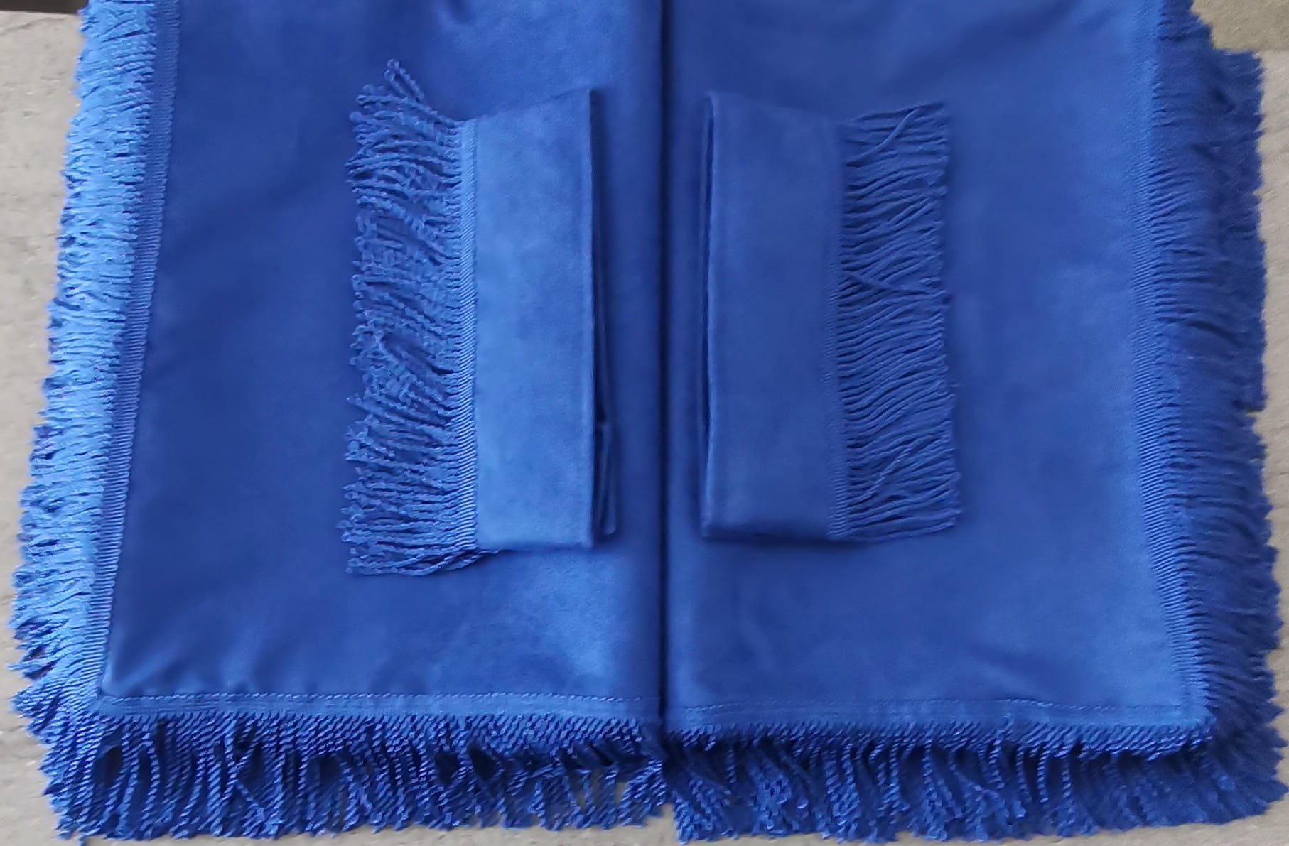 Firany przedstawione na zdjęciach wykonane są z wysokojakościowego pluszu w kolorze niebieskim (2 warstwy niebieskiego pluszu). Kolor zasłon jest taki sam z prawej i lewej strony. Całe zasłony obszyte są ozdobnymi frędzlami prostymi w kolorze niebieskim. Opaski spinające obszyte są ozdobnymi frędzlami prostymi w kolorze niebieskim.