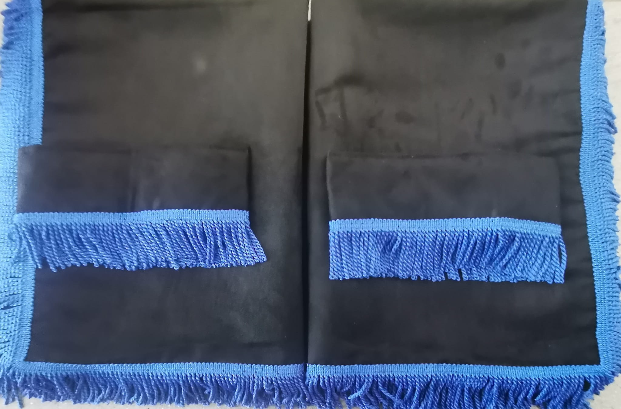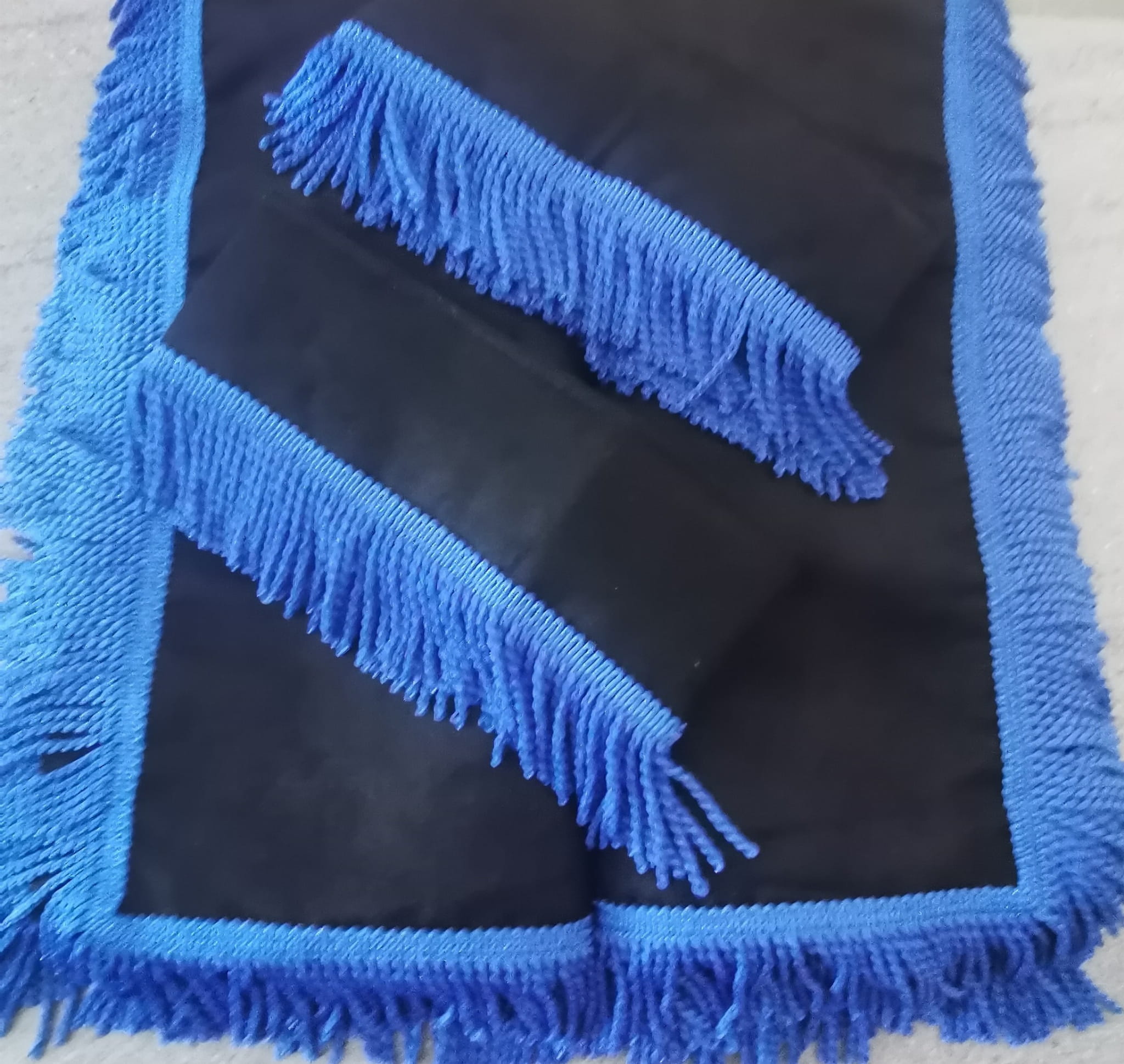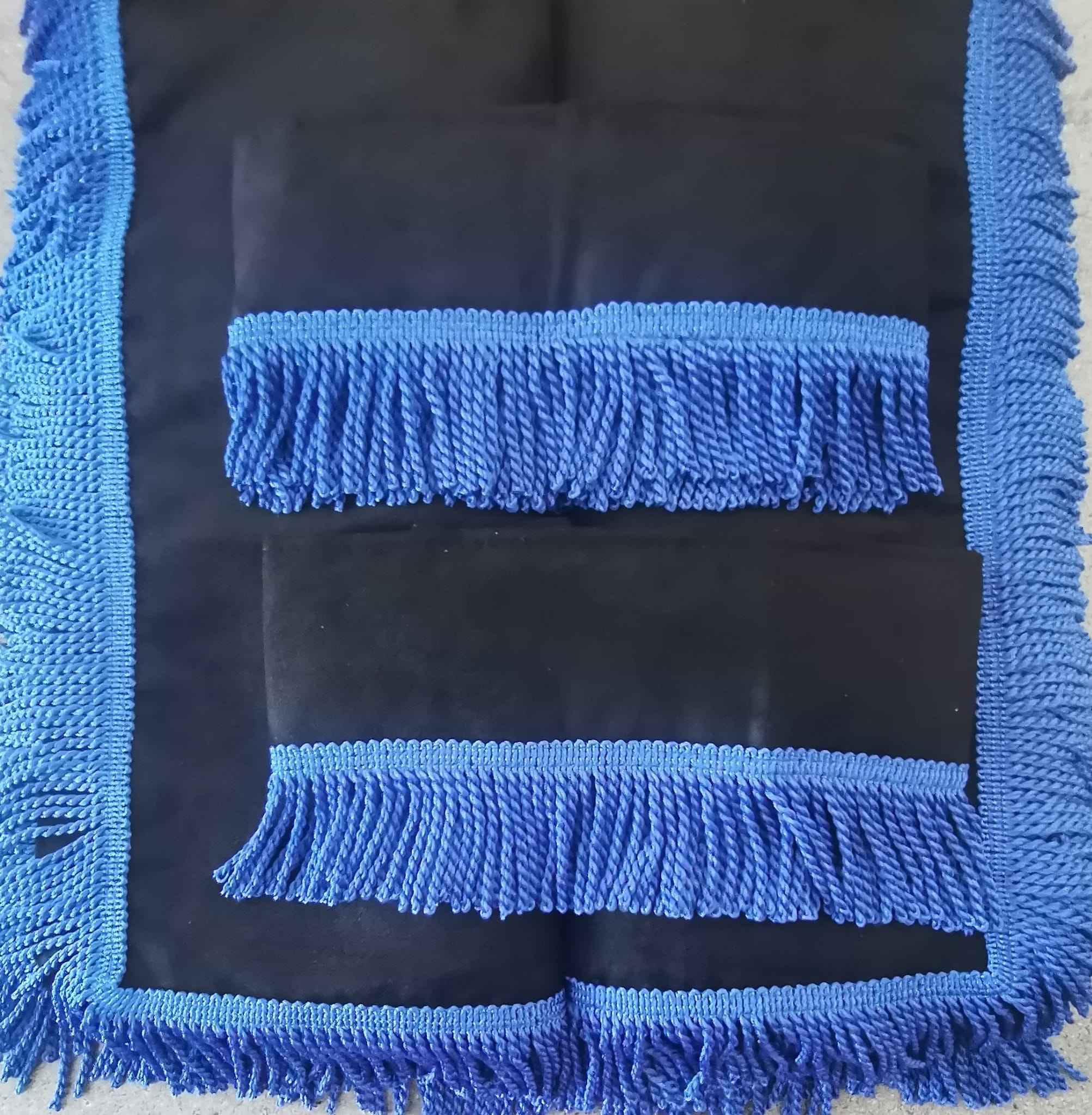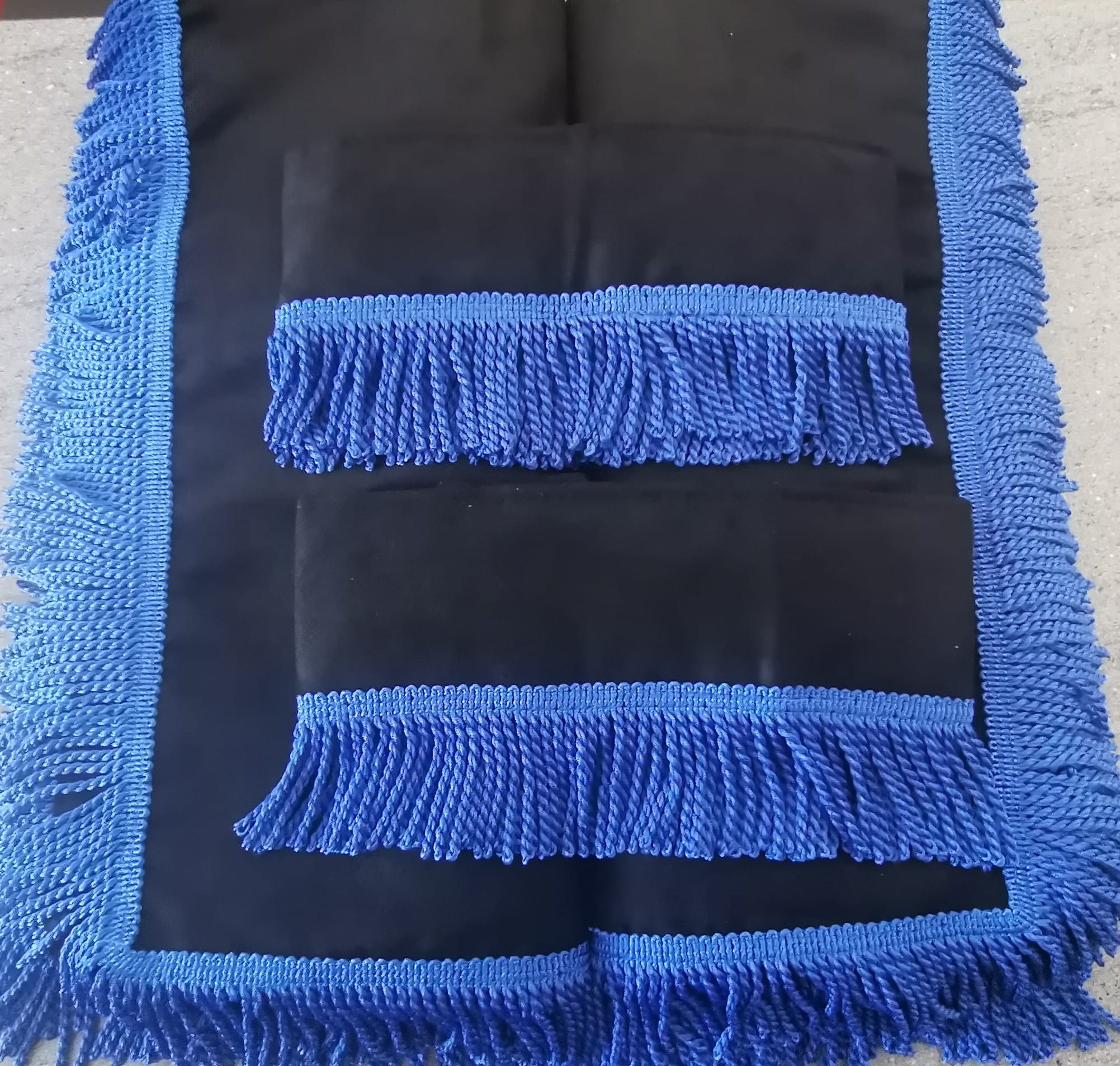 Zasłony obszyte są prostymi frędzlami w kolorze niebieskim. Frędzlami obszyta jest część dolna i boczna każdej firany oraz ozdobne opaski mocujące.