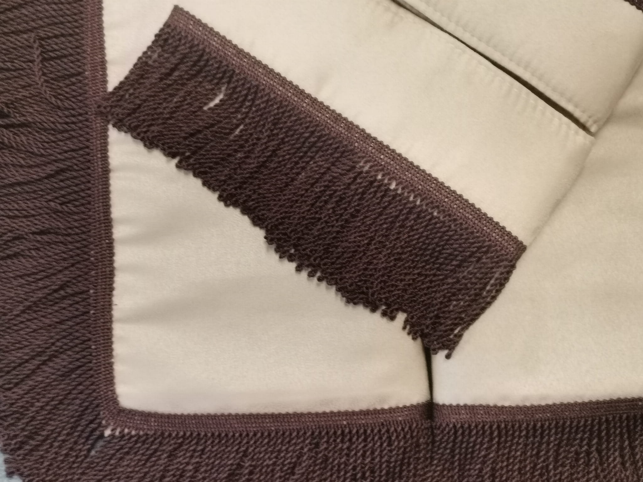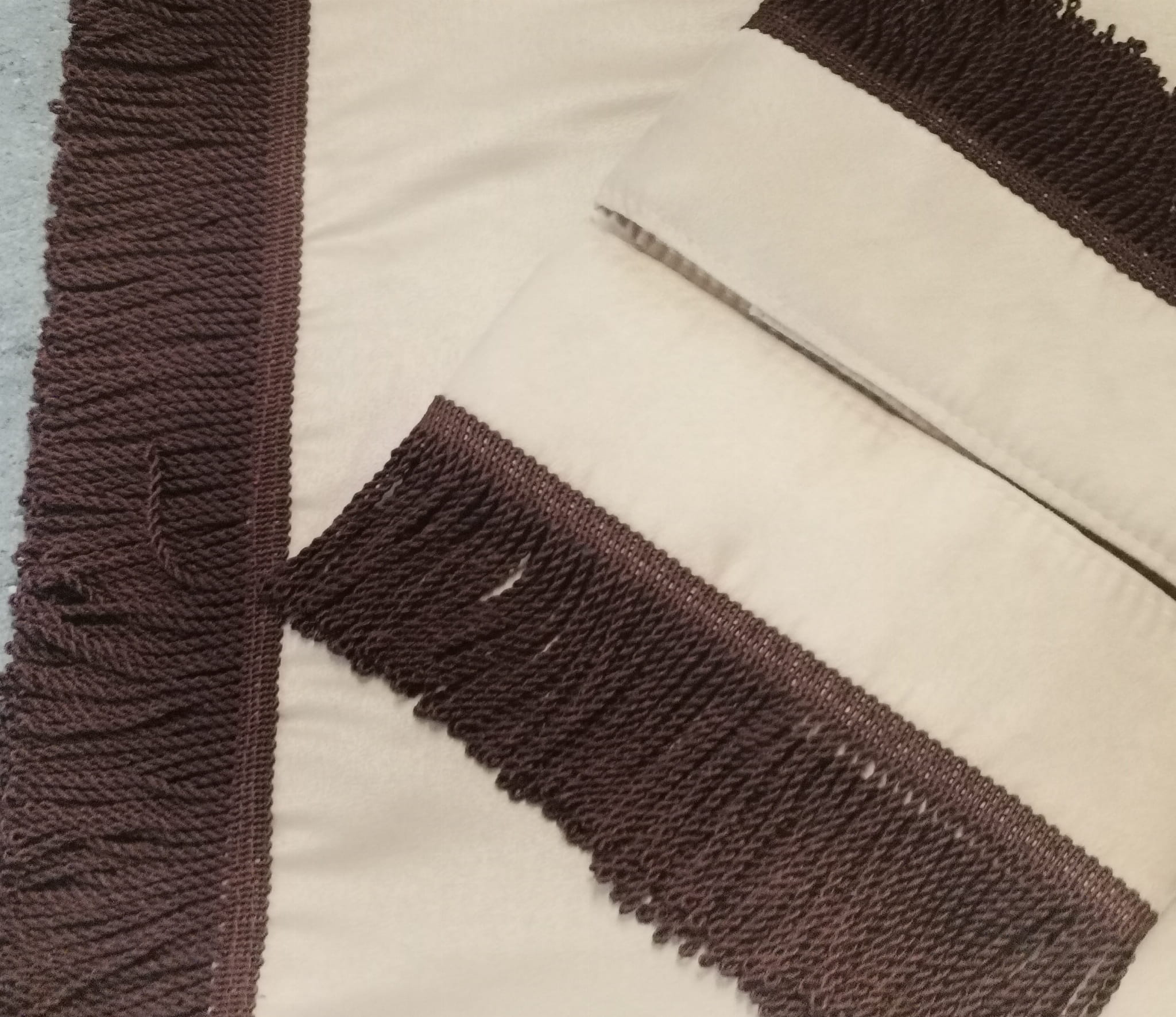 Firany przedstawione na zdjęciach wykonane są z wysokojakościowego pluszu w kolorze kremowym / beżowym (2 warstwy beżowego pluszu). Zasłony obszyte są prostymi frędzlami w kolorze ciemno brązowym. Frędzlami obszyta jest część dolna i boczna każdej firany.