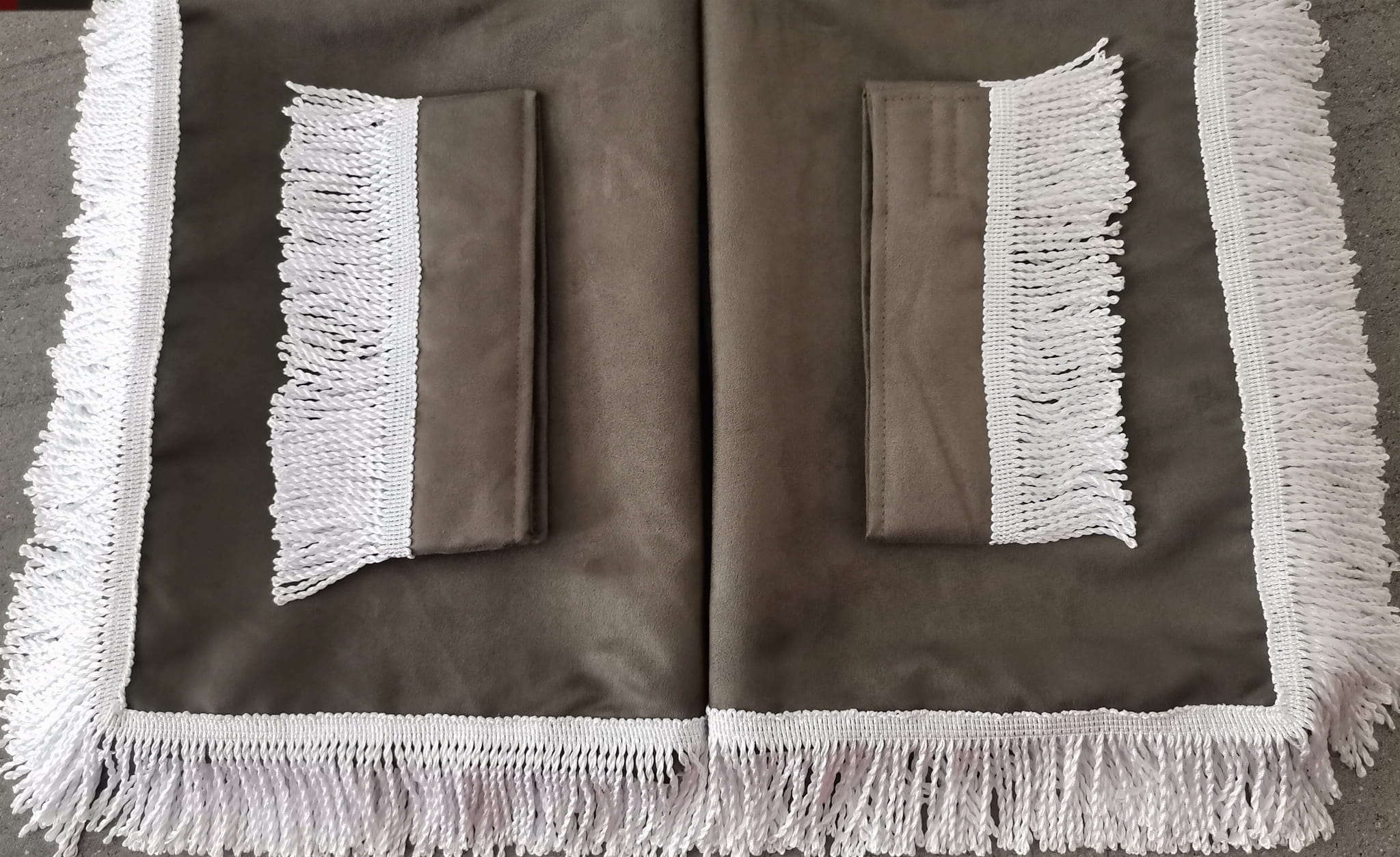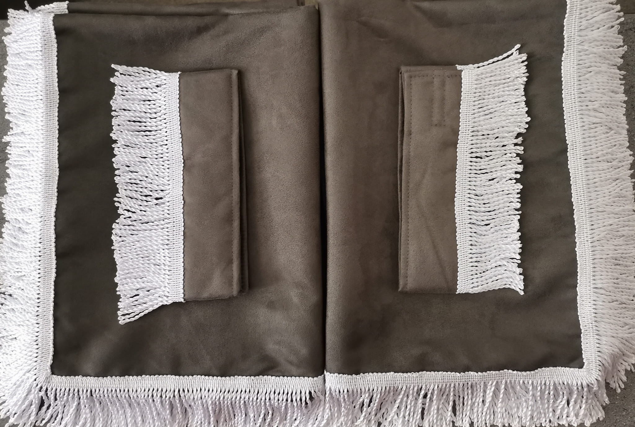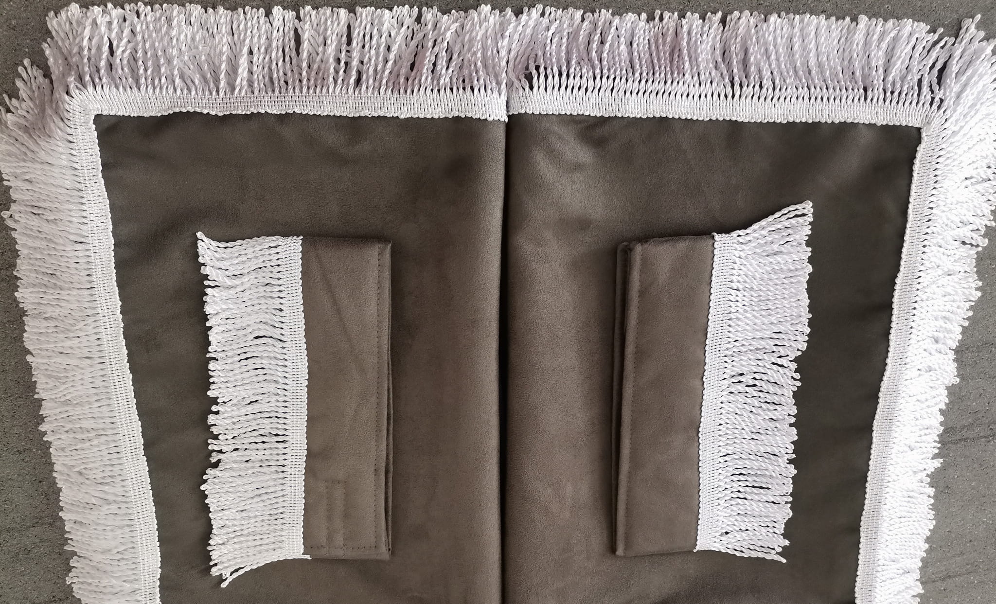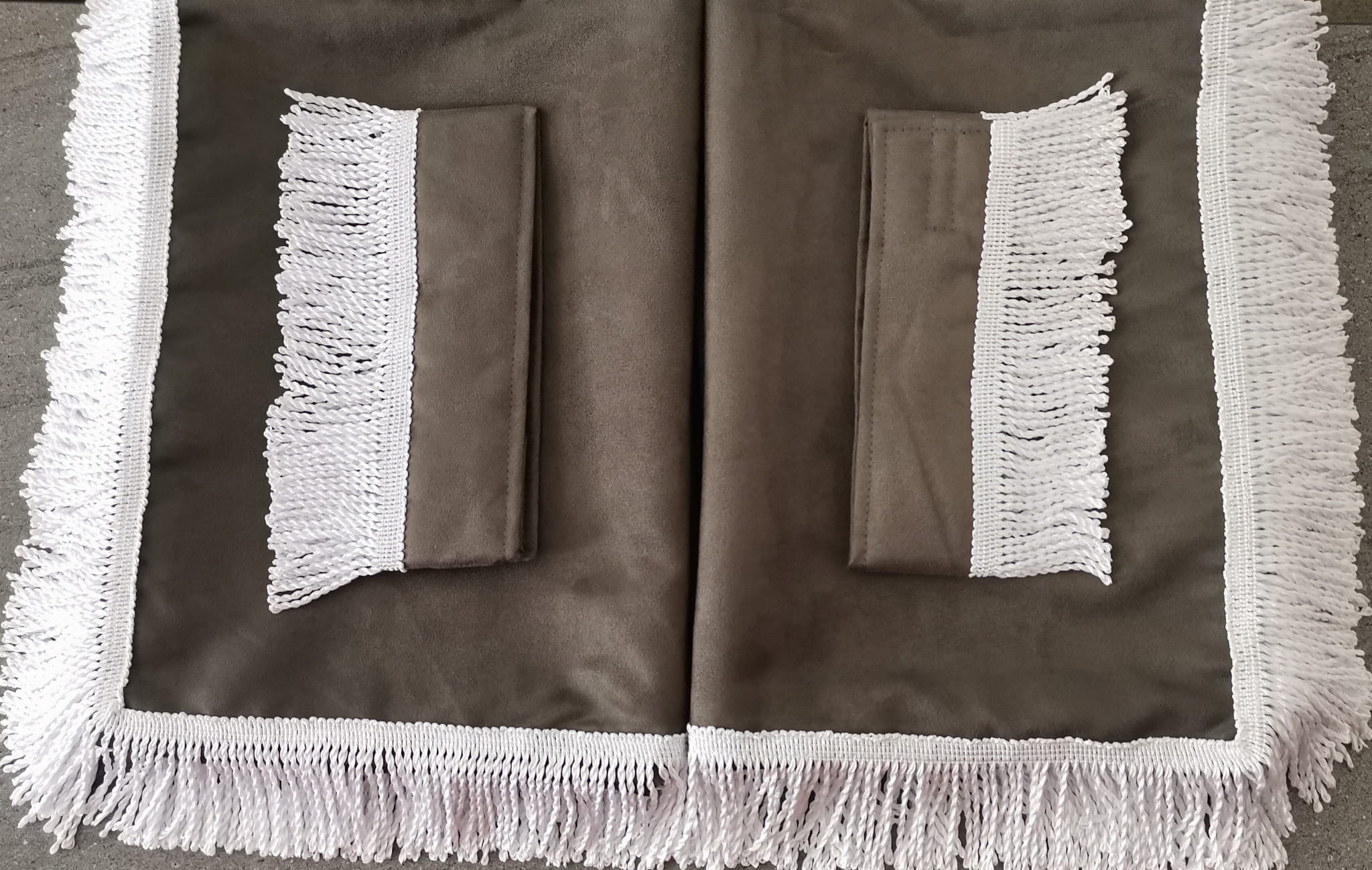 Firany przedstawione na zdjęciach wykonane są z wysokojakościowego ciemno szarego pluszu (2 warstwy ciemno szarego pluszu). Każda zasłona ma taki sam kolor zarówno z prawej, jak i lewej strony.