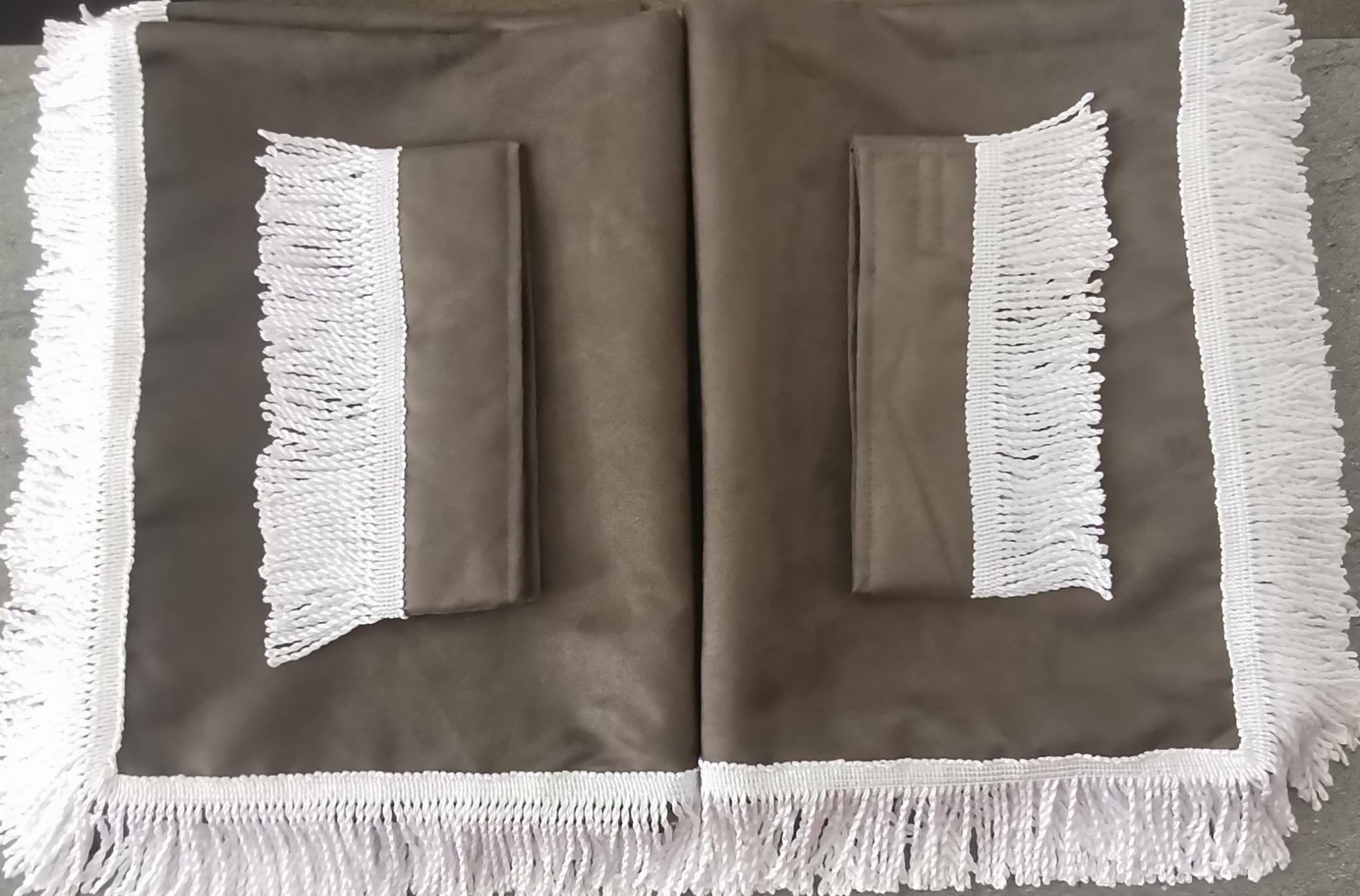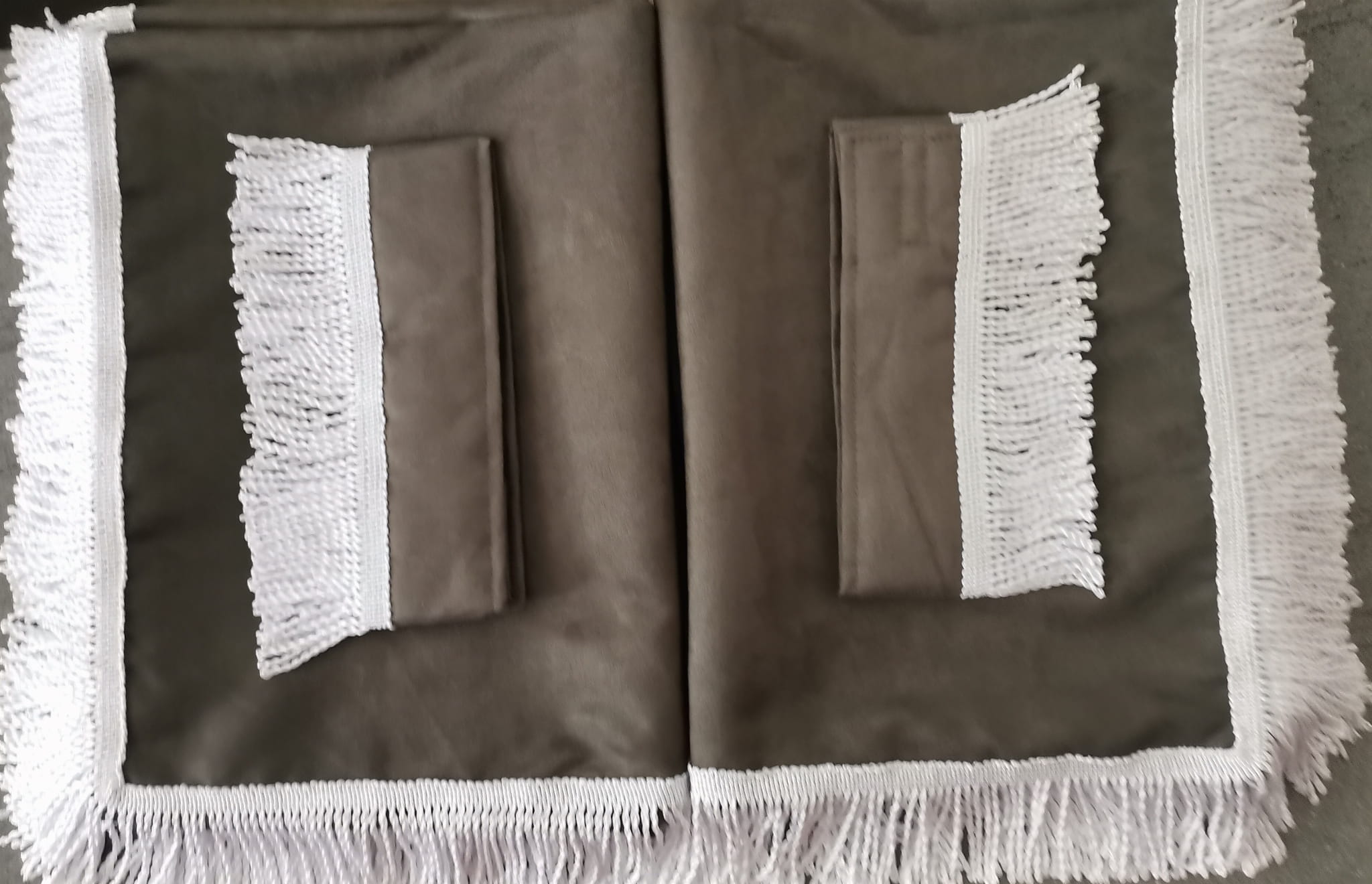 Zasłony obszyte są prostymi frędzlami prostymi w kolorze białym. Frędzlami obszyta jest część dolna i boczna każdej firany oraz ozdobne opaski mocujące.