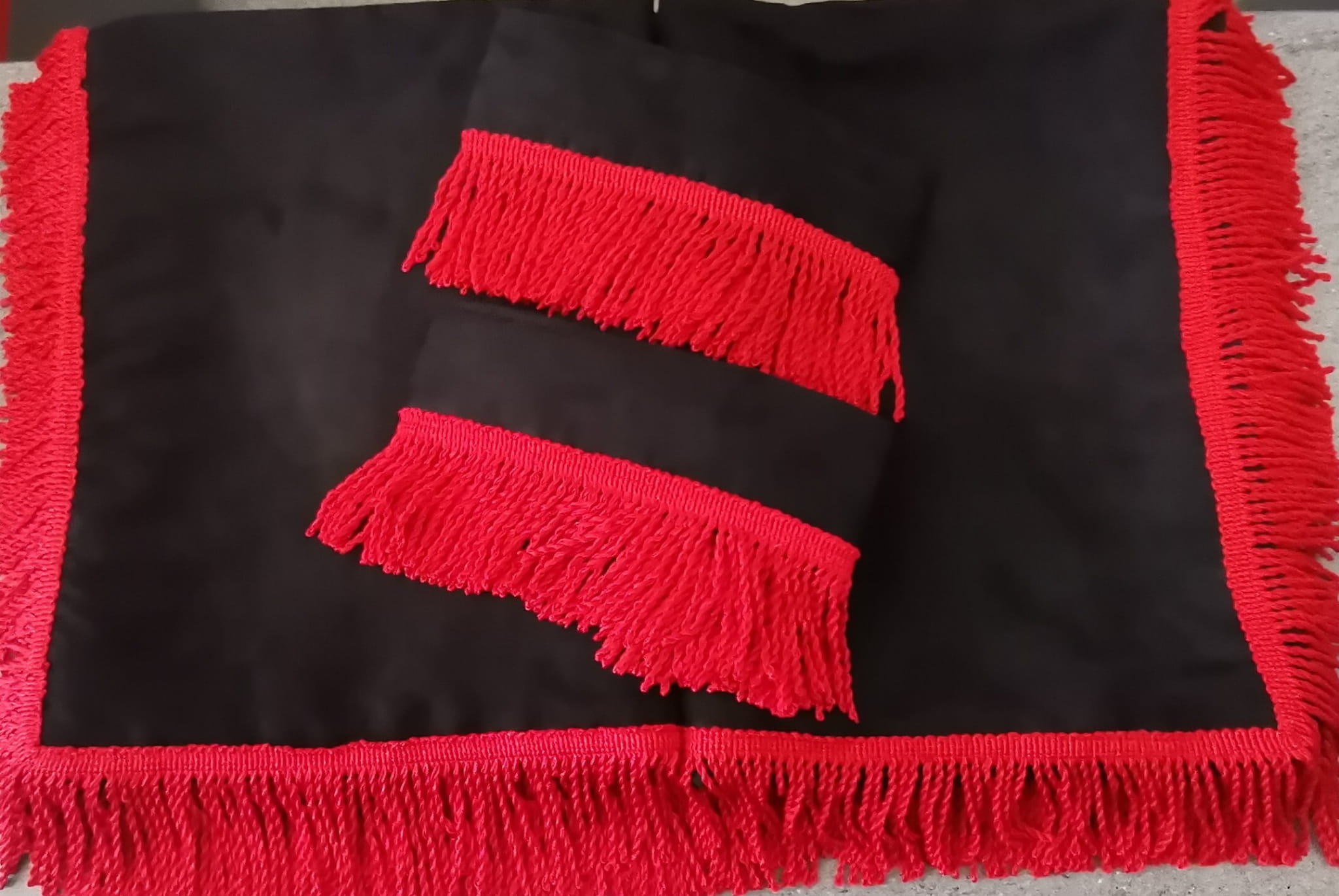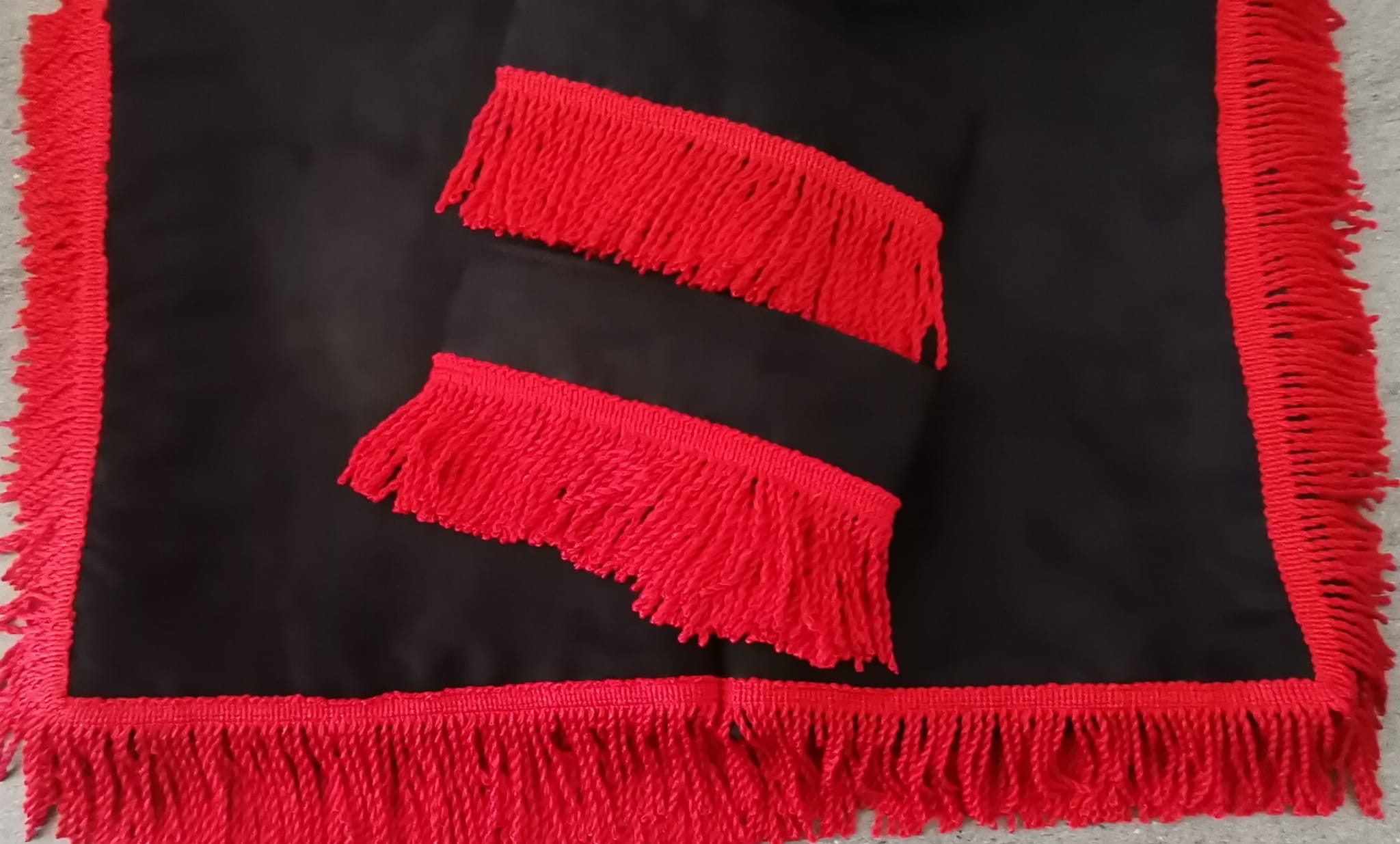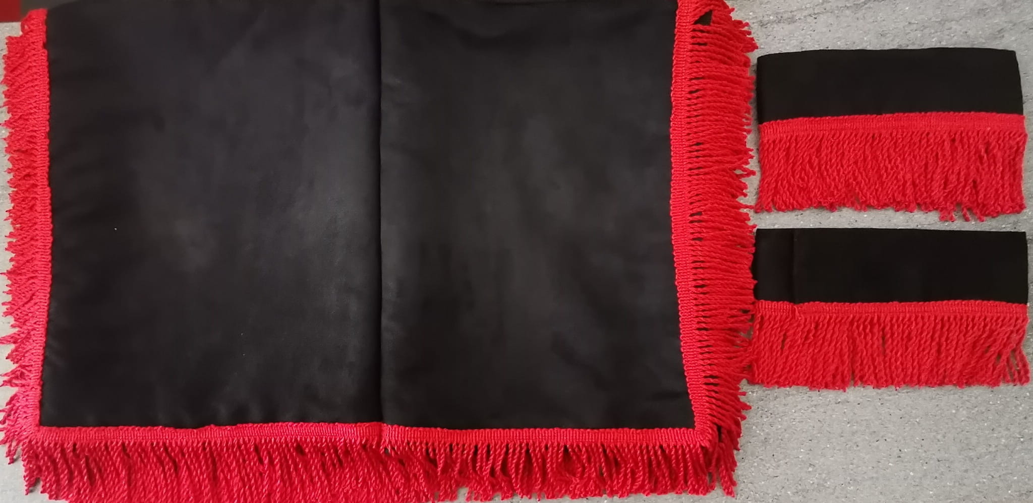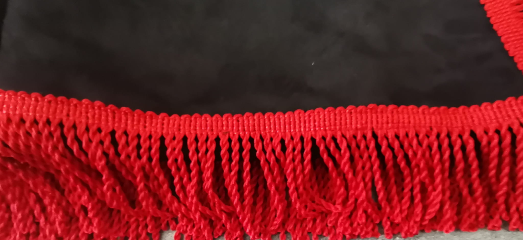 Zasłony obszyte są prostymi frędzlami prostymi w kolorze czerwonym. Frędzlami obszyta jest część dolna i boczna każdej firany oraz ozdobne opaski mocujące.